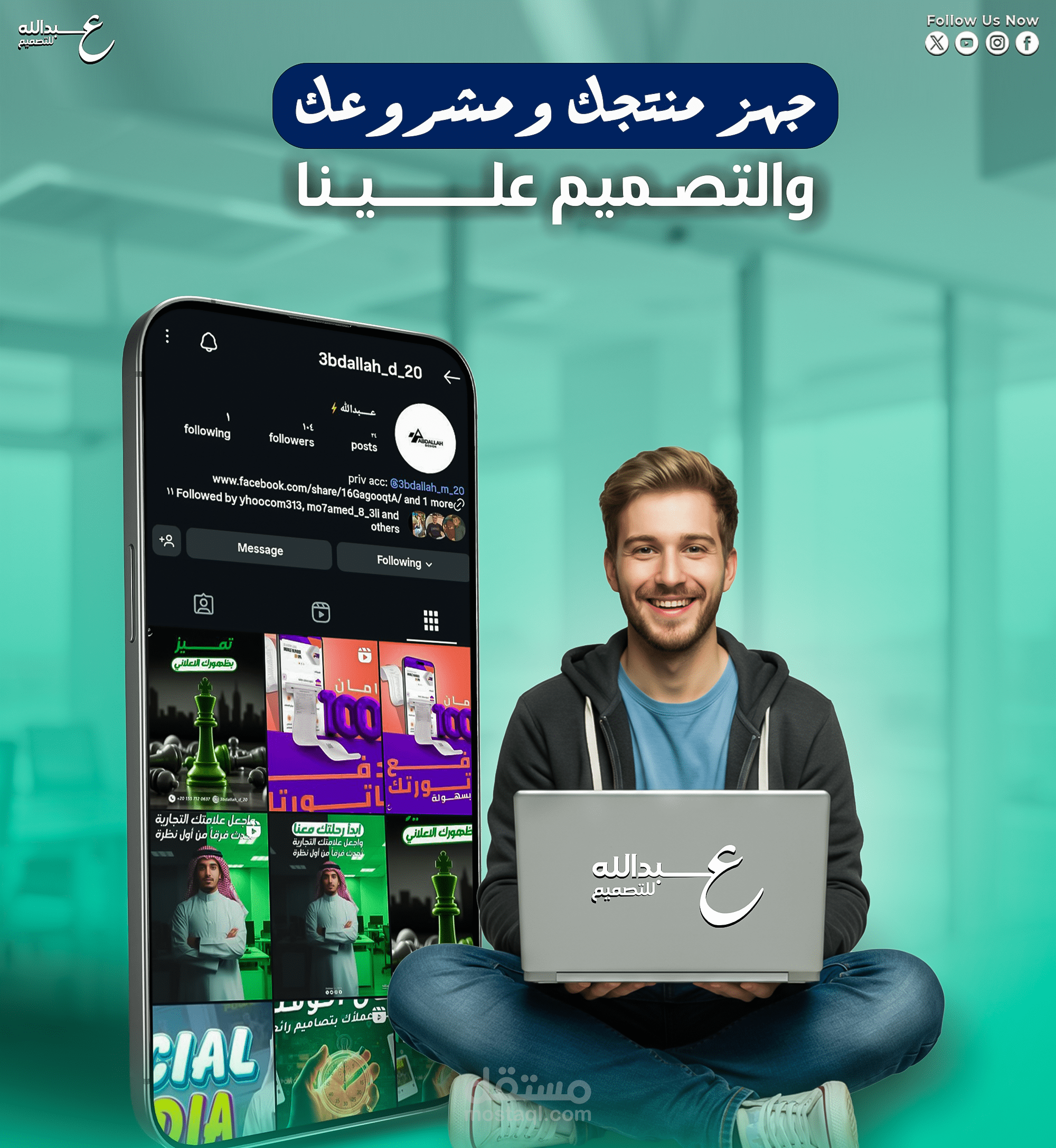 تصاميم سوشيال ميديا متنوعة تشمل بوستات وإعلانات ومنشورات احترافية مناسبة لفيسبوك وإنستجرام وغيرها.