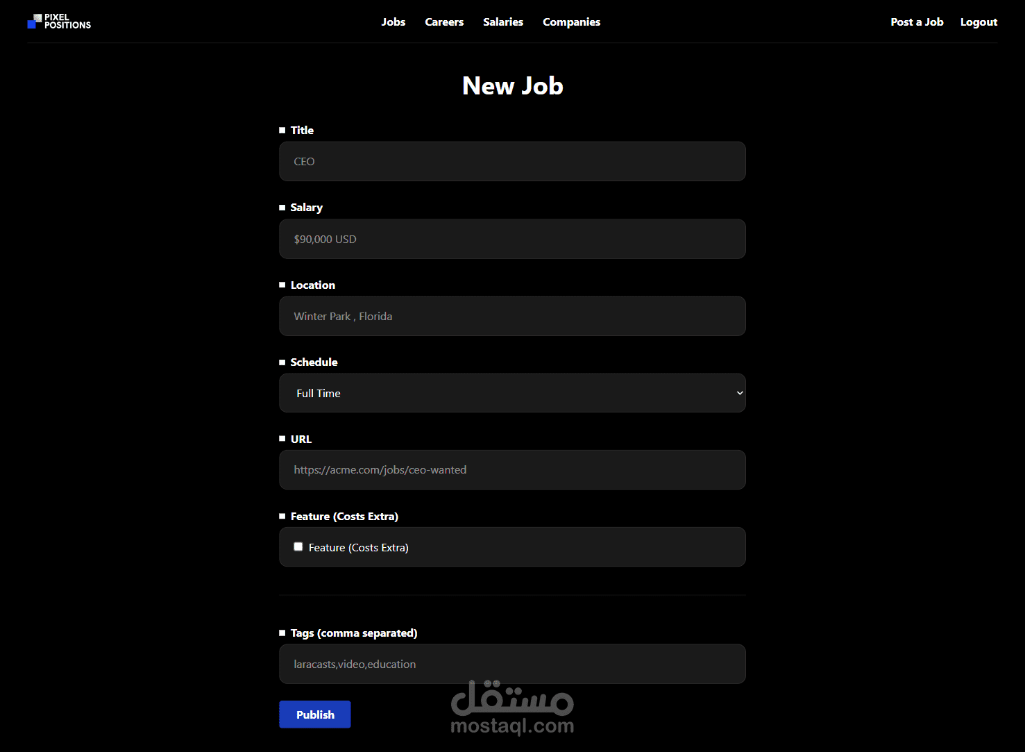 Pixel Positions – تطبيق لوحة وظائف قائم على Laravel يسمح للمستخدمين بإضافة وإدارة قوائم الوظائف، ويدعم التصفية القائمة على Tags، ويتميز بواجهة سهلة الاستخدام.
