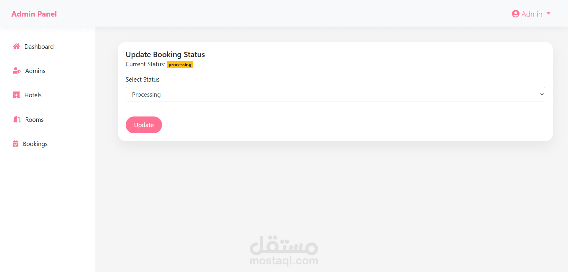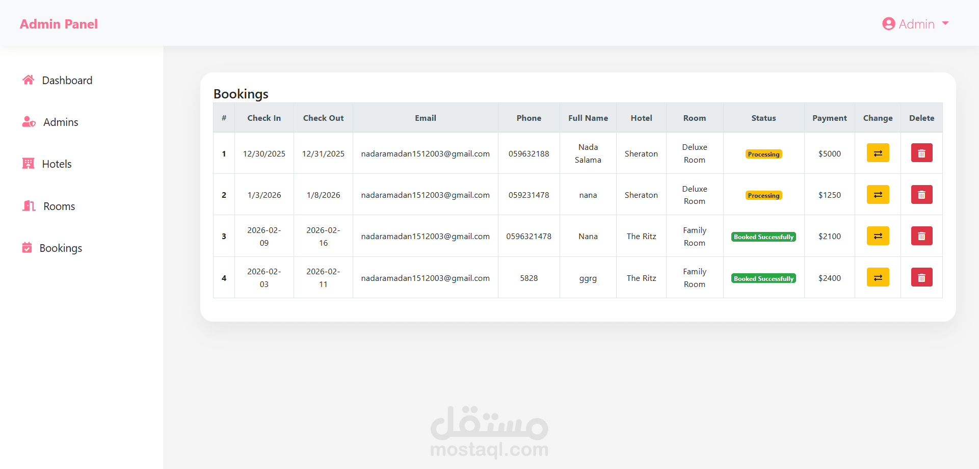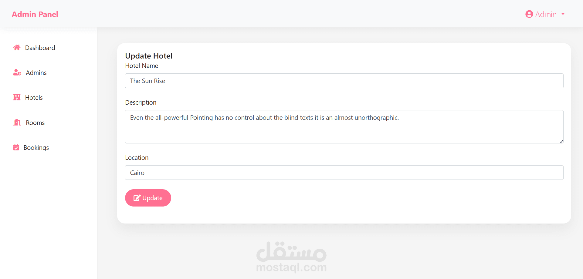 نظام إدارة فنادق حديث مبنيّ باستخدام Laravel، يتميز بلوحة تحكم إدارية متجاوبة تتيح لك إدارة الفنادق والغرف والحجوزات، والتعامل مع المستخدمين الإداريين، وتحديث حالات الحجوزات. يتضمن النظام عمليات CRUD للفنادق والغرف مع الصور والتفاصيل، ونظام مصادقة آمن، وواجهة مستخدم سلسة وسهلة الاستخدام، مما يجعله مثاليًا لمشاريع حجز الفنادق، ولوحات التحكم الإدارية، أو حلول إدارة الفنادق المخصصة.