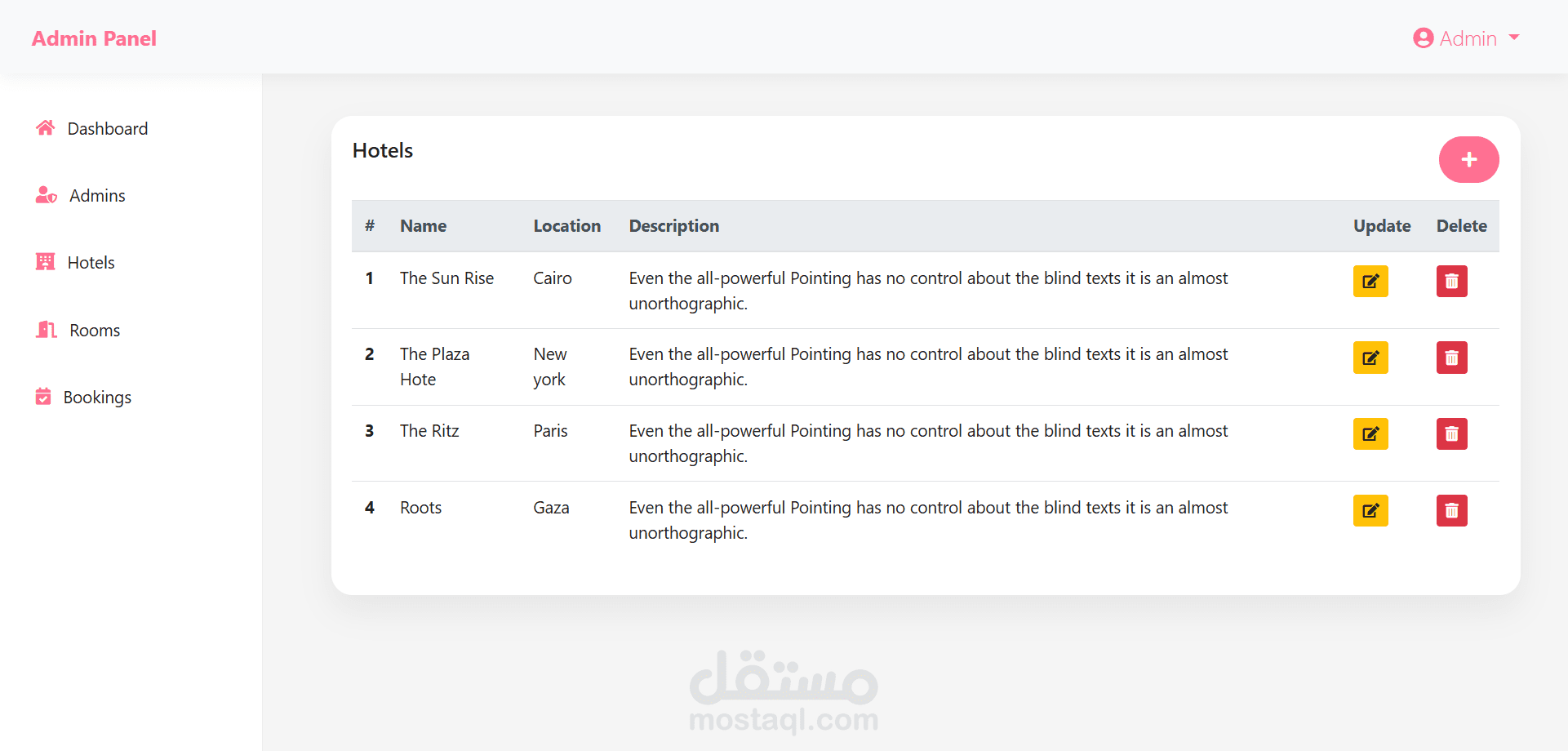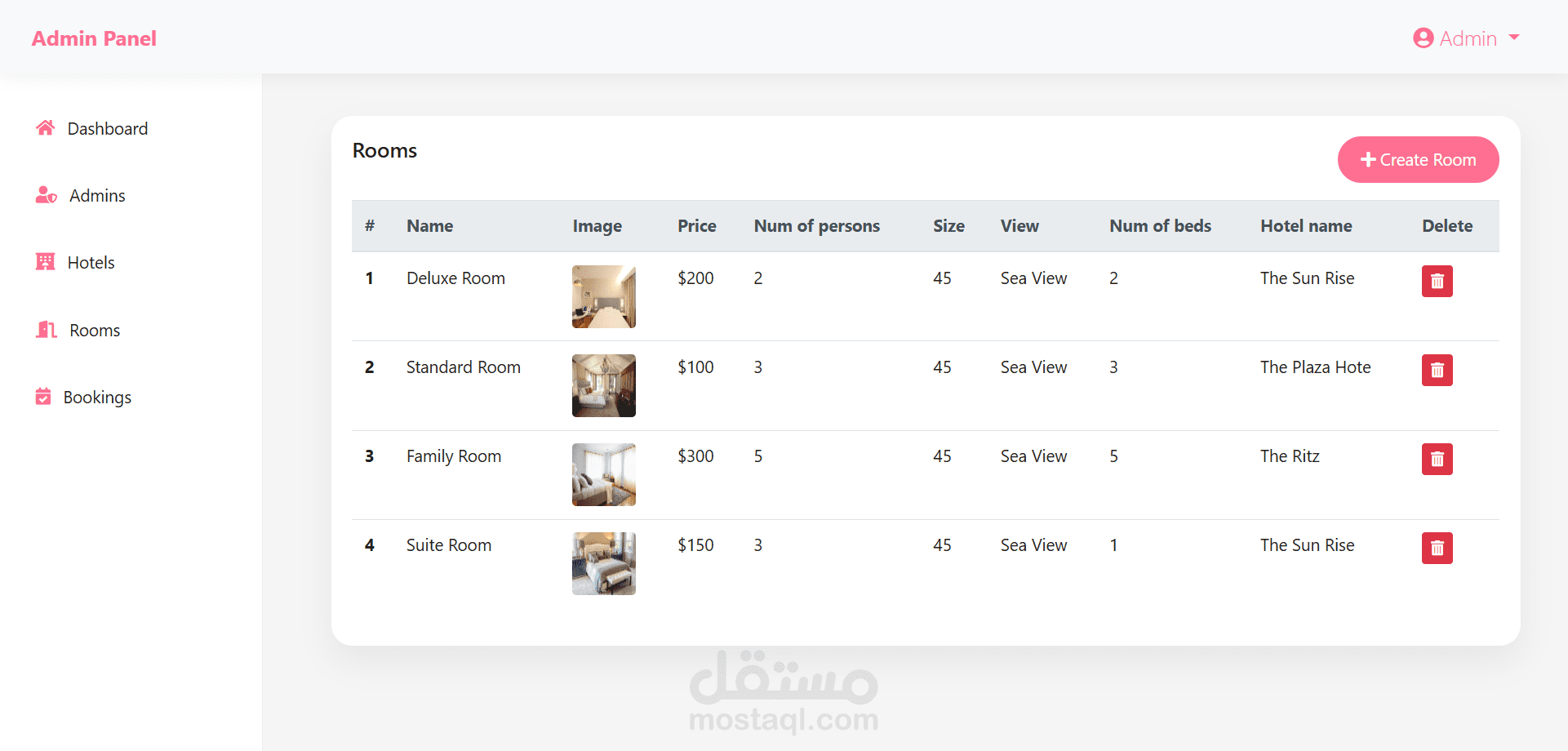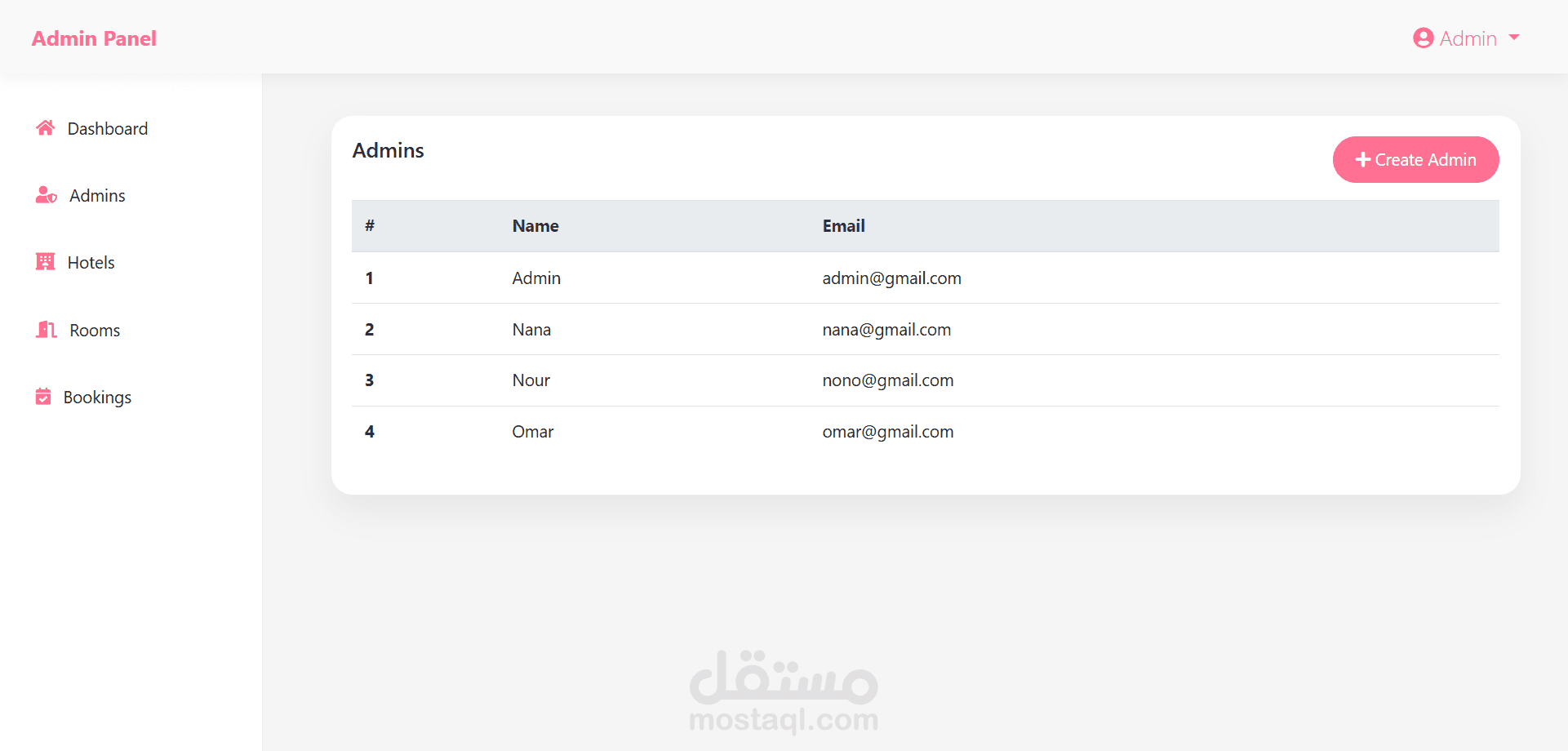 نظام إدارة فنادق حديث مبنيّ باستخدام Laravel، يتميز بلوحة تحكم إدارية متجاوبة تتيح لك إدارة الفنادق والغرف والحجوزات، والتعامل مع المستخدمين الإداريين، وتحديث حالات الحجوزات. يتضمن النظام عمليات CRUD للفنادق والغرف مع الصور والتفاصيل، ونظام مصادقة آمن، وواجهة مستخدم سلسة وسهلة الاستخدام، مما يجعله مثاليًا لمشاريع حجز الفنادق، ولوحات التحكم الإدارية، أو حلول إدارة الفنادق المخصصة.