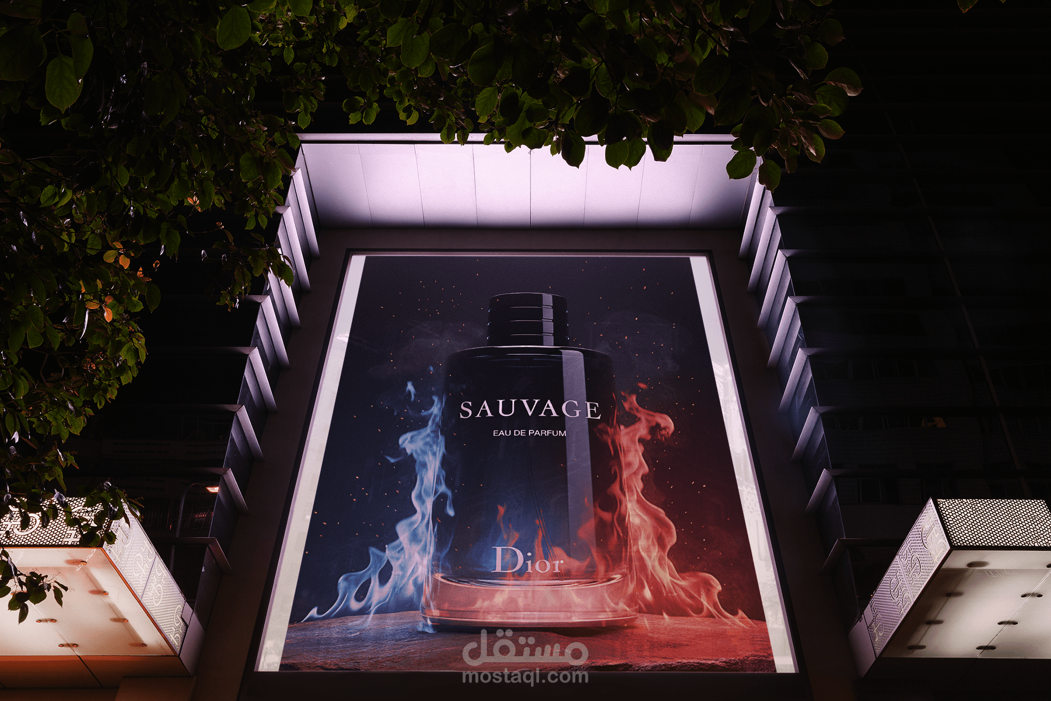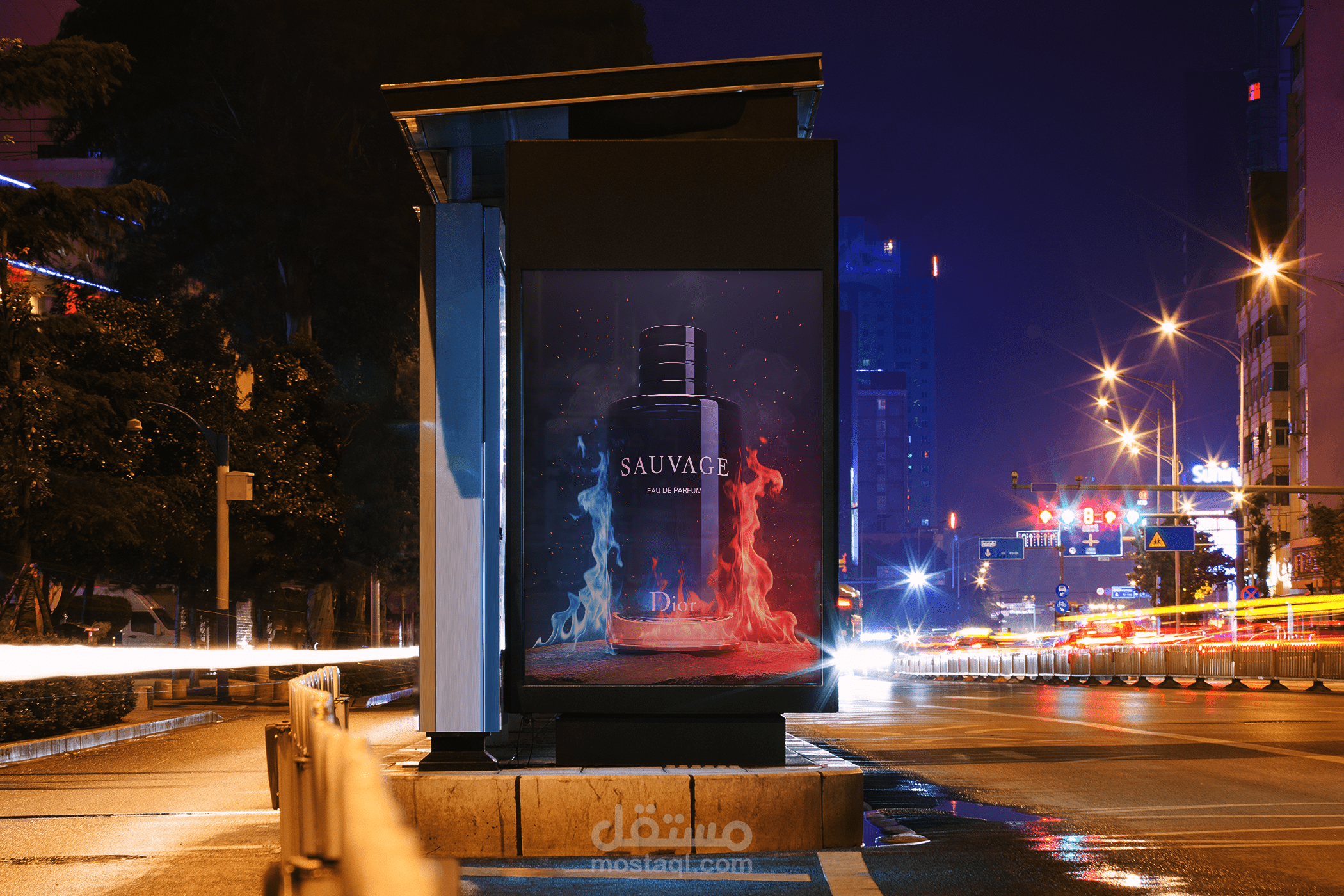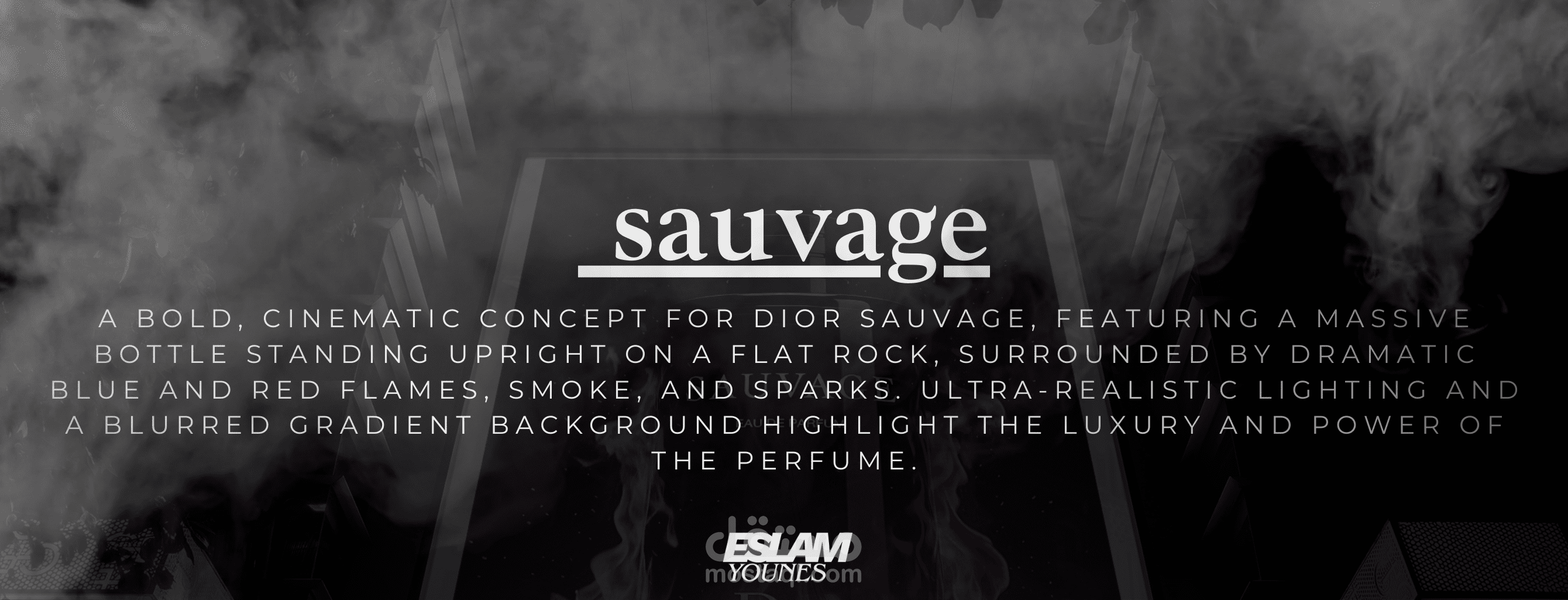 A bold, cinematic concept for Dior Sauvage, featuring a massive bottle standing upright on a single flat rock, surrounded by dramatic blue and red flames, smoke, and floating sparks. The blurred gradient background and hyper-realistic lighting emphasize the perfume’s luxury, power, and dominance