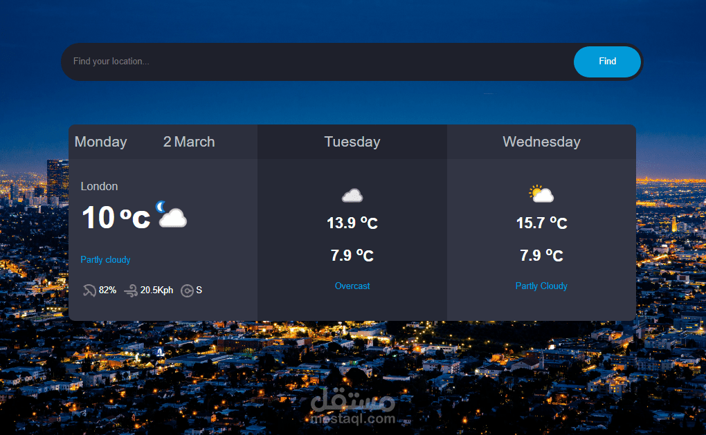 تم تصميم الواجهة باستخدام HTML و CSS مع استخدام JavaScript لجلب بيانات الطقس من API وعرضها داخل الموقع بشكل ديناميكي.