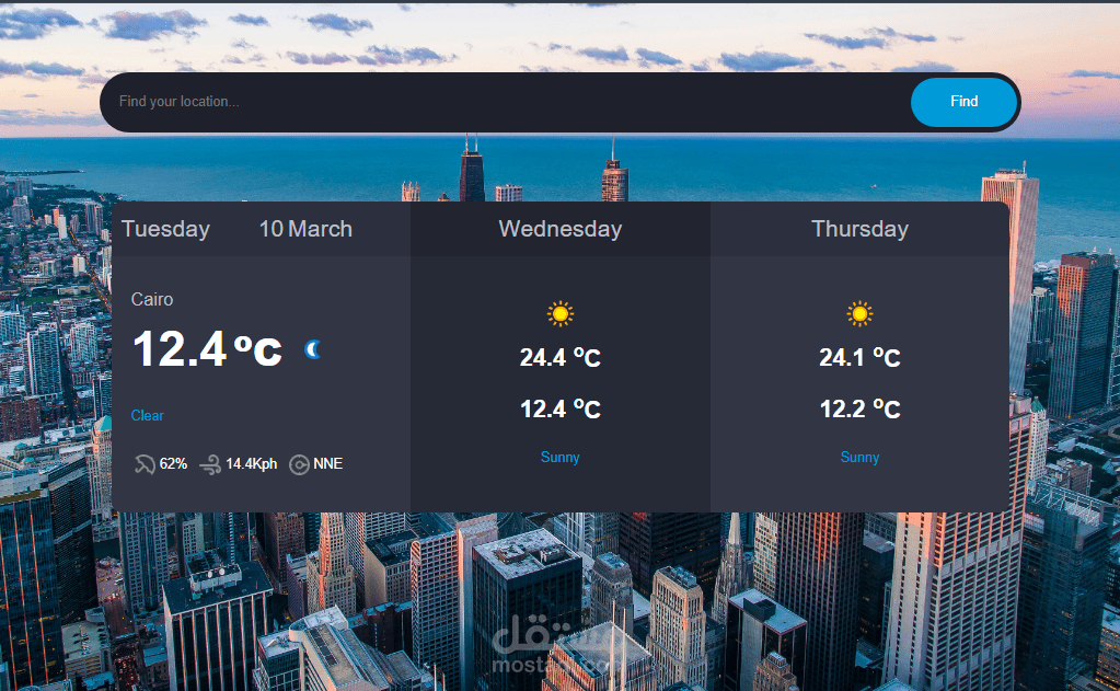 قمت بتطوير موقع لعرض حالة الطقس بواجهة مستخدم بسيطة وسهلة الاستخدام. يتيح الموقع للمستخدم معرفة حالة الطقس بشكل سريع من خلال عرض المعلومات بطريقة واضحة ومنظمة.