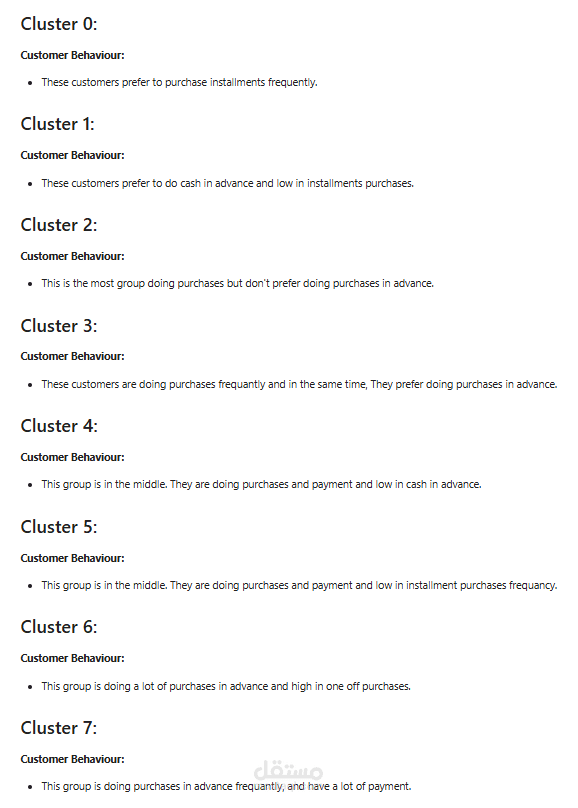 تم العمل على البيانات بدايةً من استكشاف البيانات (EDA)، ثم تنفيذ Data Cleaning و Feature Engineering لاستخلاص الخصائص المؤثرة، وبعد ذلك تطبيق خوارزميات Clustering لتقسيم العملاء إلى مجموعات واضحة ومميزة.