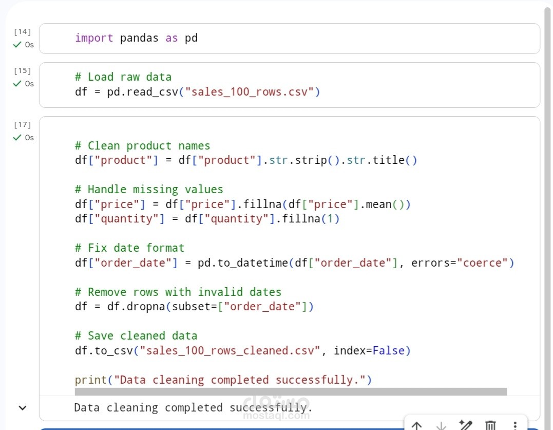 I implemented data cleaning and transformation on sales data from CSV files using Python (Pandas).