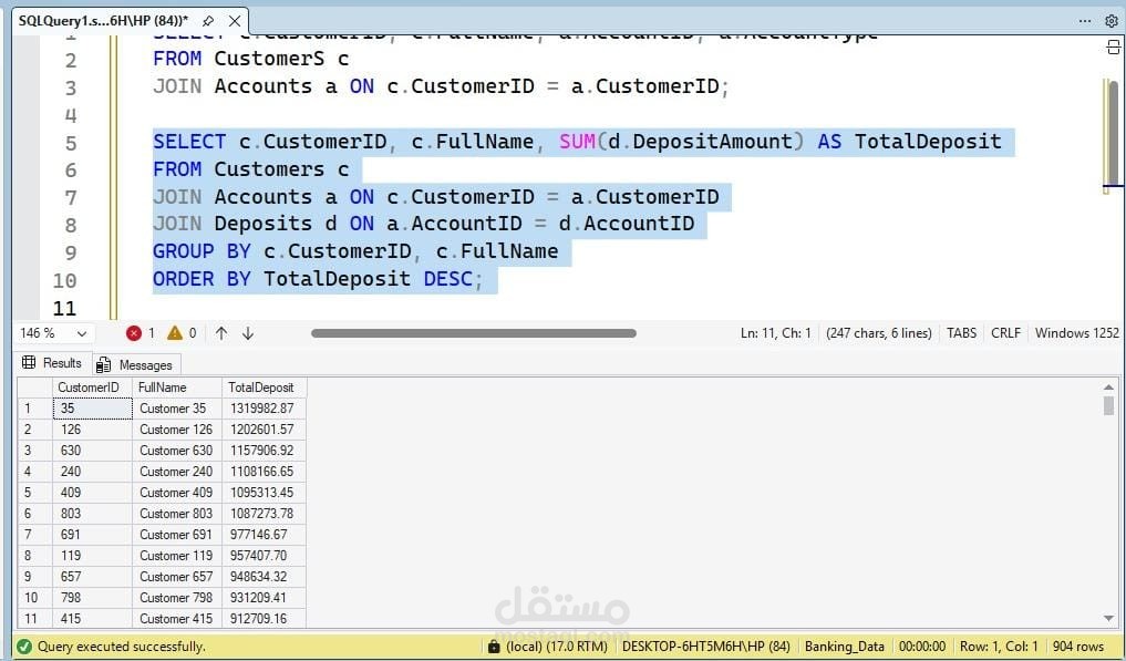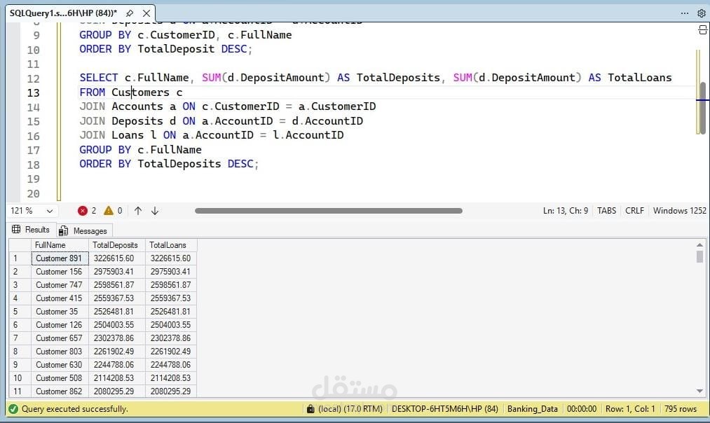 The project included data cleaning, creating Fact Tables and Dimension Tables, and building Measures to generate accurate reports and insights, such as total deposits and loans per customer and branch, and the number of cards per account type.