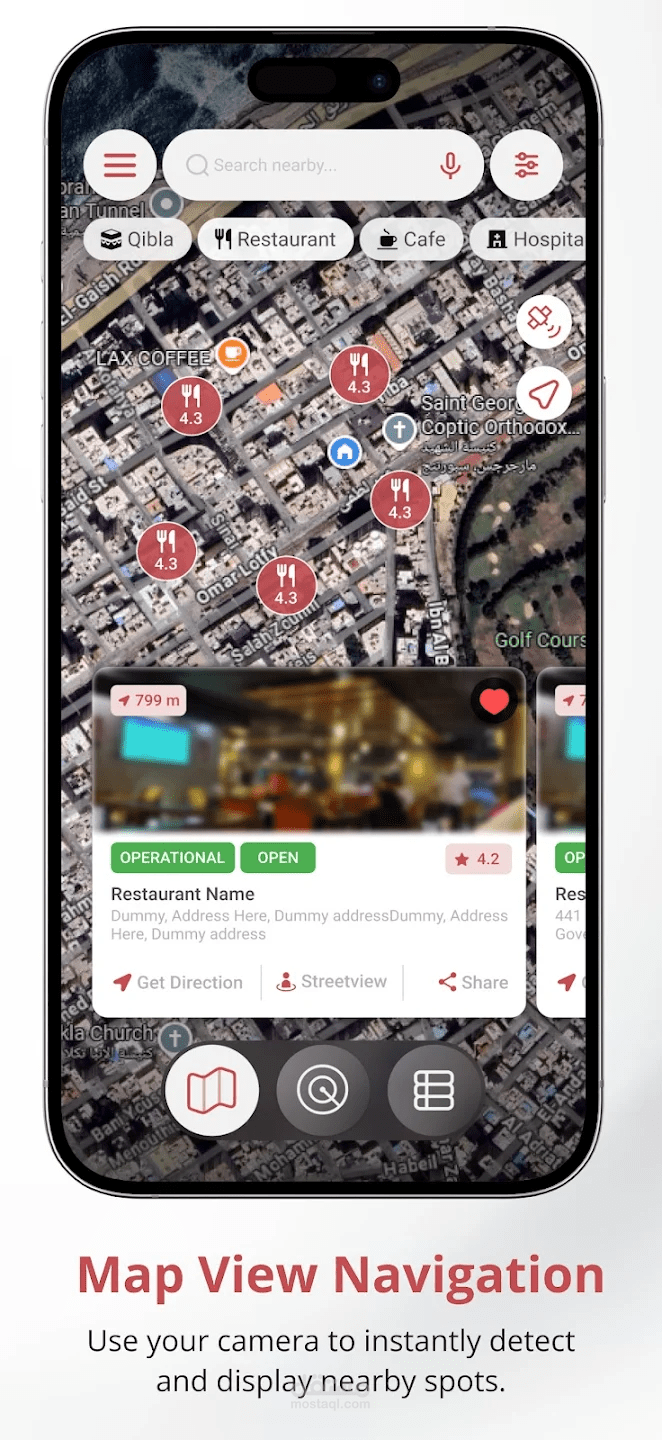 - تنفيذ نظام ملاحة ثلاثي المسارات: واجهة خريطة تفاعلية (Map View)، عرض قائمة منظمة (List View)، وكاميرا واقع معزز (AR Camera) للاكتشاف البصري في الوقت الفعلي.