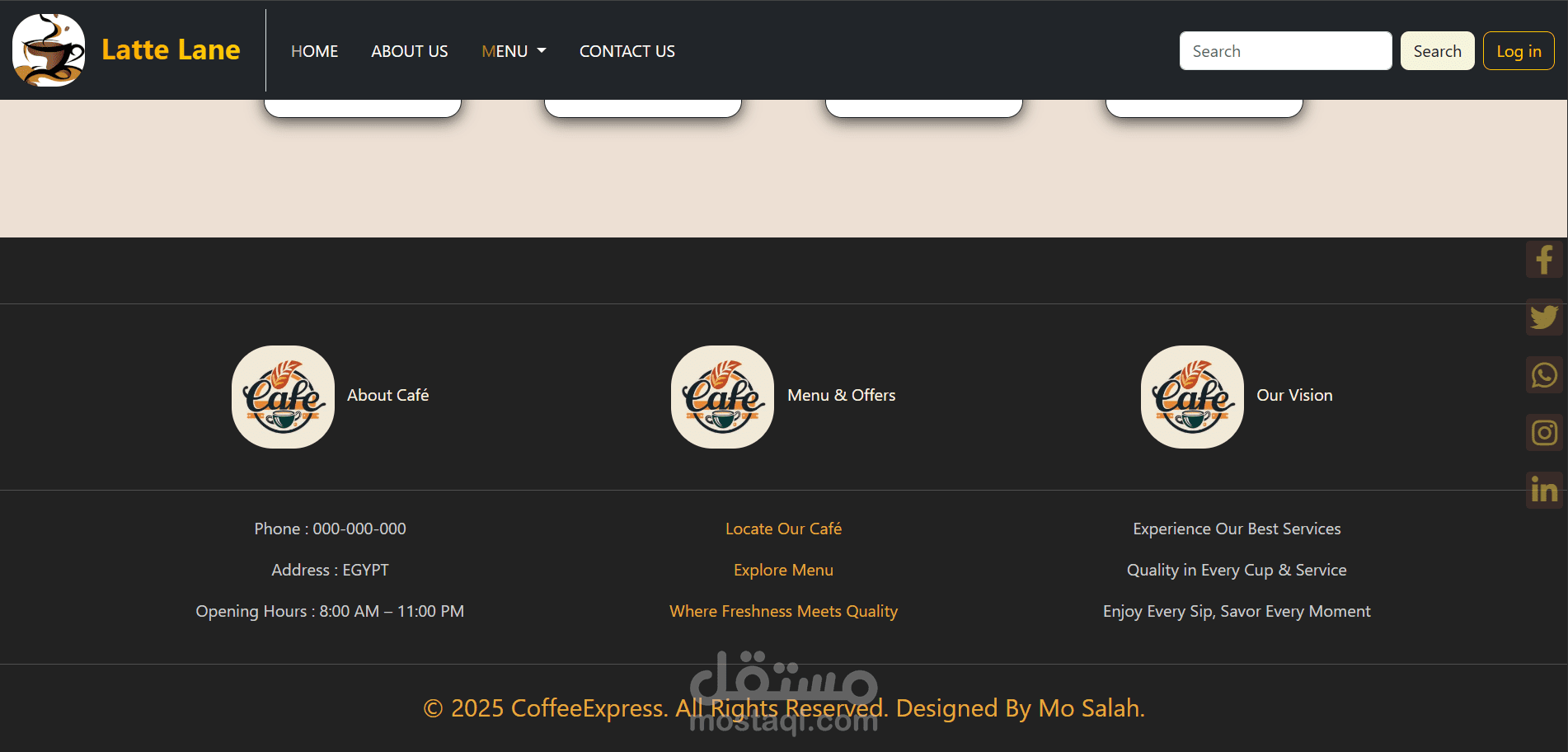 "I designed and developed a Cafe/Restaurant website using HTML, CSS, Bootstrap, and JavaScript. The site includes a menu page, about section, contact form, and a fully responsive design that works seamlessly on both mobile and desktop.