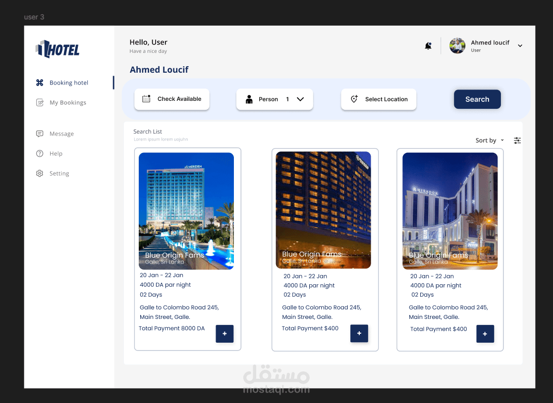 تصميم UI/UX متكامل لمنصة حجوزات فنادق يراعي سهولة الاستخدام، وضوح التدفق، وتنظيم الأدوار داخل النظام.