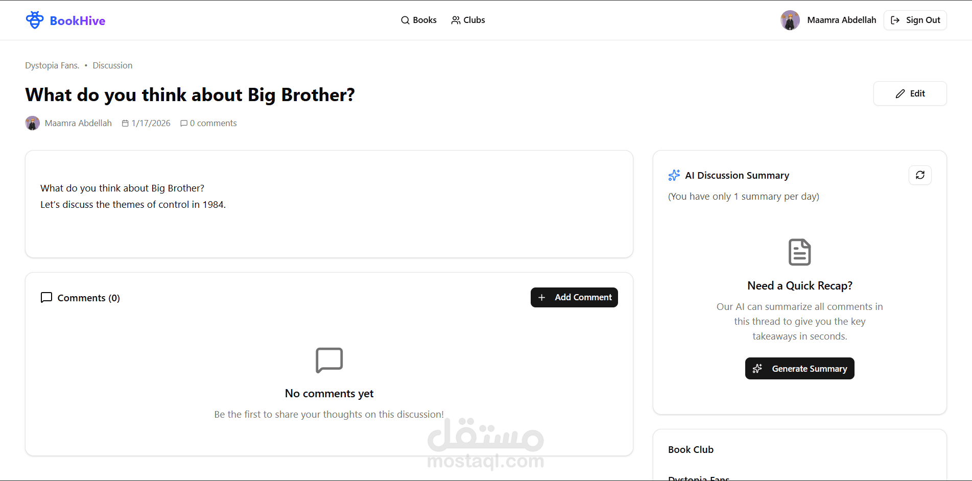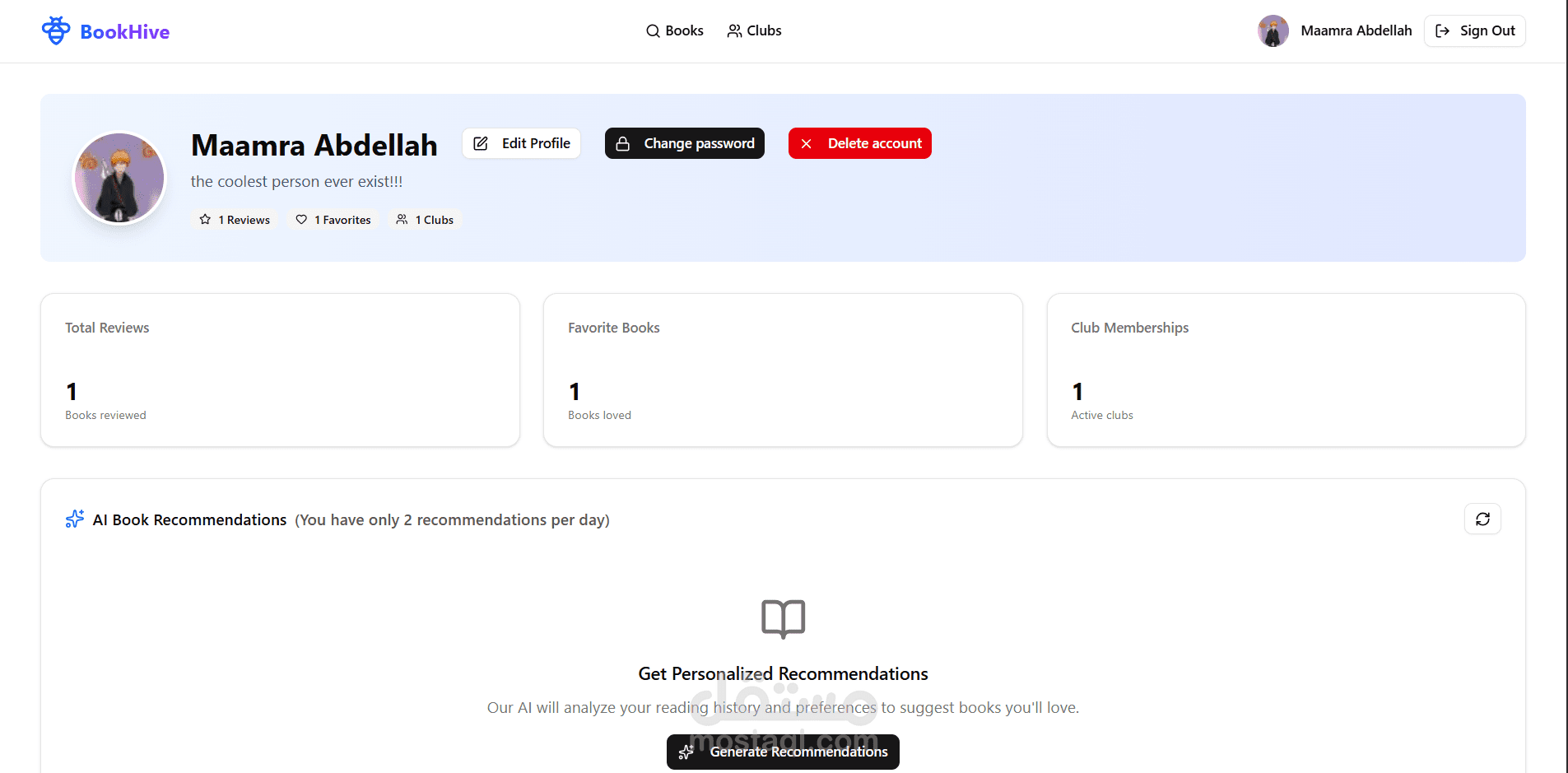 منصّة توصيات كتب مدعومة بالذكاء الاصطناعي تقترح كتبًا بناءً على تفضيلات المستخدم وسجلّ قراءته.