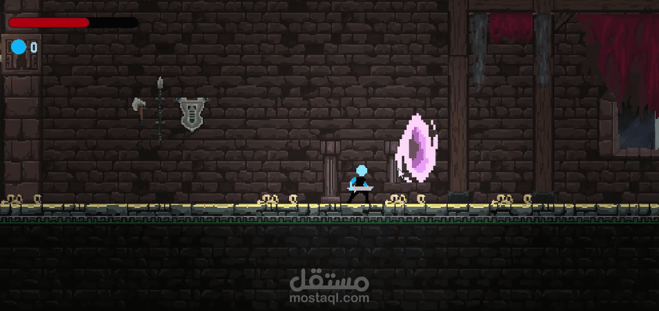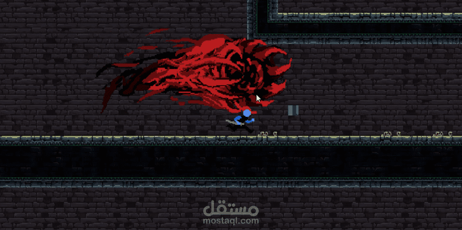 تشمل حركة لاعب، قفز، أرضيات، وزعيم بهجمات متعددة وأنيميشن.