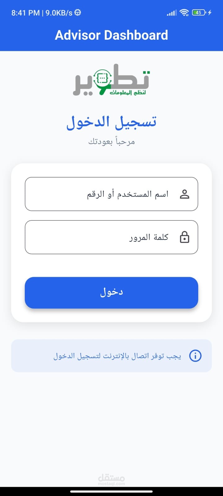 لوحة التحكم (Dashboard) في تطبيق Advisor