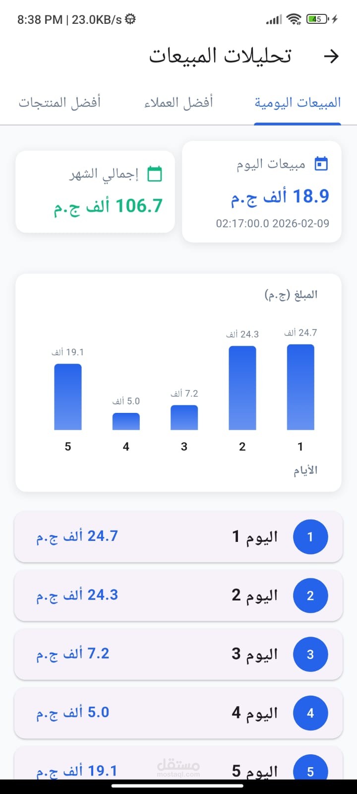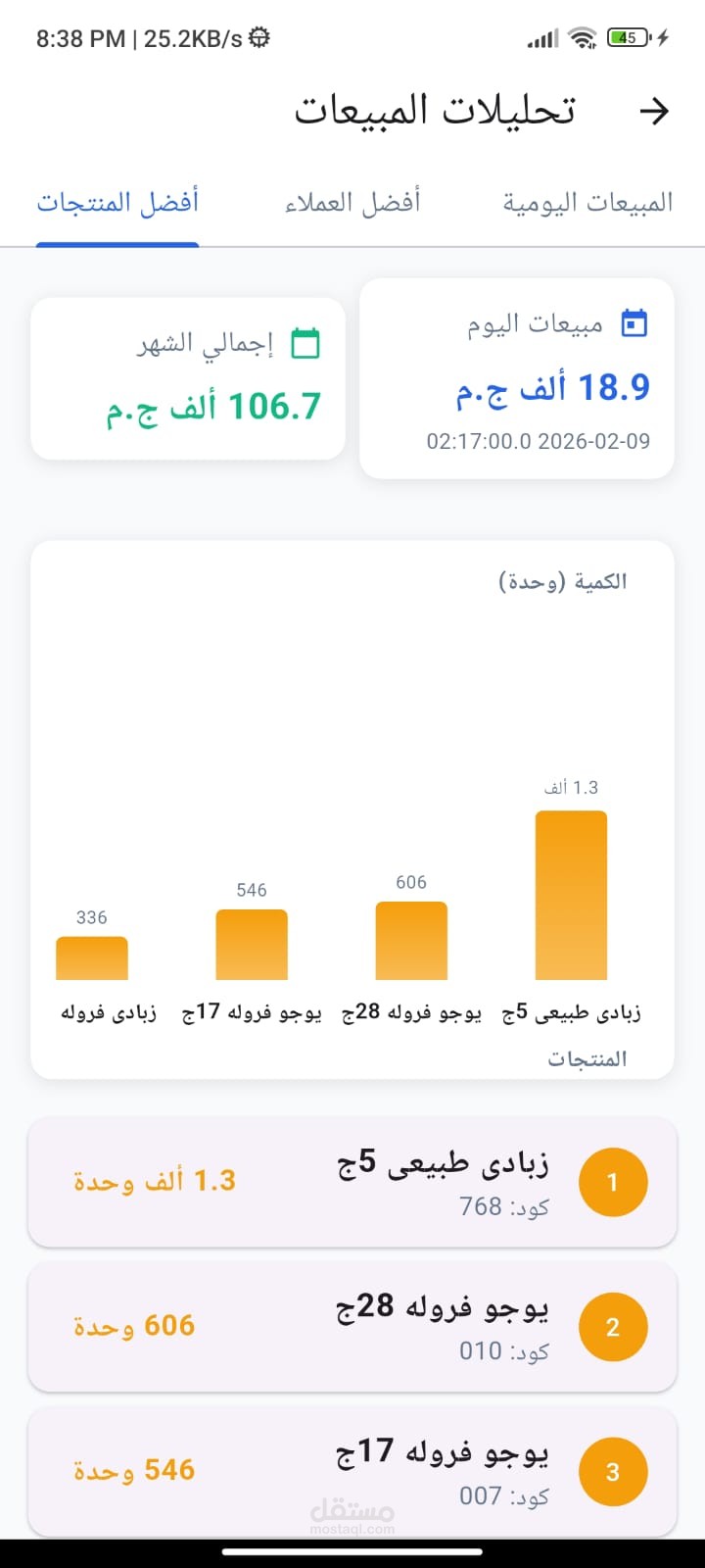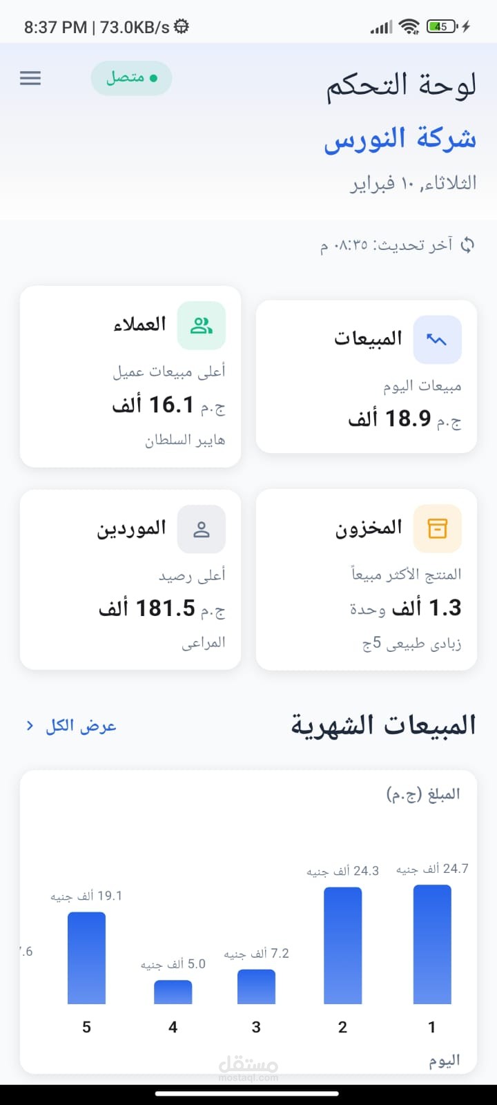 كما توفّر لوحة التحكم تحليلًا تفصيليًا للمبيعات الشهرية من خلال رسوم بيانية وتقارير تفاعلية توضح اتجاهات البيع ونسب النمو والأداء العام، بما يسهم في تقييم الخطط التسويقية وتحسين استراتيجيات المبيعات.
