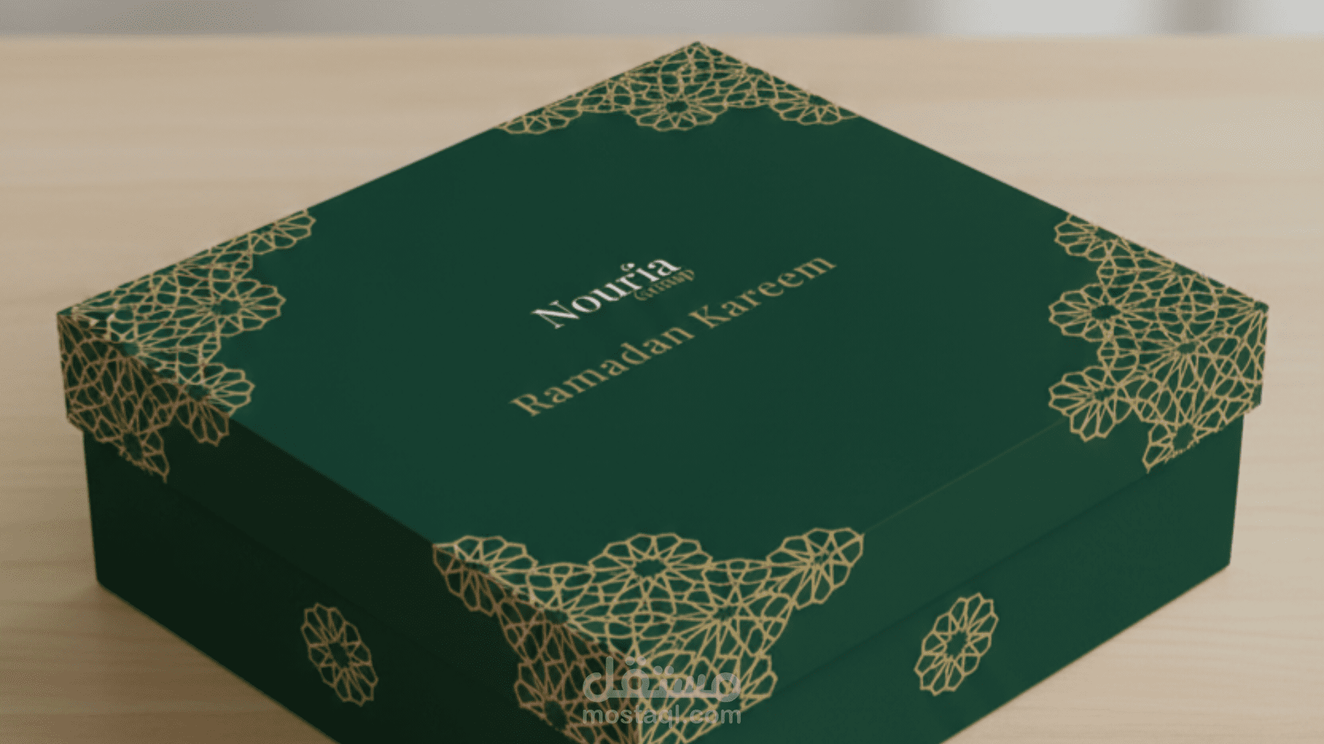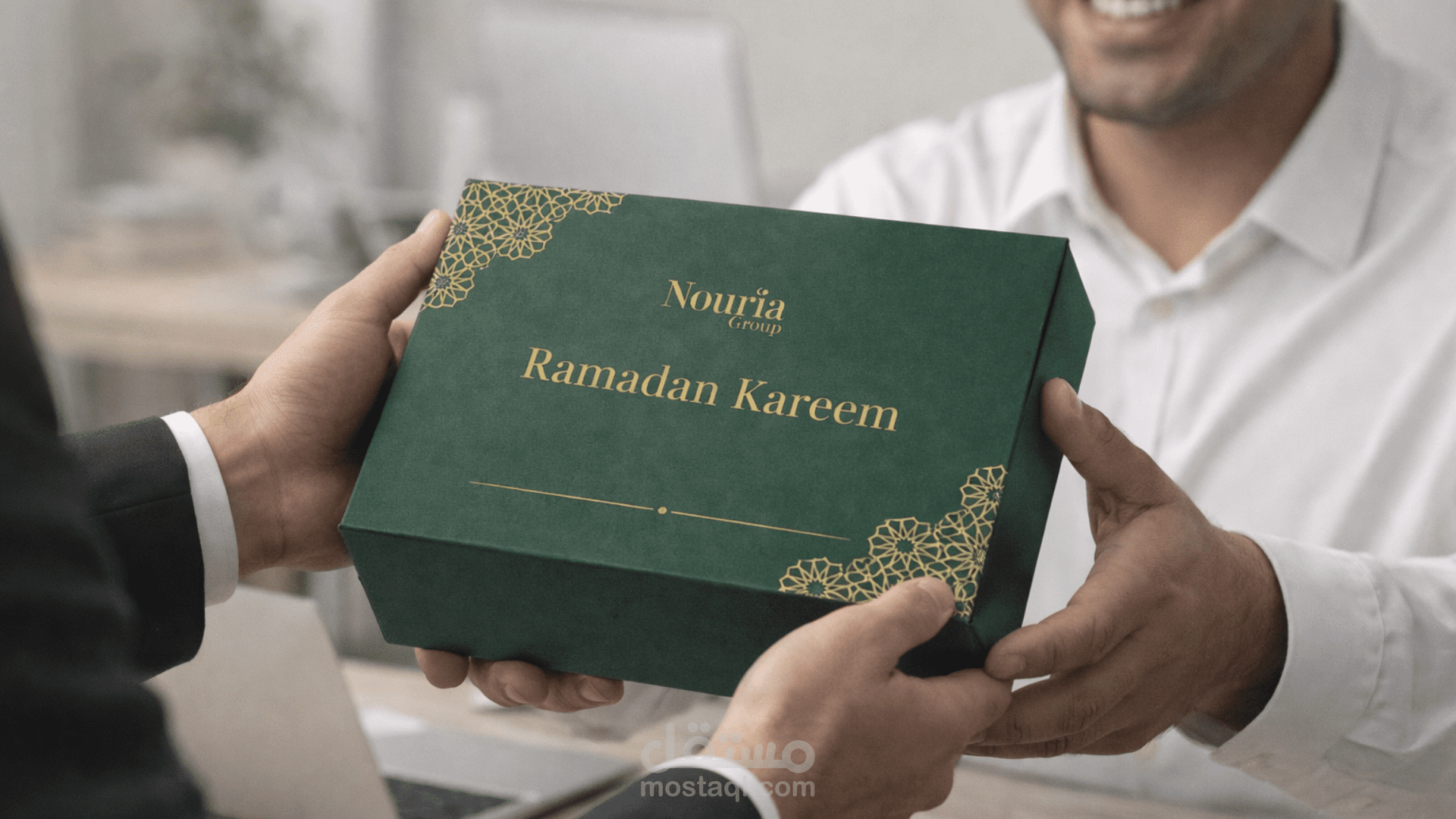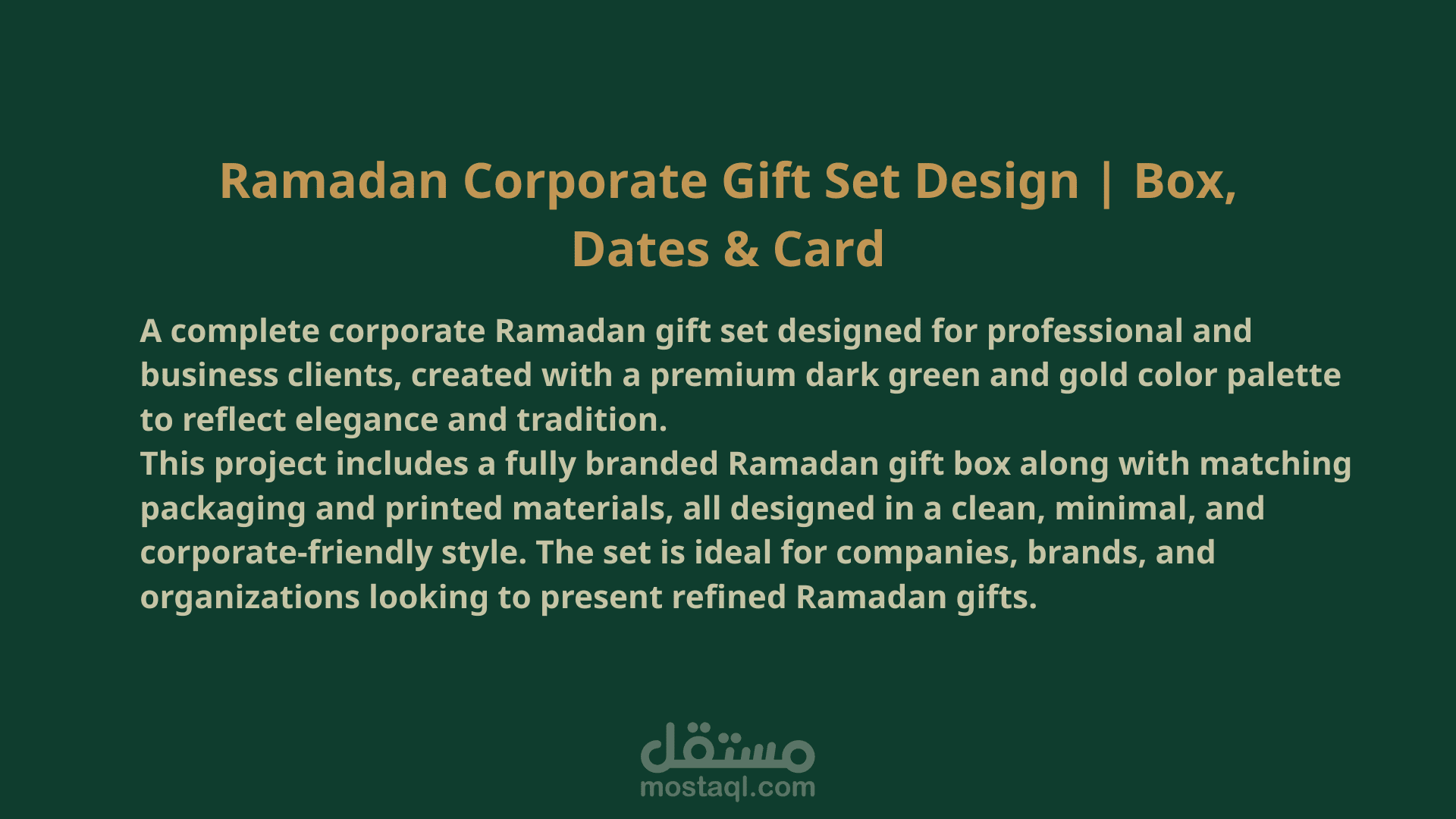 A premium corporate Ramadan gift set designed with a clean dark green and gold aesthetic.