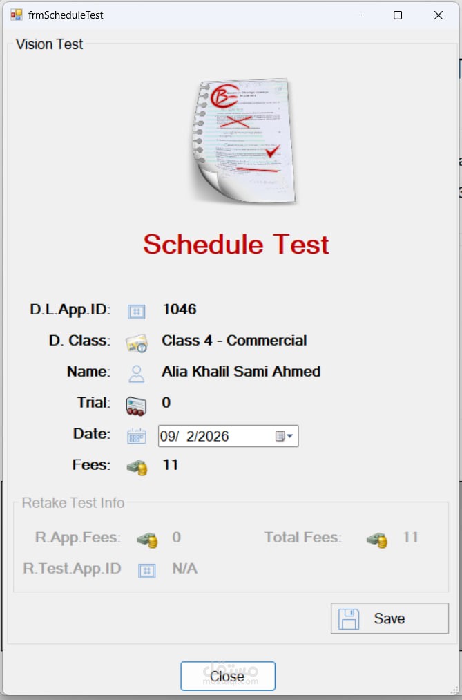 إدارة الاختبارات: جدولة الاختبارات (النظرية، العملية، النظر)، وتسجيل النتائج.