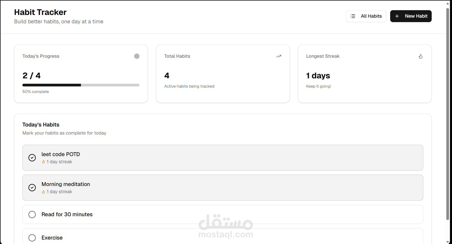 يمكن للمستخدم إضافة عادة جديدة ثم تسجيل إتمامها يوميًا، ويقوم التطبيق بحساب عدد الأيام المتتالية التي تم الالتزام فيها بالعادات (Streak)، مما يساعد المستخدم على الحفاظ على الاستمرارية.