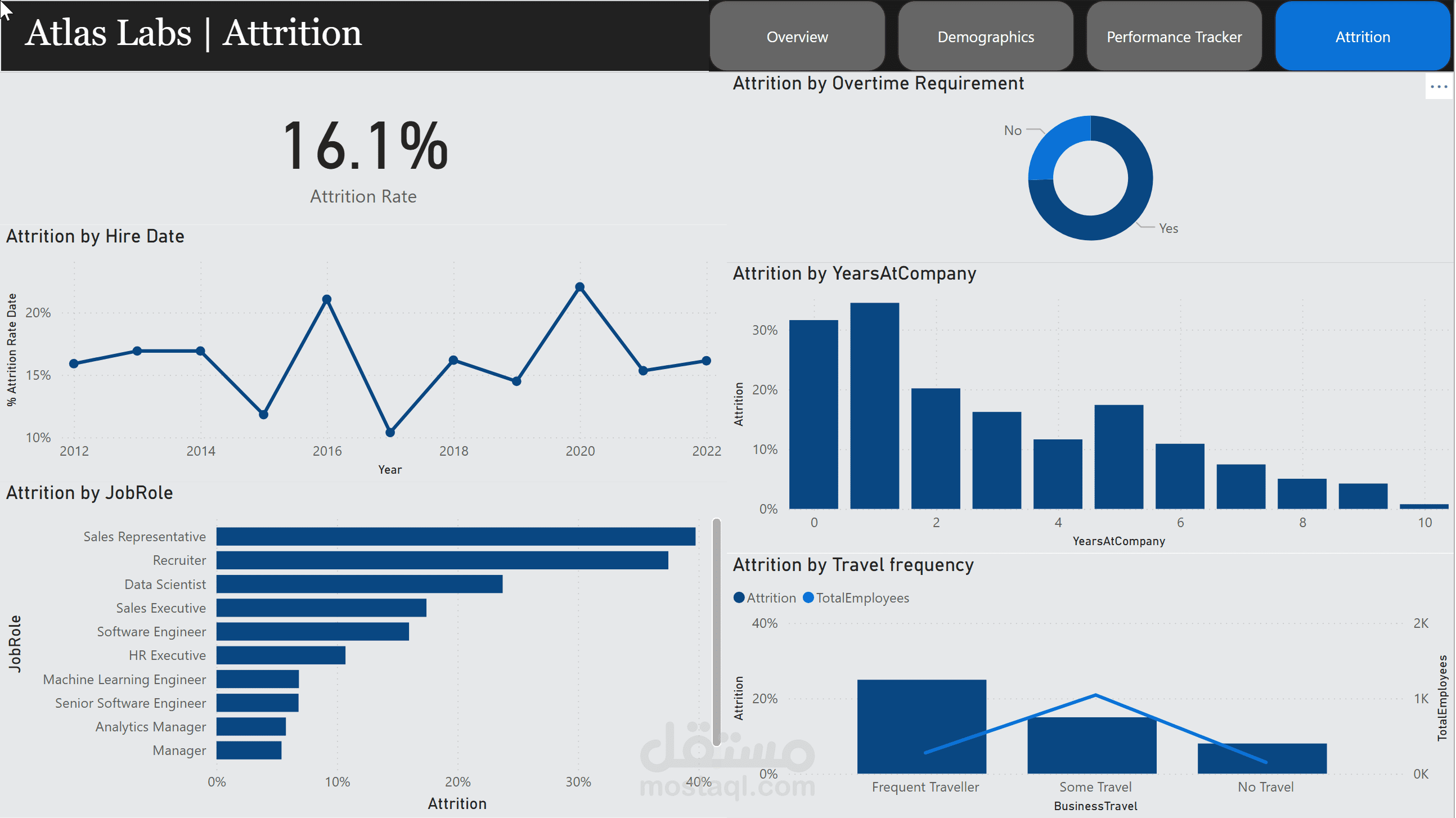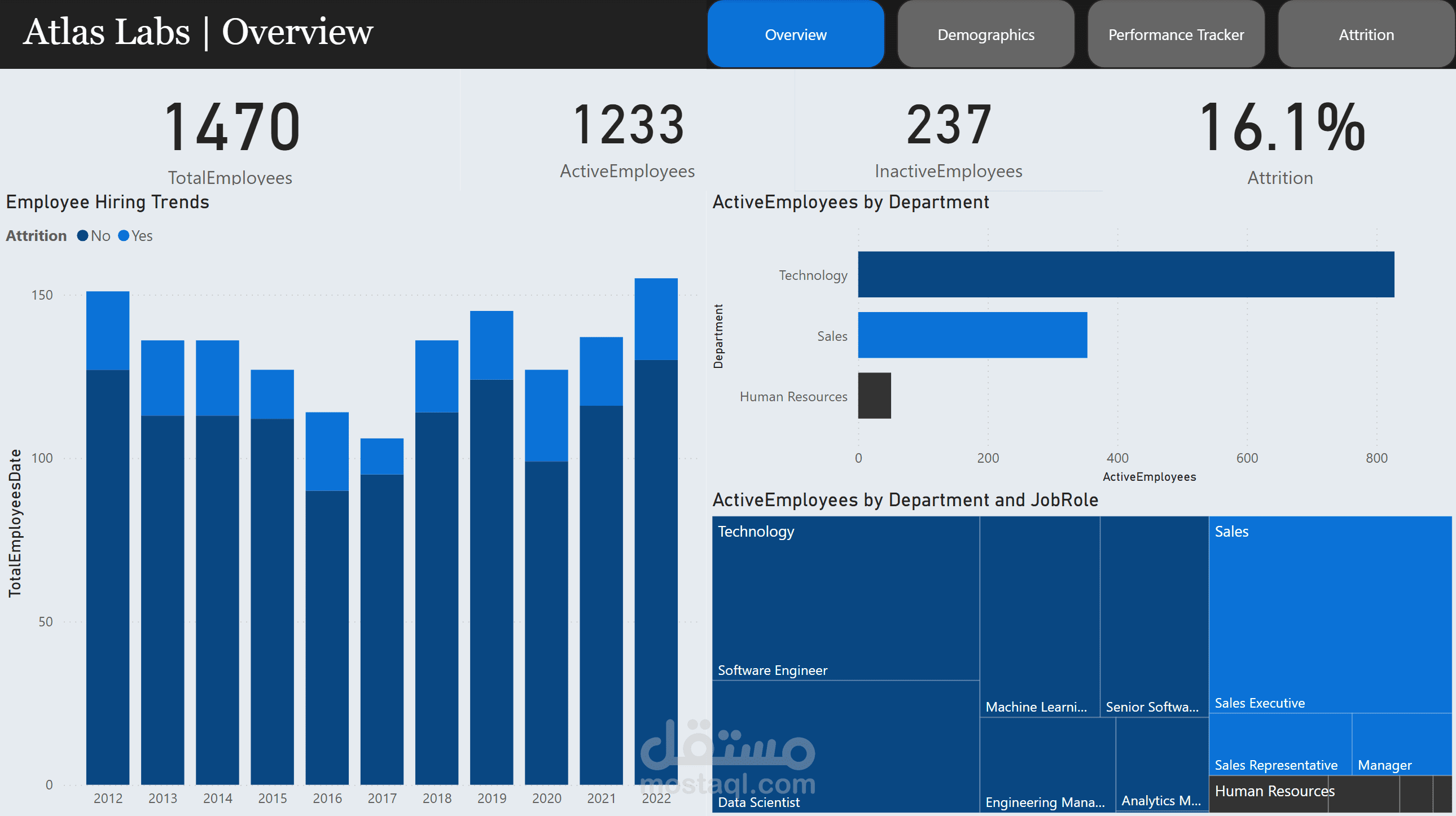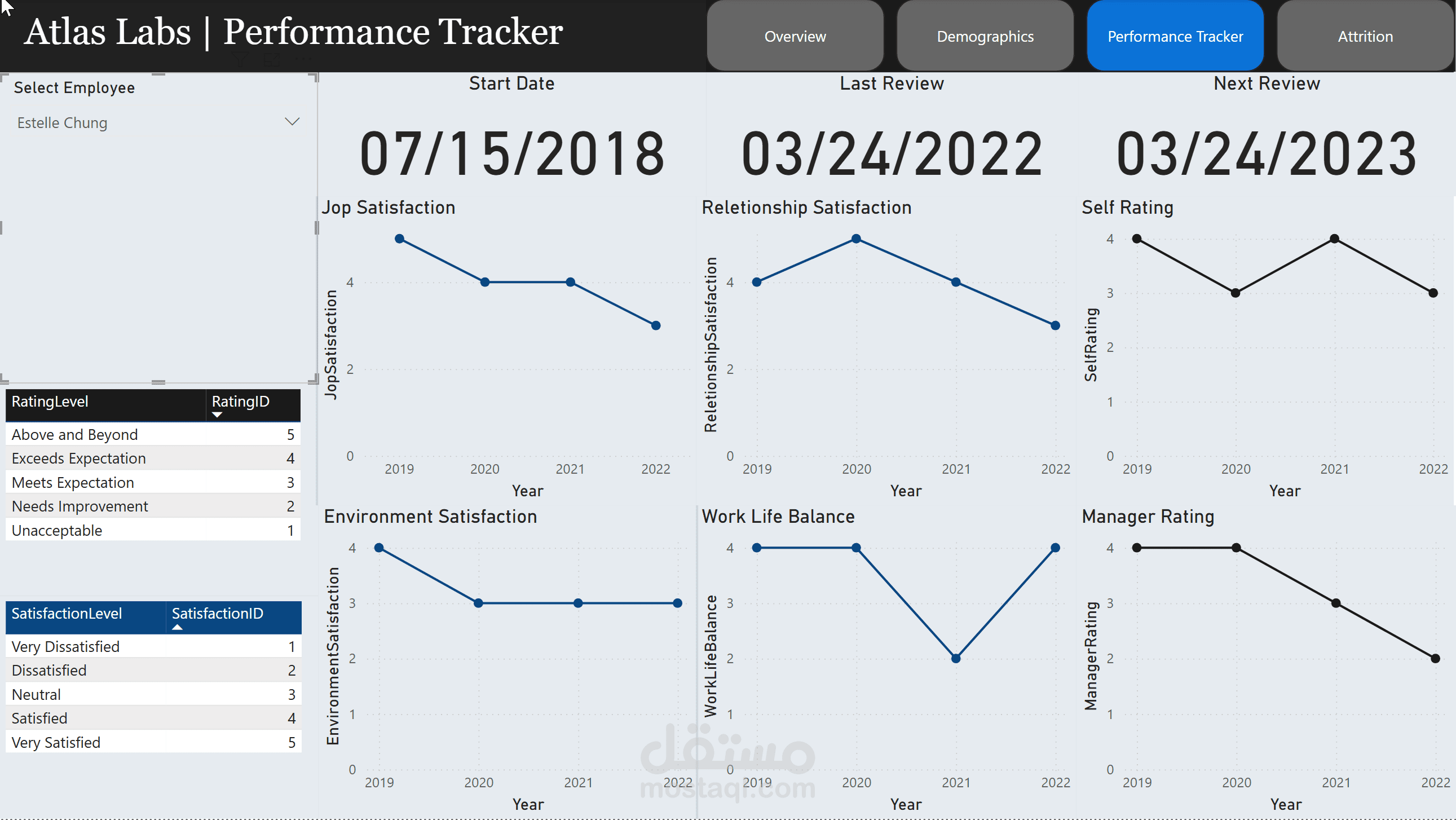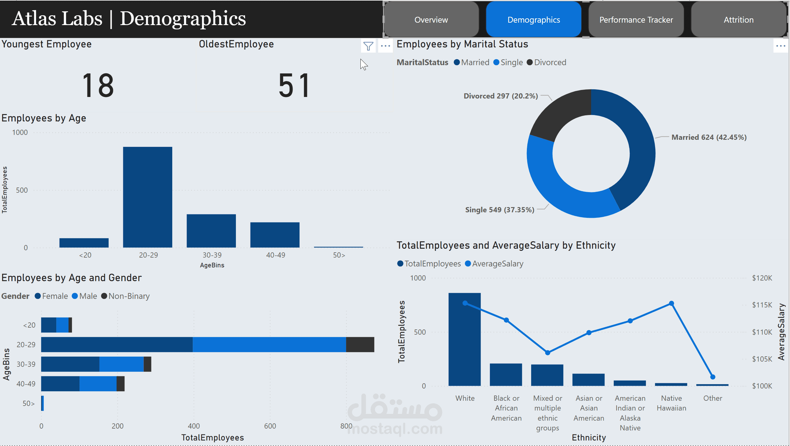 Designed a multi-page Power BI dashboard analyzing demographics, performance, satisfaction, and attrition.