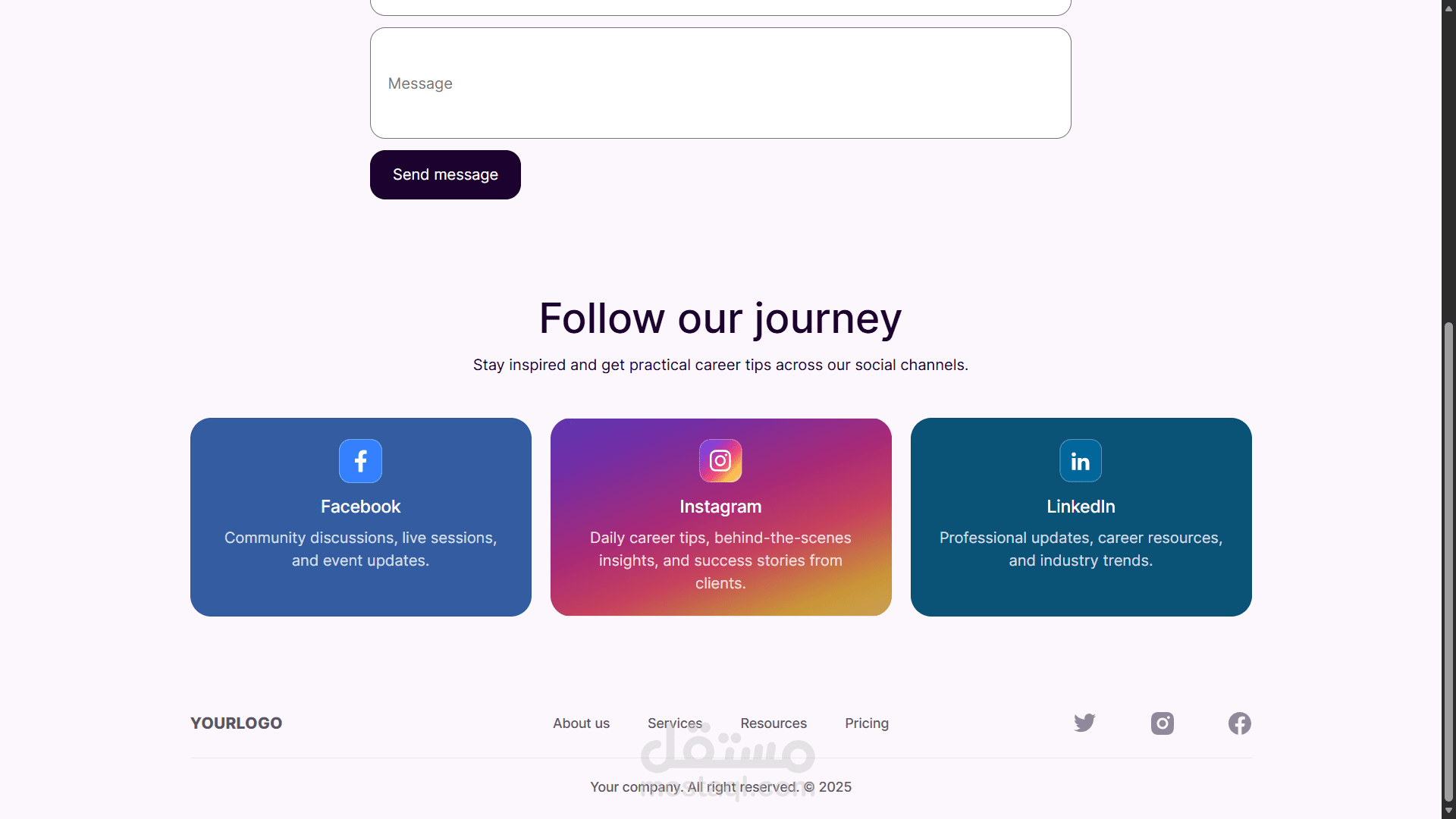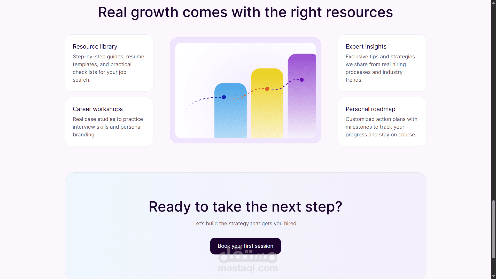 عرض خدمات ومكتبة موارد تعليمية تساعد الزوار على فهم خطوات الانتقال المهني والتقدم في مساراتهم العملية.