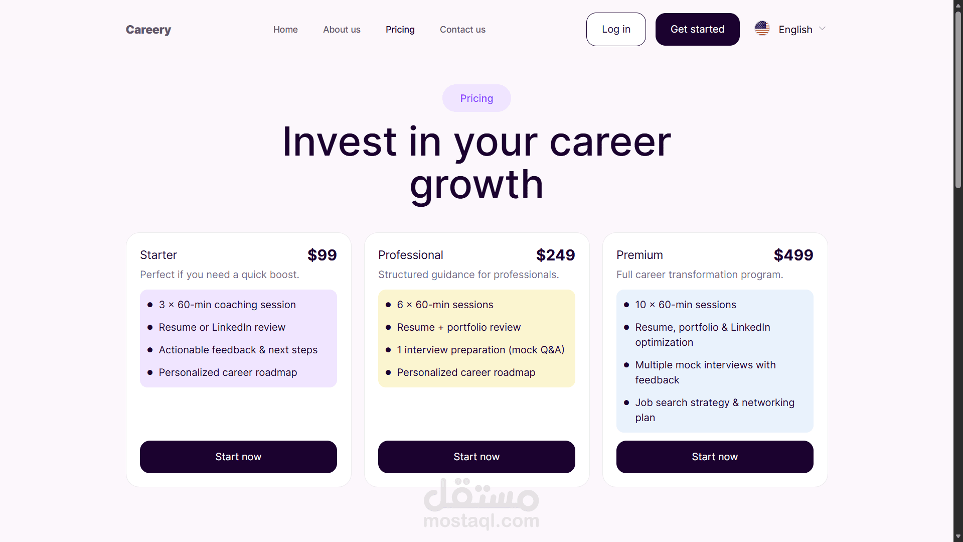 صفحة الأسعار (Pricing) تعرض باقات الاستشارات.