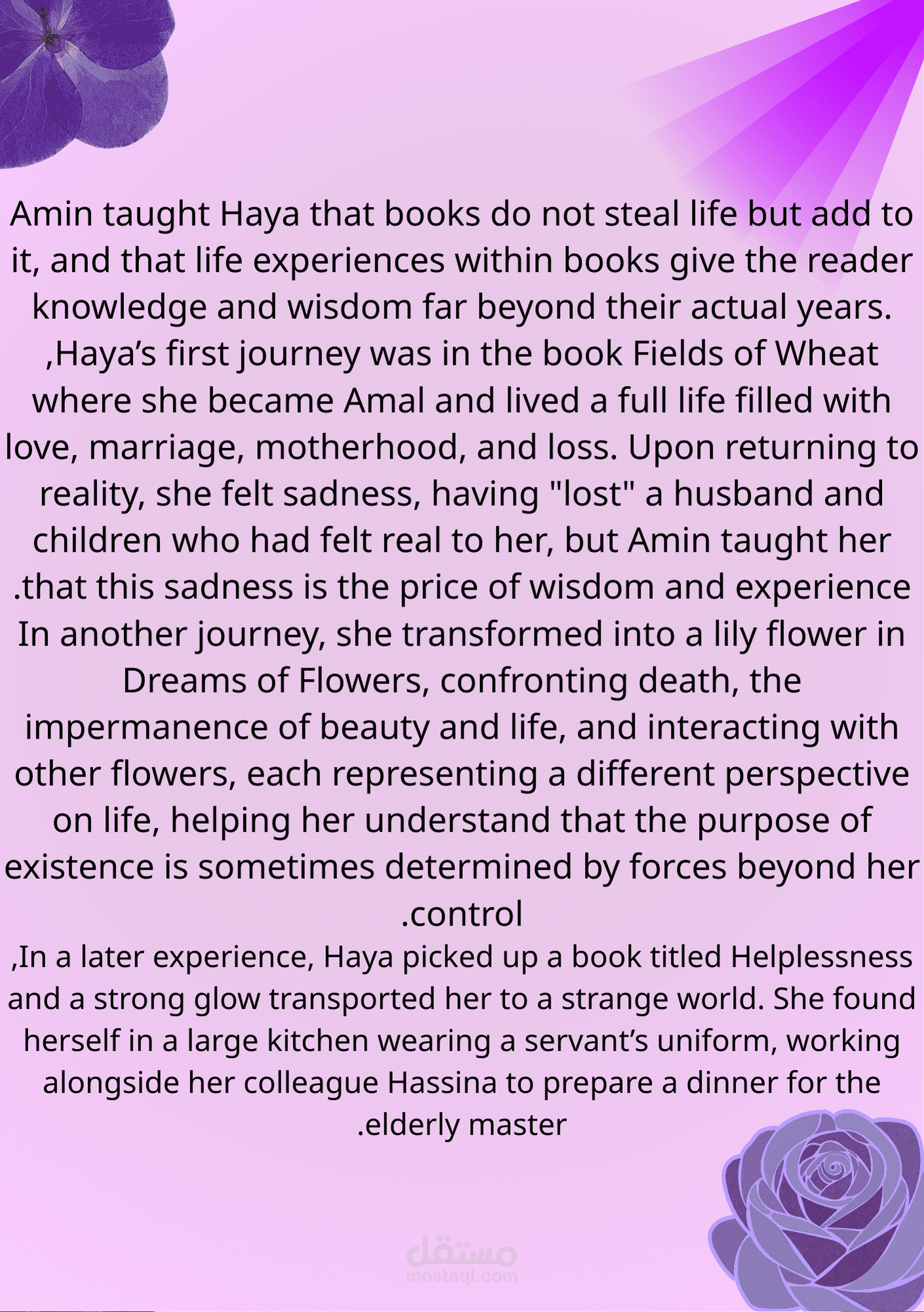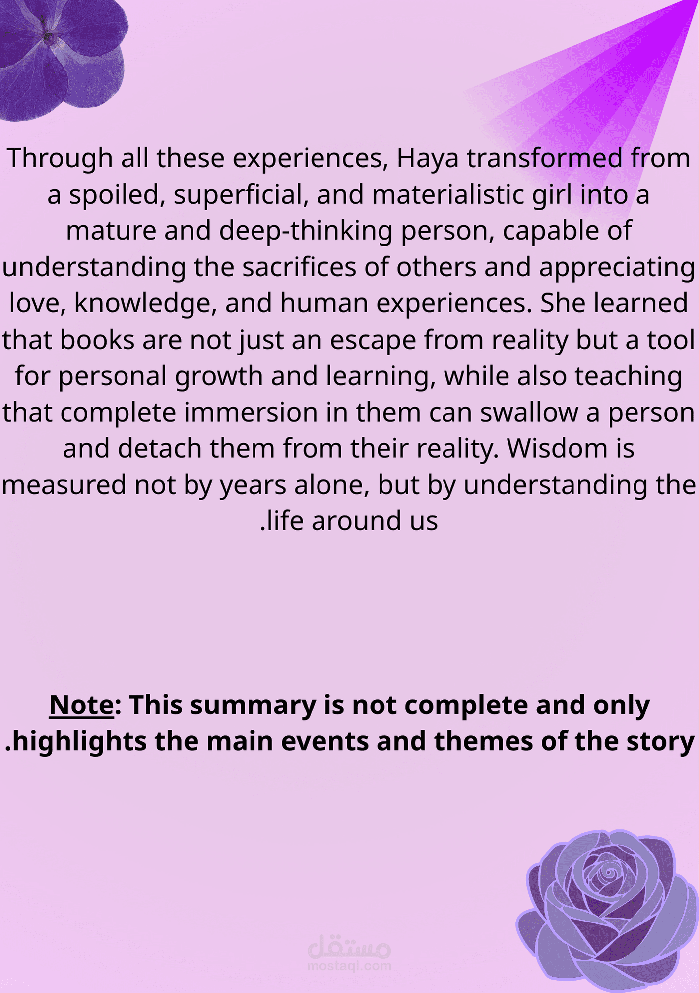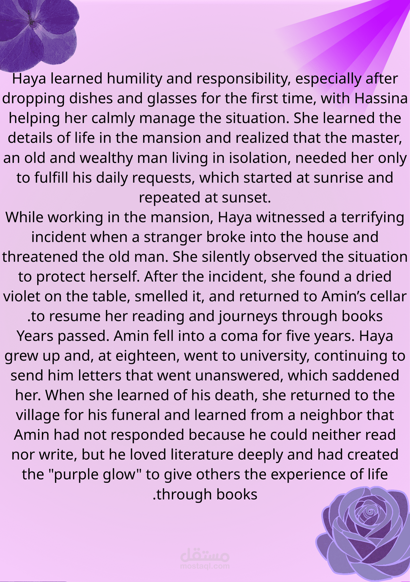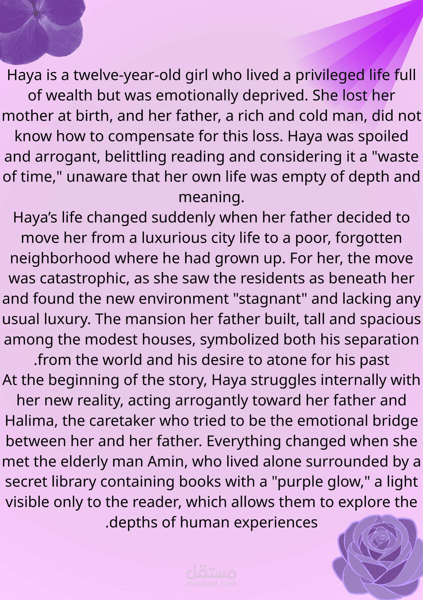 This report provides a comprehensive study of the first part of Osamah Al-Muslim’s novel Wahaj Al-Banafsaj (The Glow of Violet), focusing on the narrative, character development, symbolism, and philosophical themes. The report is based on my personal reading and in-depth understanding of the novel, highlighting the emotional experiences of the characters. This work demonstrates my skills in summarizing complex content and presenting ideas in a clear and organized manner.