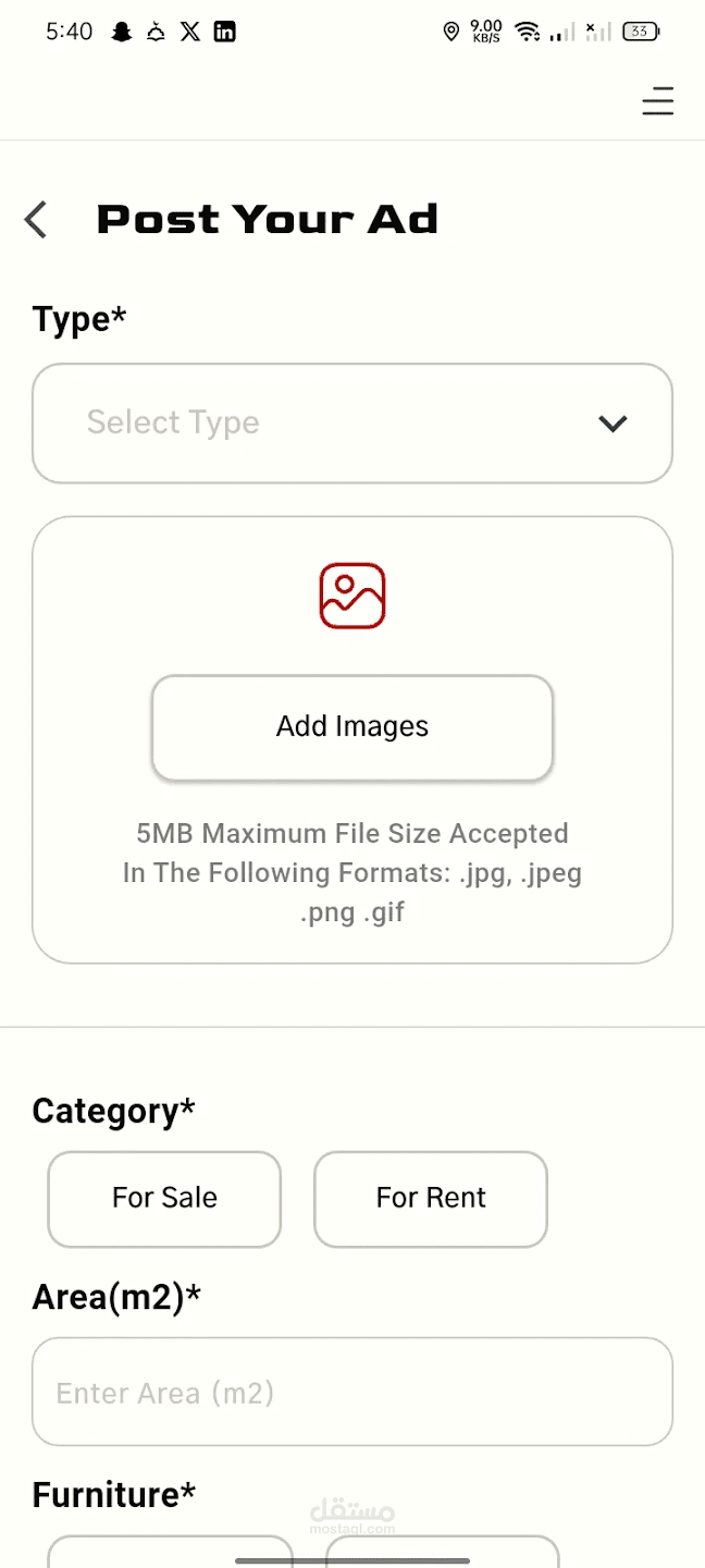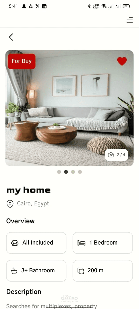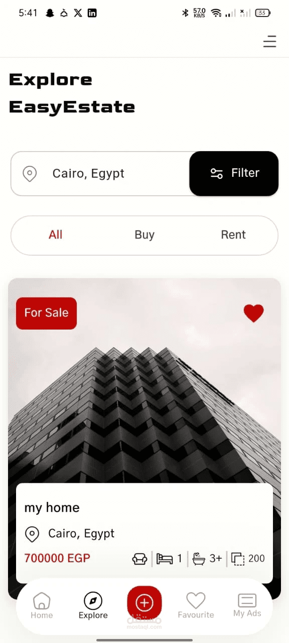 تطبيق عقاري موبايل تم تطويره باستخدام Flutter لتوفير تجربة سلسة للمستخدمين في البحث عن العقارات واستعراض التفاصيل وإدارة العمليات المرتبطة بالعقارات بشكل احترافي وسريع.