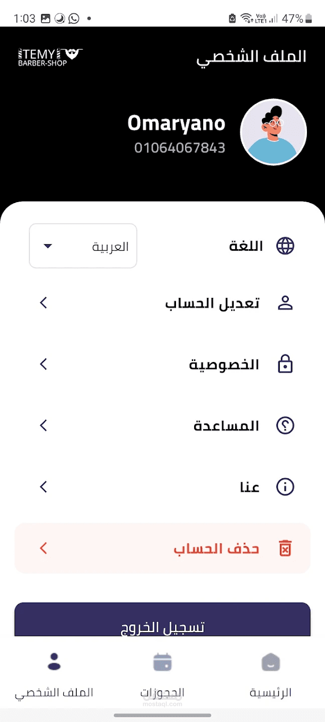 تطبيق موبايل متكامل مخصص لمحلات الحلاقة (Barbershops) يسهّل عملية الحجز وإدارة المواعيد بشكل احترافي وسلس.