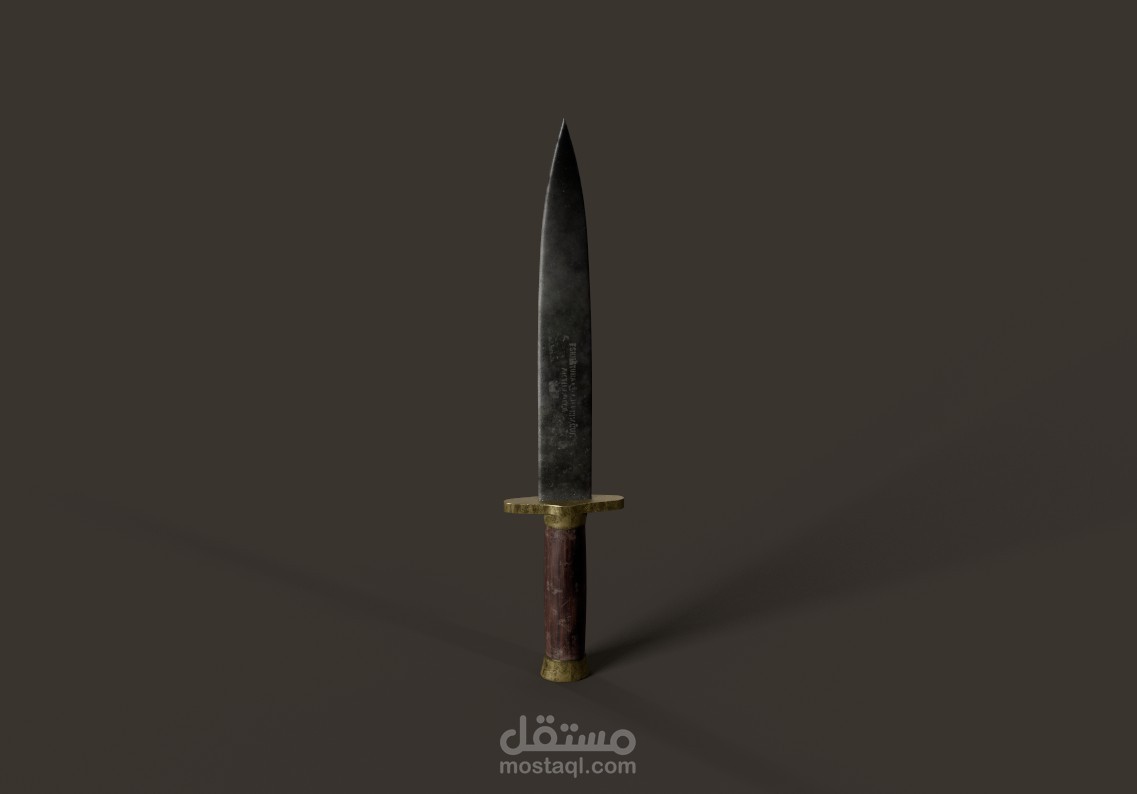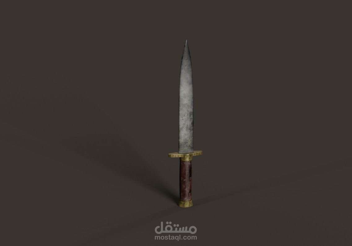 A realistic dagger model focusing on detailed metal texturing and cinematic lighting. The blade features subtle surface wear and roughness variations to convey age and realism. Dark, high-contrast lighting is used to enhance the form, highlight material details, and create a dramatic, grounded presentation against a minimal background.