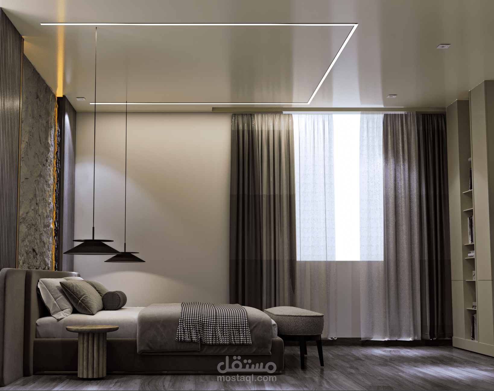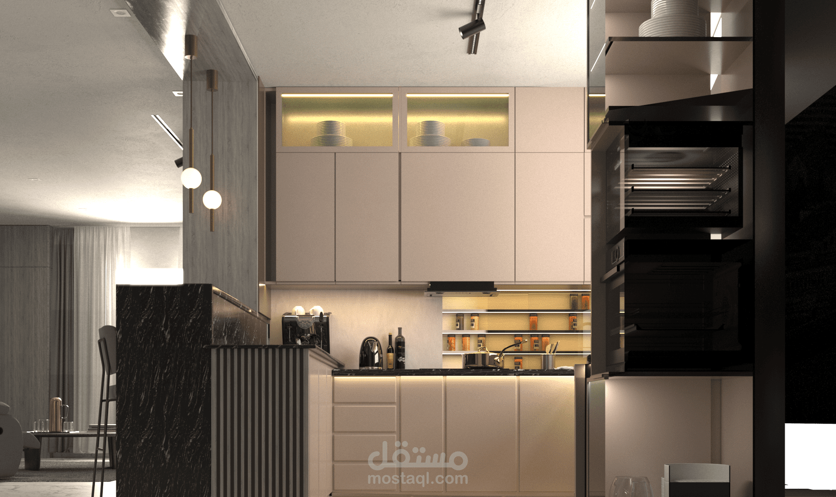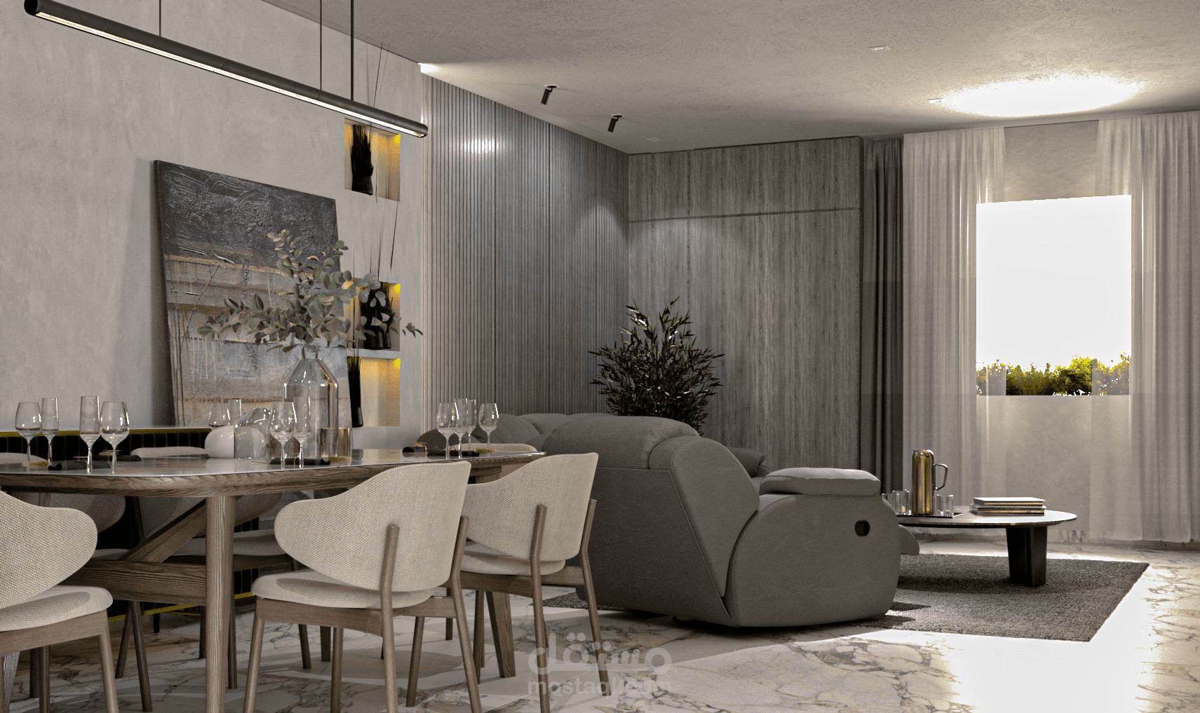 مشروع تصميم داخلي لوحدة سكنية يضم غرفة نوم ماستر ومنطقة استقبال مفتوحة (معيشة + سفرة) و غرفه ملابس و مطبخ يعتمد على أسلوب عصري هادئ بألوان محايدة ولمسات دافئة.
