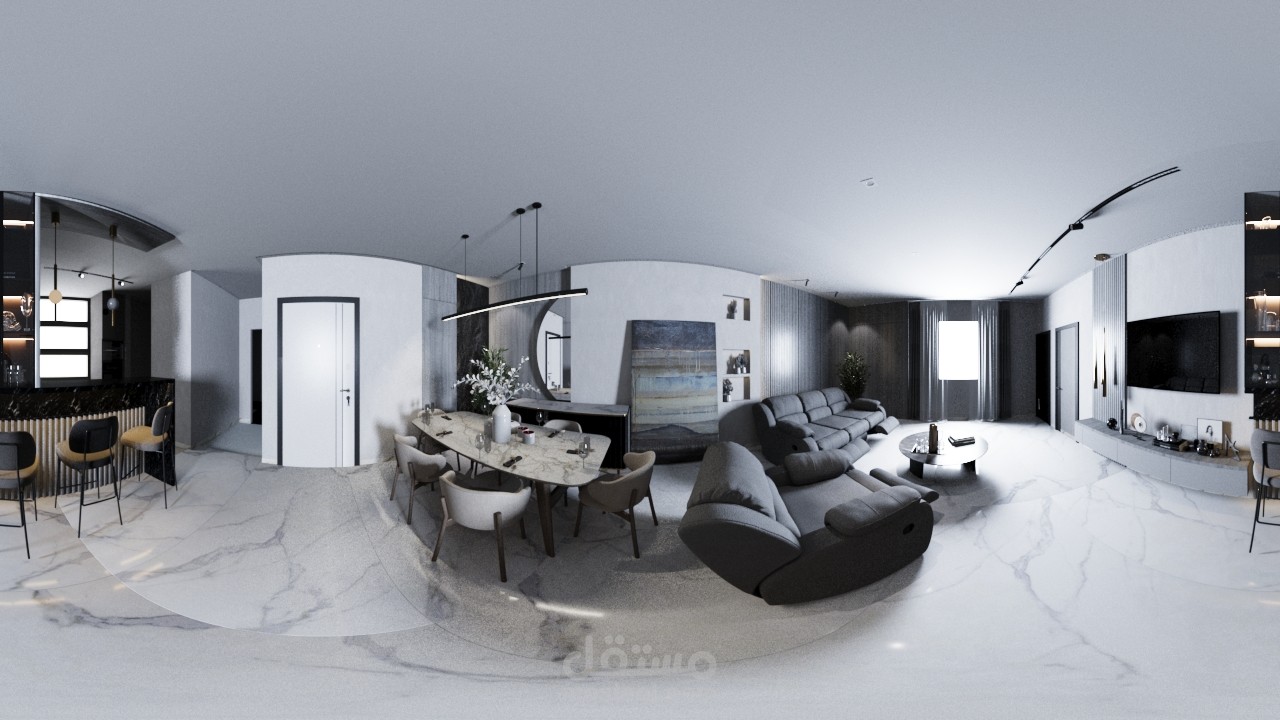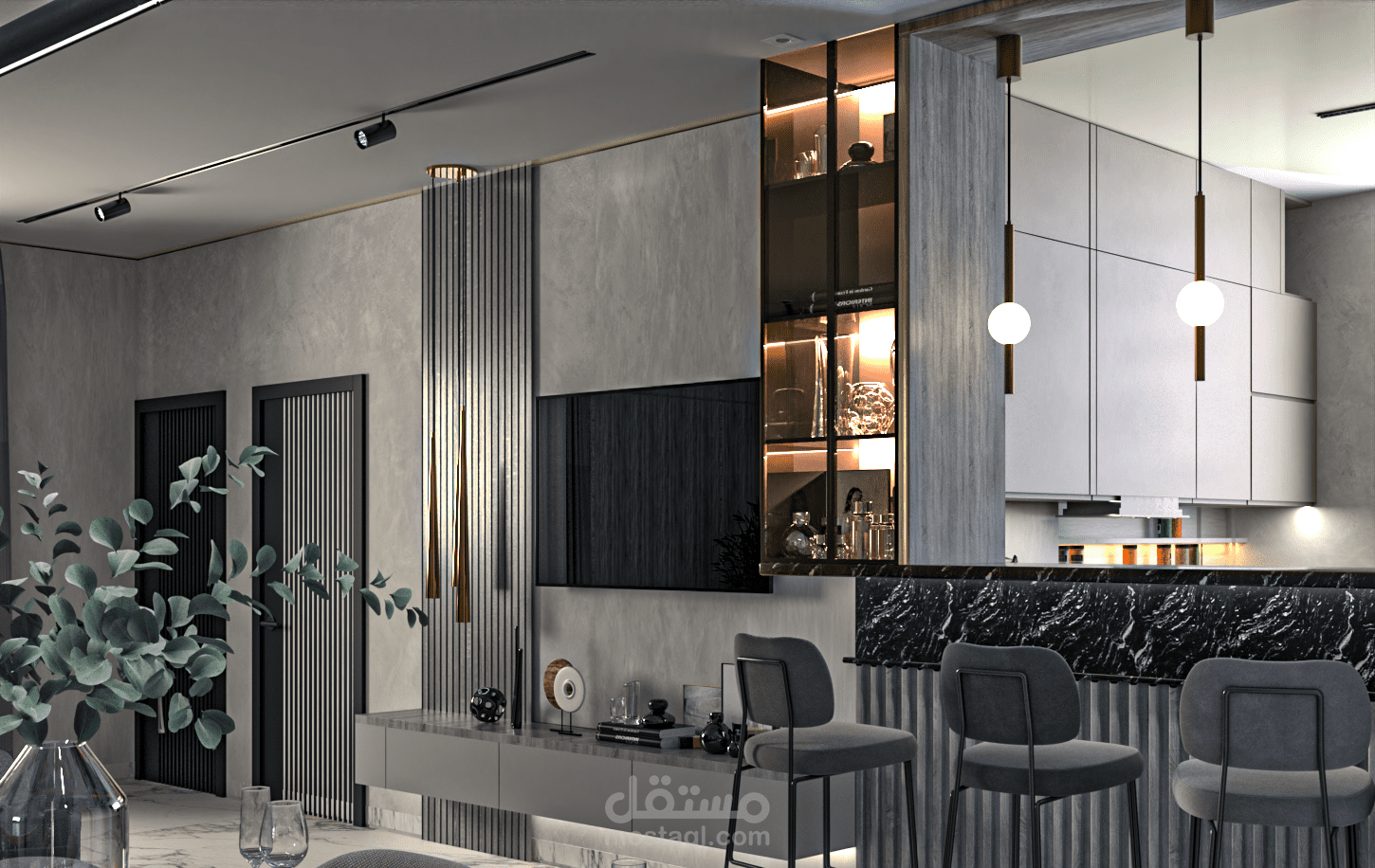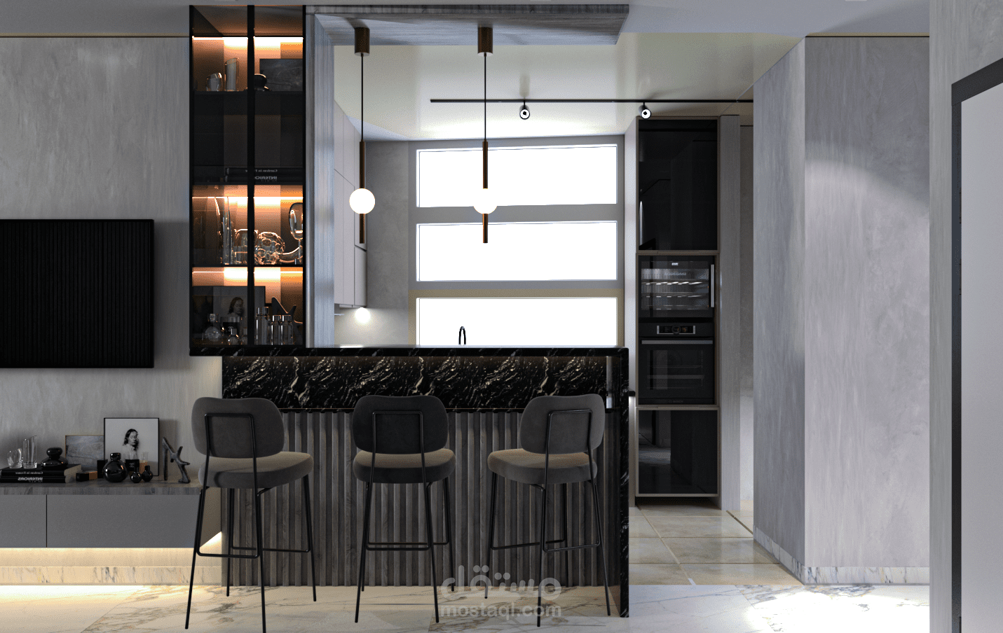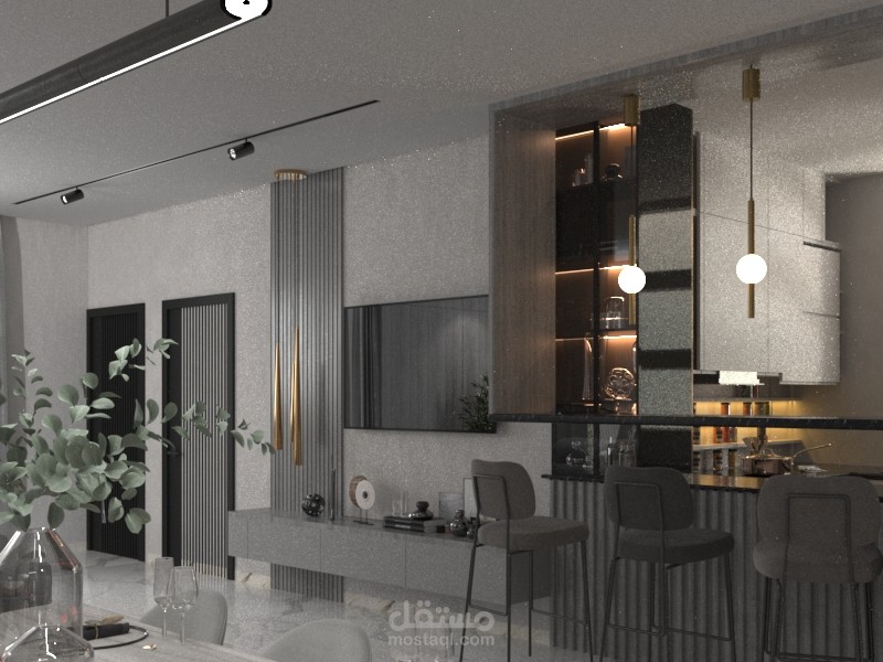 مشروع تصميم داخلي لوحدة سكنية يضم غرفة نوم ماستر ومنطقة استقبال مفتوحة (معيشة + سفرة) و غرفه ملابس و مطبخ يعتمد على أسلوب عصري هادئ بألوان محايدة ولمسات دافئة.