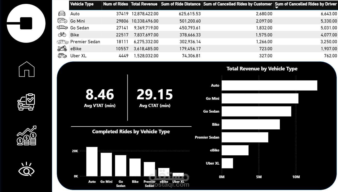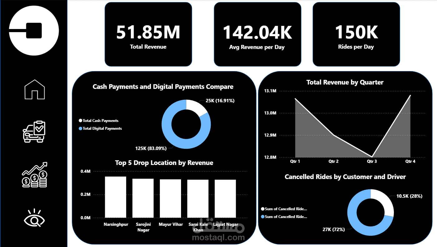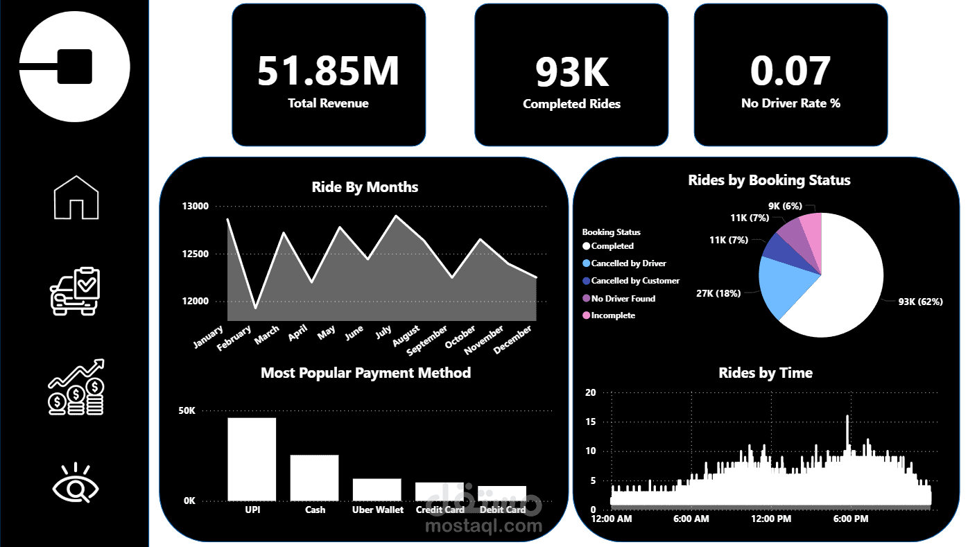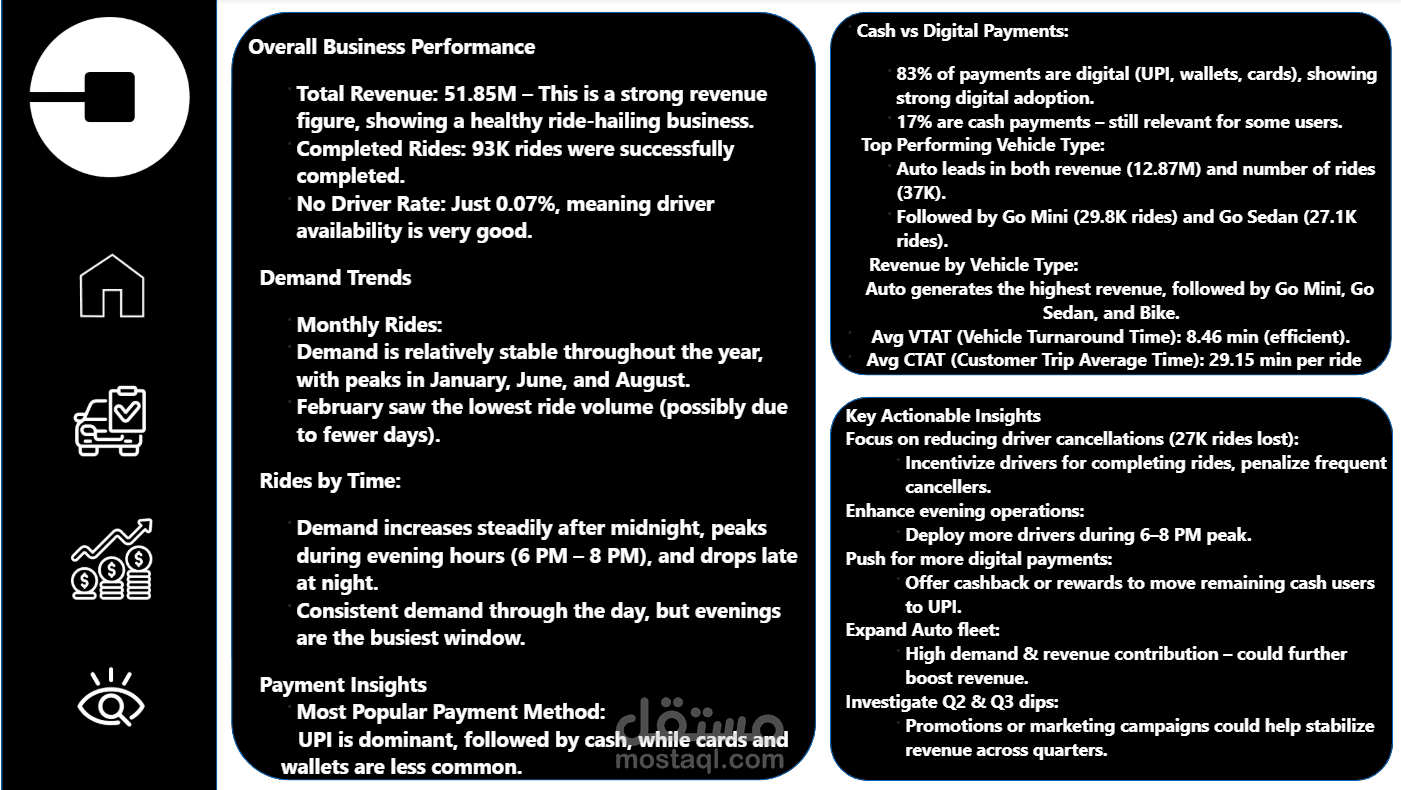 قمت بتصميم Dashboard لتحليل أداء تطبيق نقل ذكي (Ride-Hailing) على نمط Uber، لتحويل البيانات إلى رؤى تدعم اتخاذ القرار.