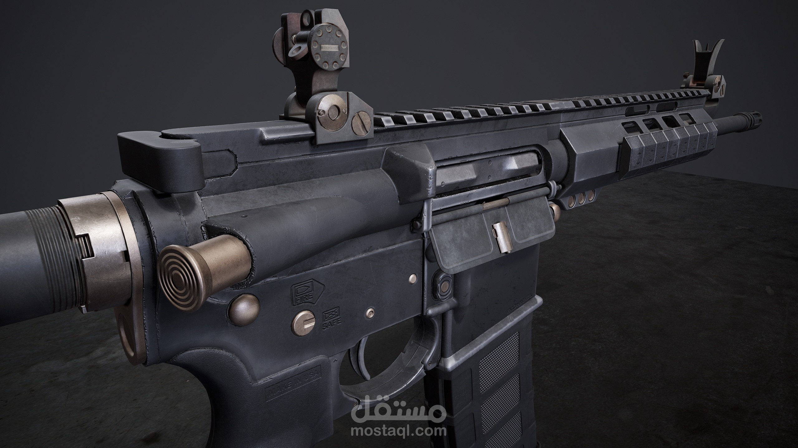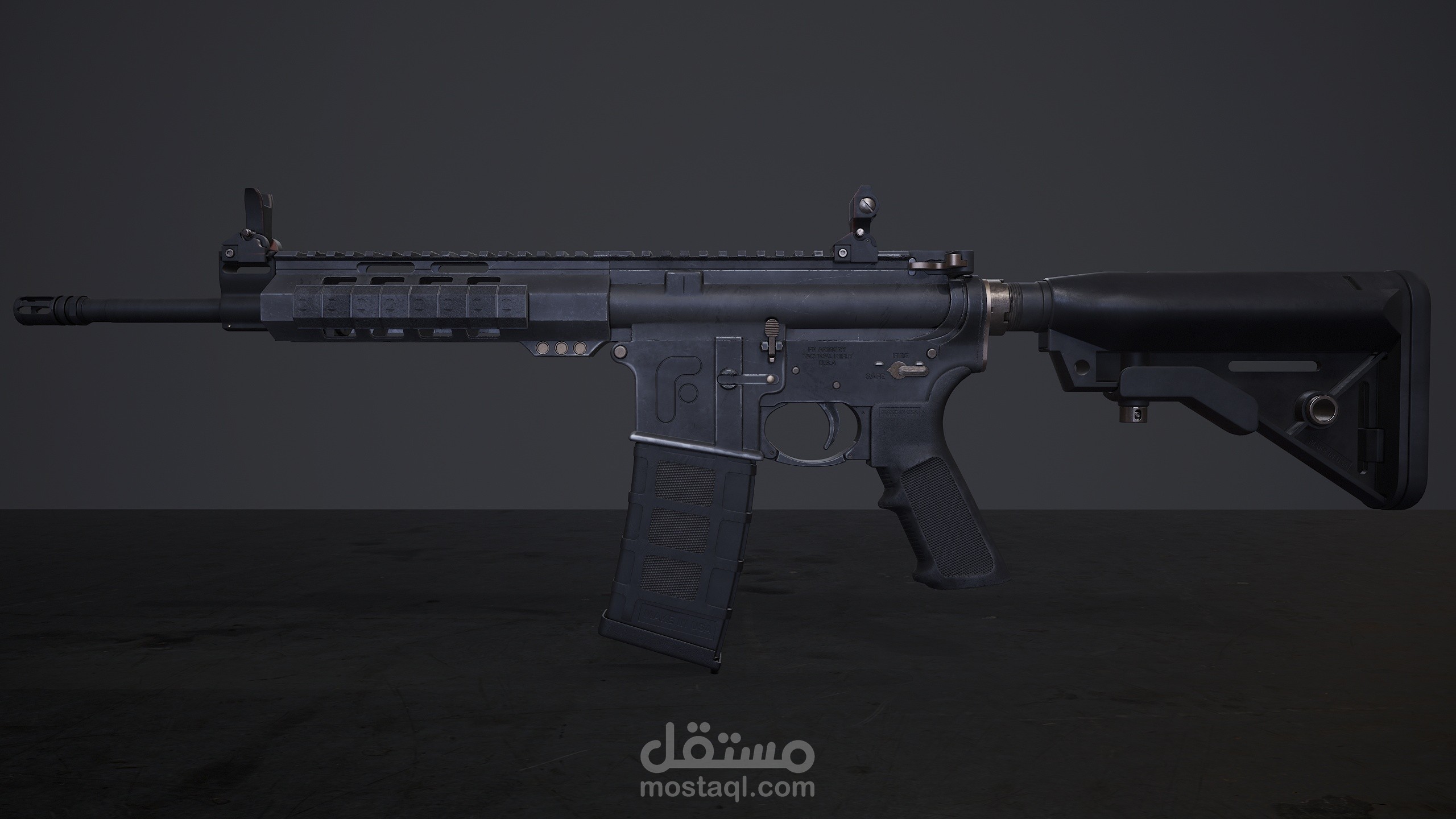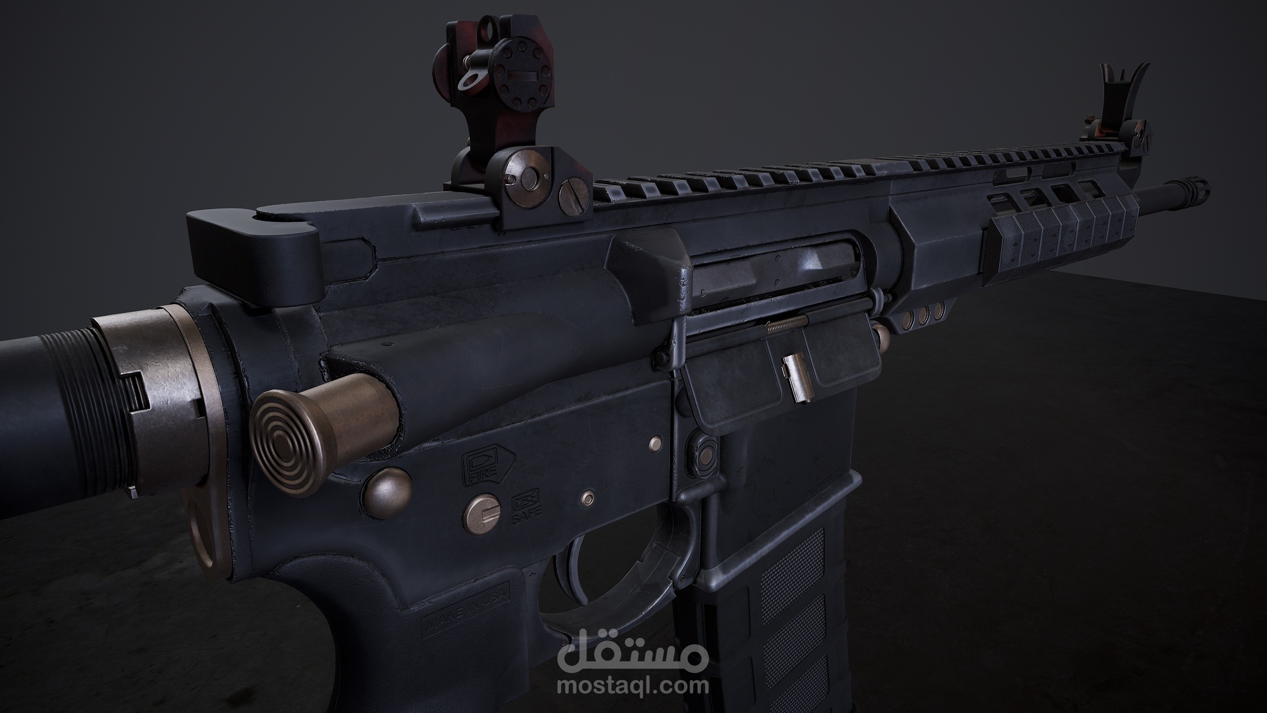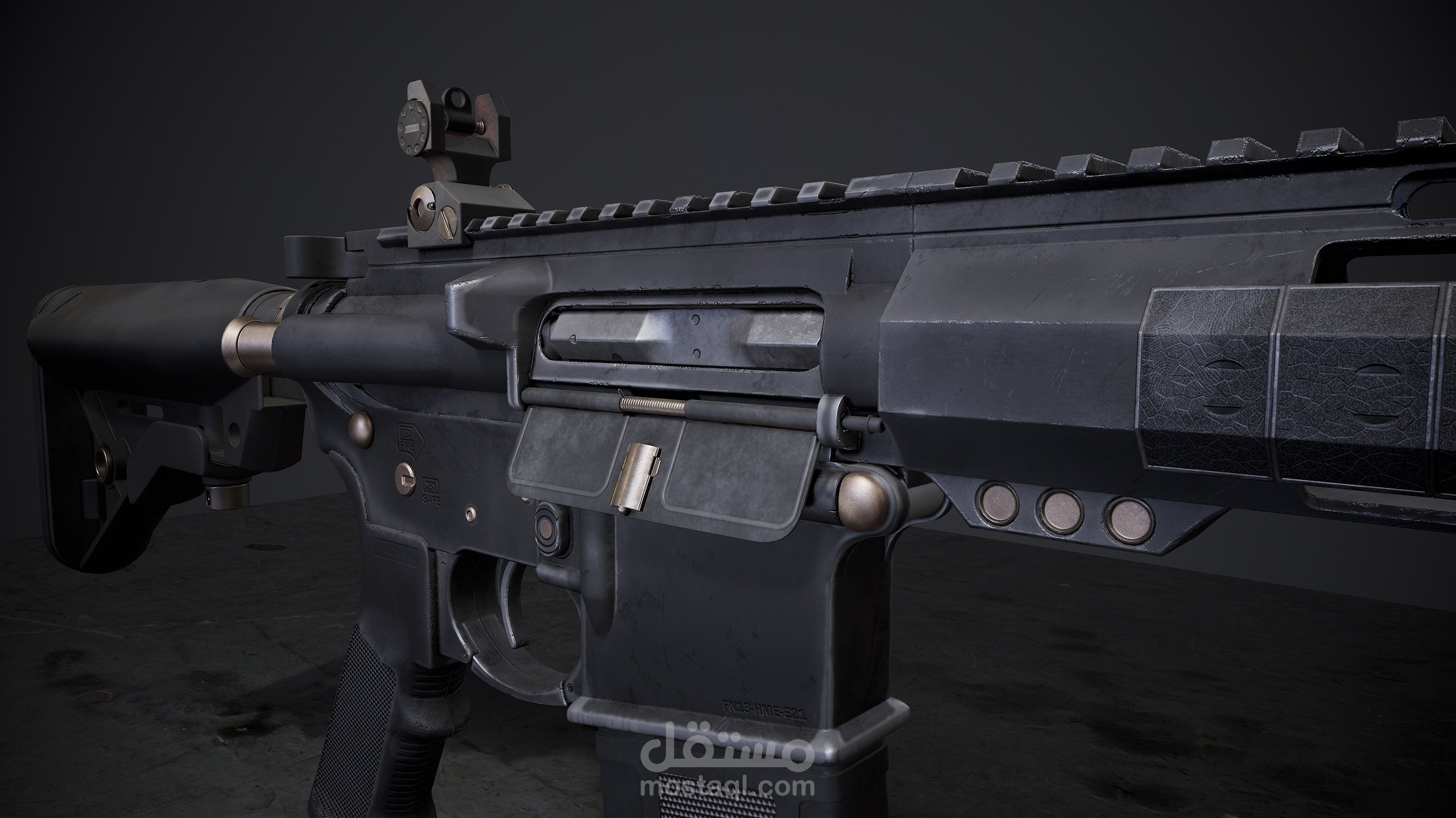نموذج ثلاثي الأبعاد لبندقية - تم تصميمه بالكامل من الصفر, مودلينج كامل للسلاح بجميع التفاصيل الميكانيكية الدقيقة ,تكستشرينج واقعي باستخدام PBR materials, تأثيرات الاستخدام والخدوش (Wear & Tear) لمظهر واقعي, إضاءة استوديو احترافية مع رندر عالي الجودة..