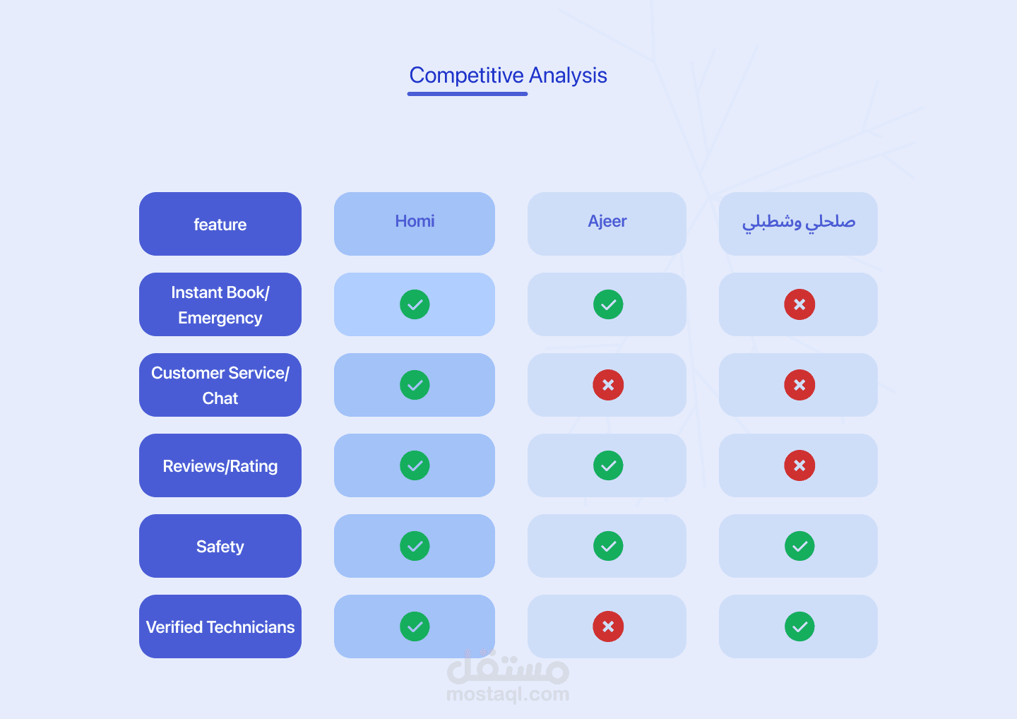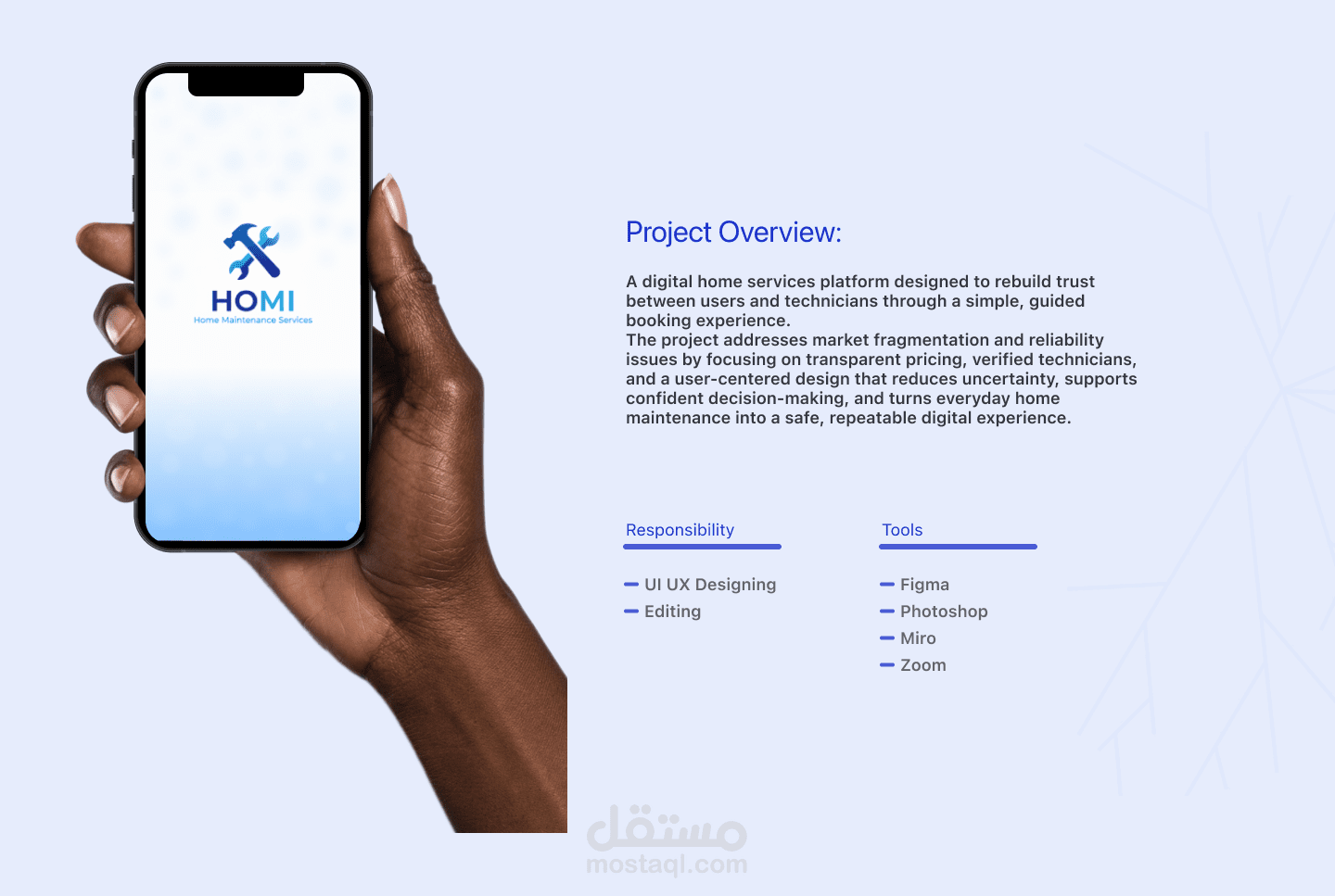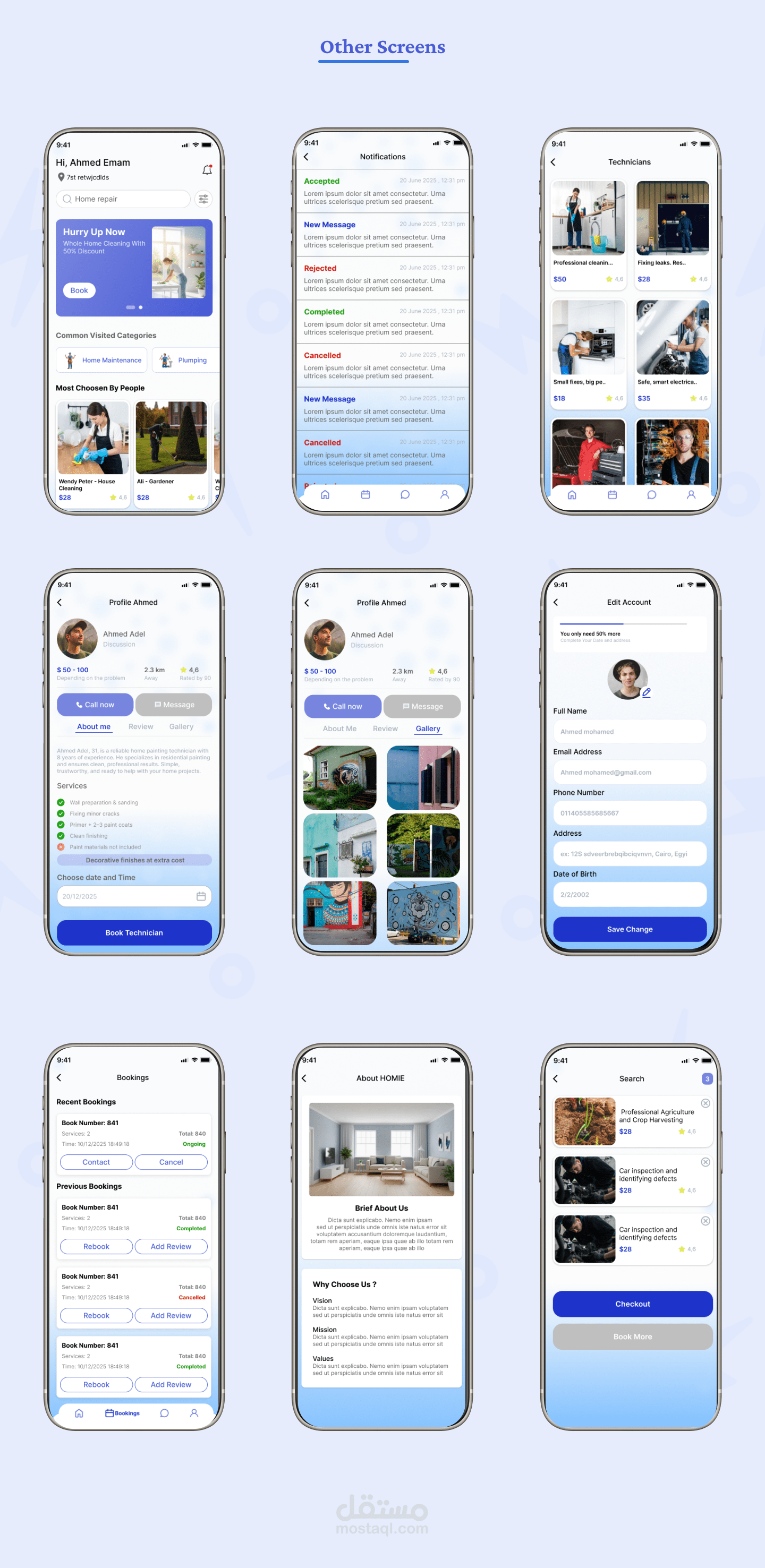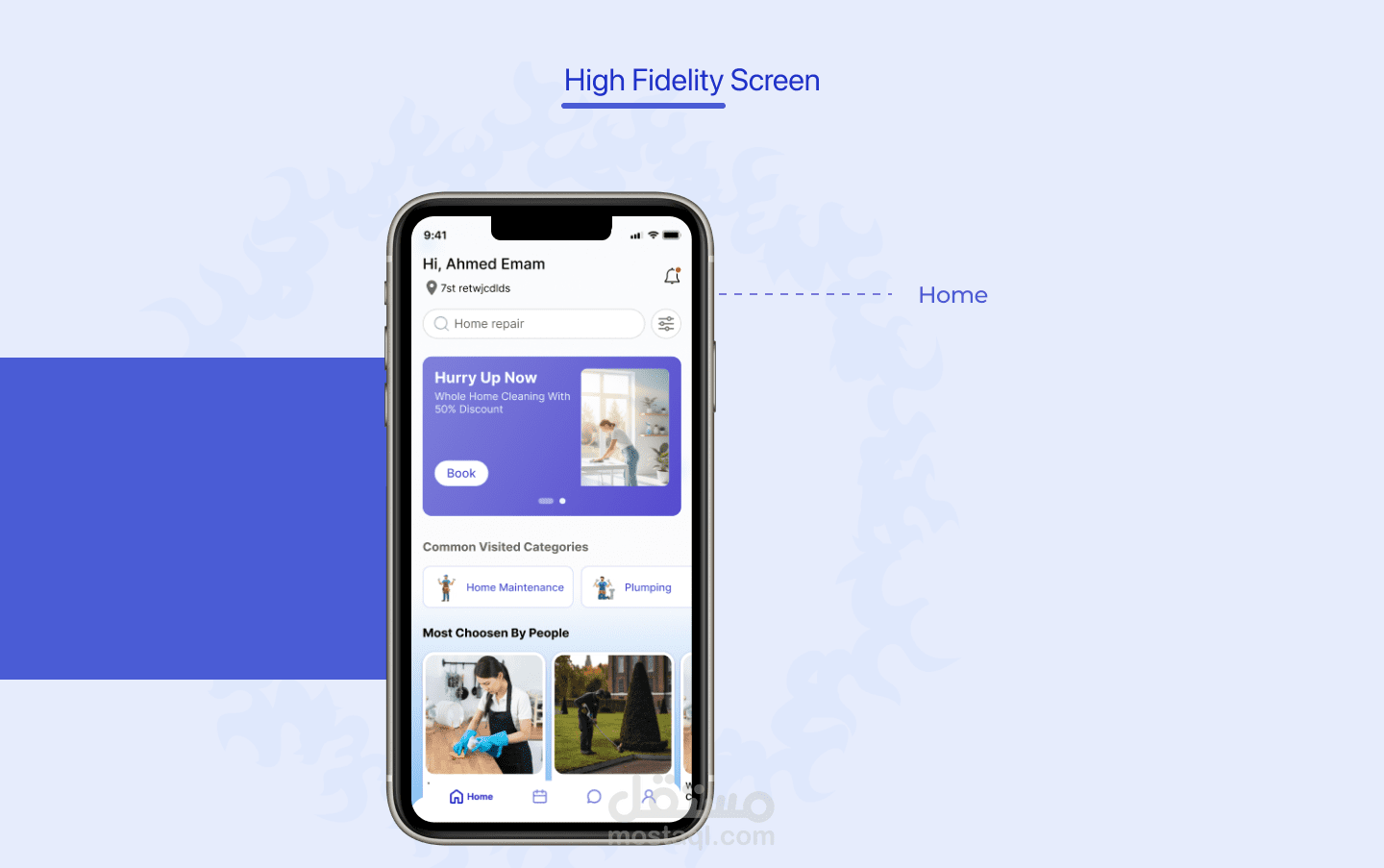 Homi هو تطبيق لخدمات المنزل يتيح للمستخدمين حجز خدمات مثل التنظيف، السباكة، الكهرباء وغيرها بسهولة.