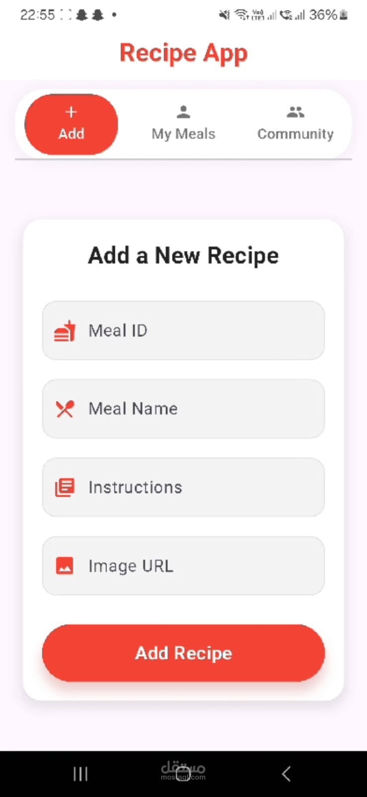مشروع Recipe App هو تطبيق موبايل مُصمم لإدارة وعرض الوصفات الغذائية بطريقة حديثة وسهلة الاستخدام. يتيح التطبيق للمستخدمين إضافة وصفات جديدة عبر إدخال بيانات مثل رقم الوجبة (Meal ID)، اسم الوجبة، خطوات التحضير (Instructions)، ورابط الصورة (Image URL). يوفر التطبيق تجربة تصفح مريحة من خلال عرض الوجبات على شكل كروت جذابة تحتوي على صور وأسماء الأطباق.