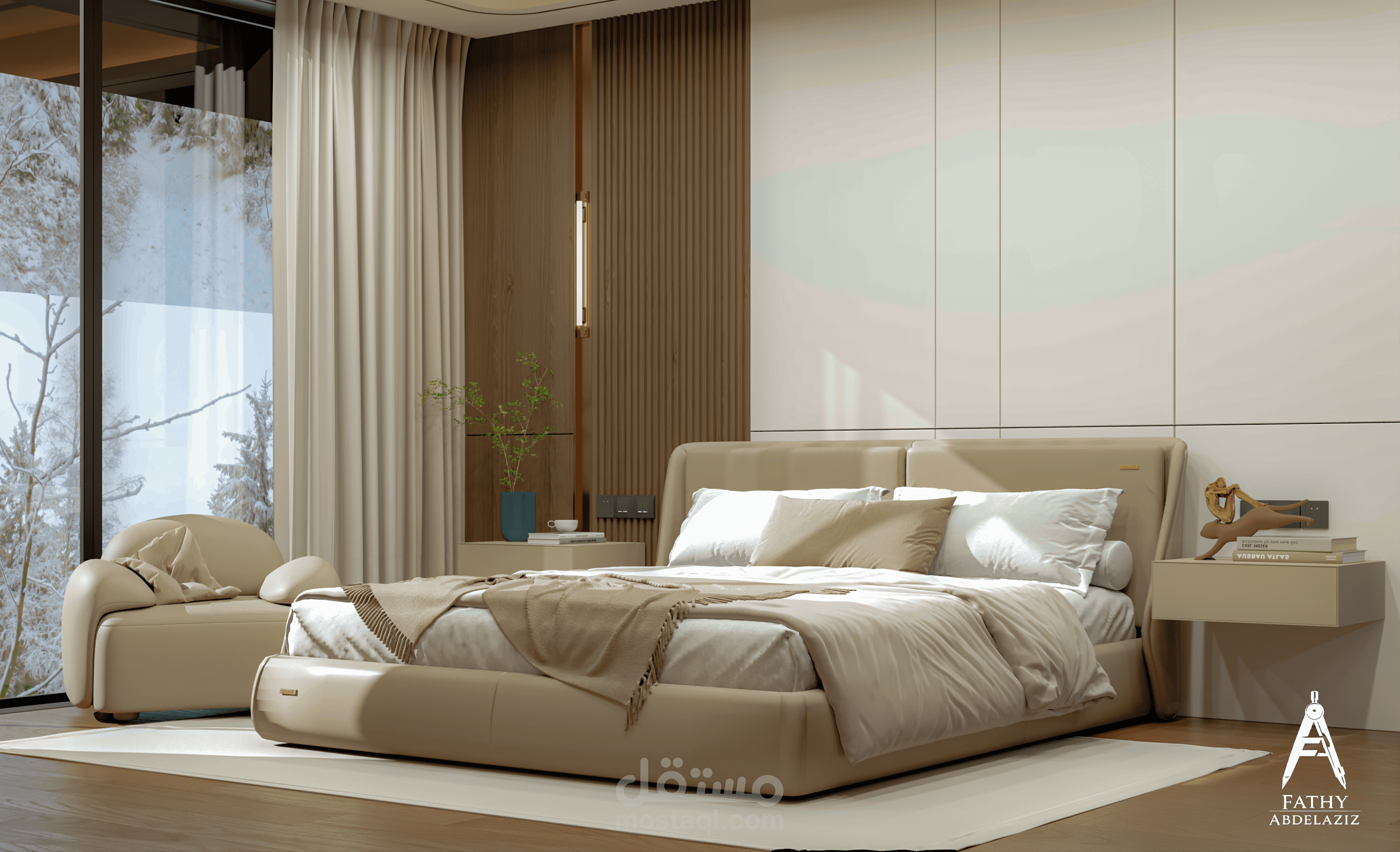 التصميم ده لغرفة نوم مودرن بطابع دافئ ورايق بيعتمد على تناغم الألوان الهادية والخامات الطبيعية