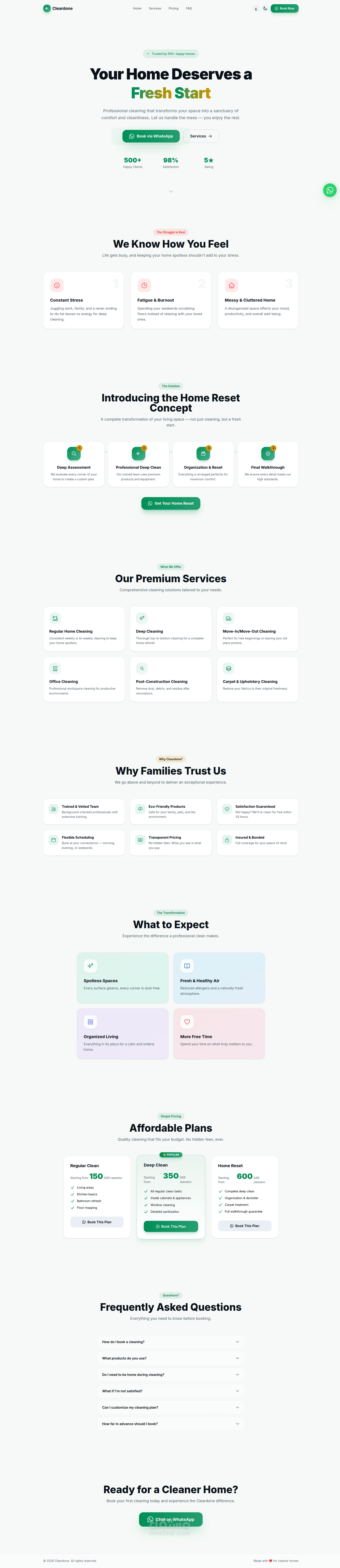 أقوم بإنشاء صفحة هبوط احترافية ومتجاوبة بالكامل لخدمة Cleardone Cleaning Service باستخدام Tailwind CSS، مع اعتماد أسلوب Mobile-First لضمان الأداء المثالي على جميع الأجهزة.
