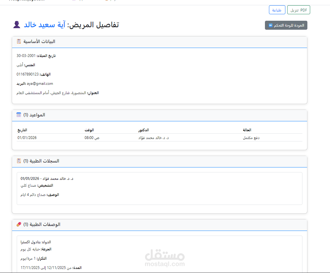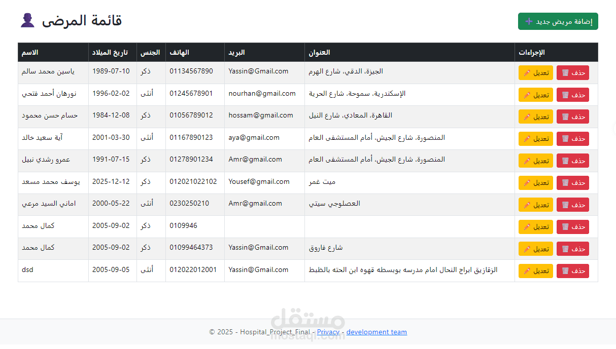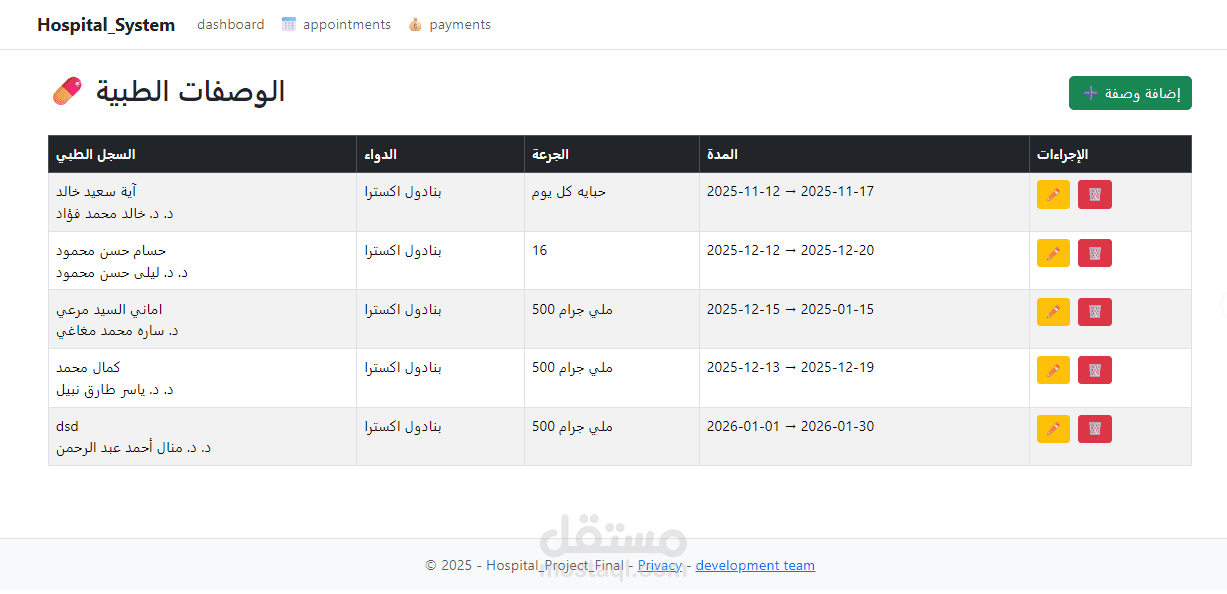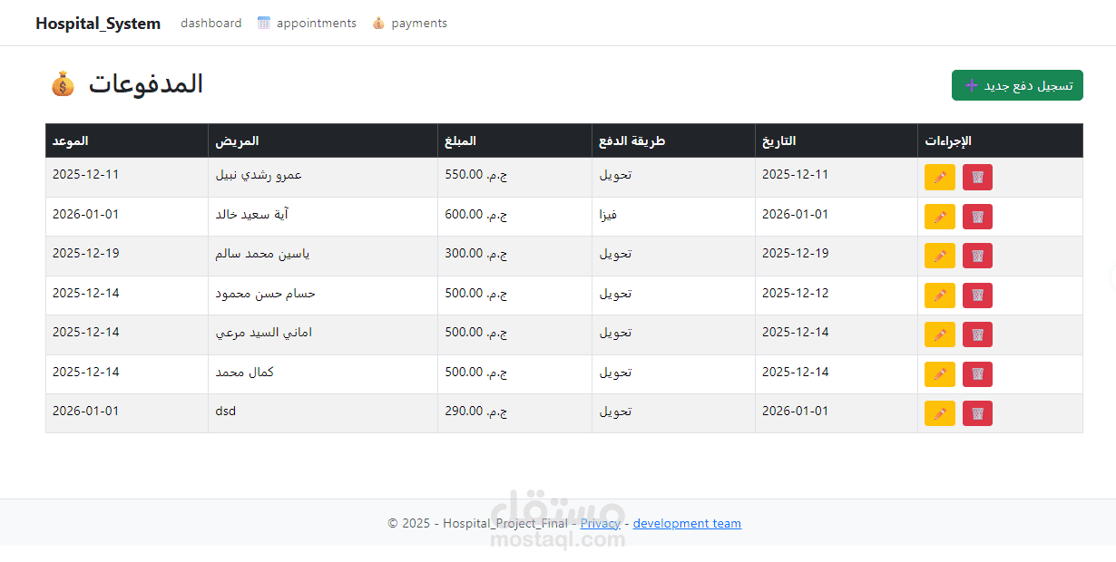 تصميم وتنفيذ نظام متكامل لإدارة العمليات اليومية في المستشفى، يشمل تسجيل المرضى، جدولة المواعيد، إدارة الأطباء والموظفين، تتبع العلاجات، وإصدار الفواتير — كل ذلك عبر واجهة ويب سهلة الاستخدام.