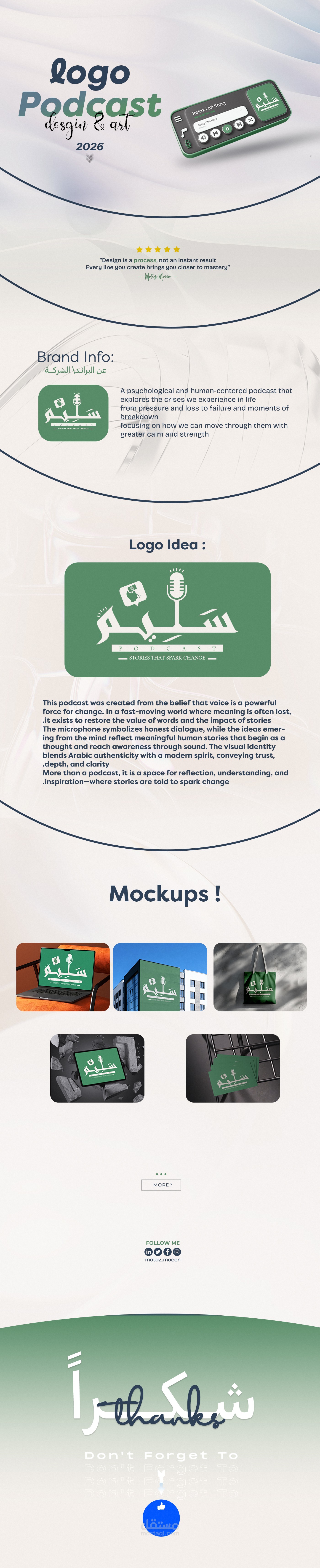 This presentation showcases the visual identity design for a podcast brand built around the power of voice and meaningful storytelling. The project reflects a thoughtful balance between psychological depth, human-centered narratives, and modern design aesthetics. The presentation walks through the brand concept, logo idea, and visual applications, highlighting how the identity translates across digital and physical mockups. Each design element was carefully crafted to convey clarity, calmness, and emotional connection, aligning with the podcast’s mission to explore life’s challenges and inspire awareness and growth. This identity is designed not only to represent a podcast, but to create a cohesive, recognizable, and impactful brand presence that communicates purpose, trust, and transformation through sound and story.