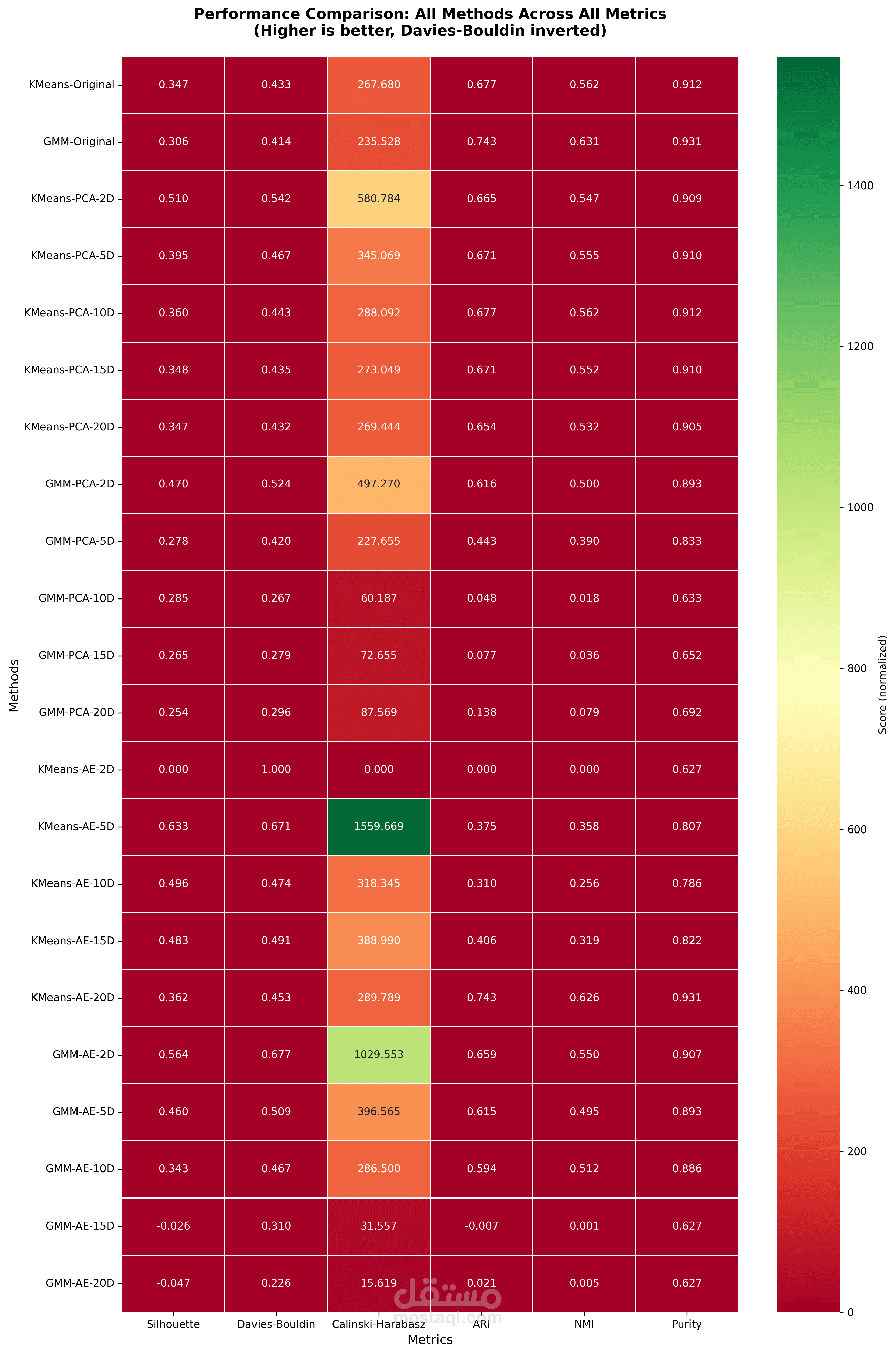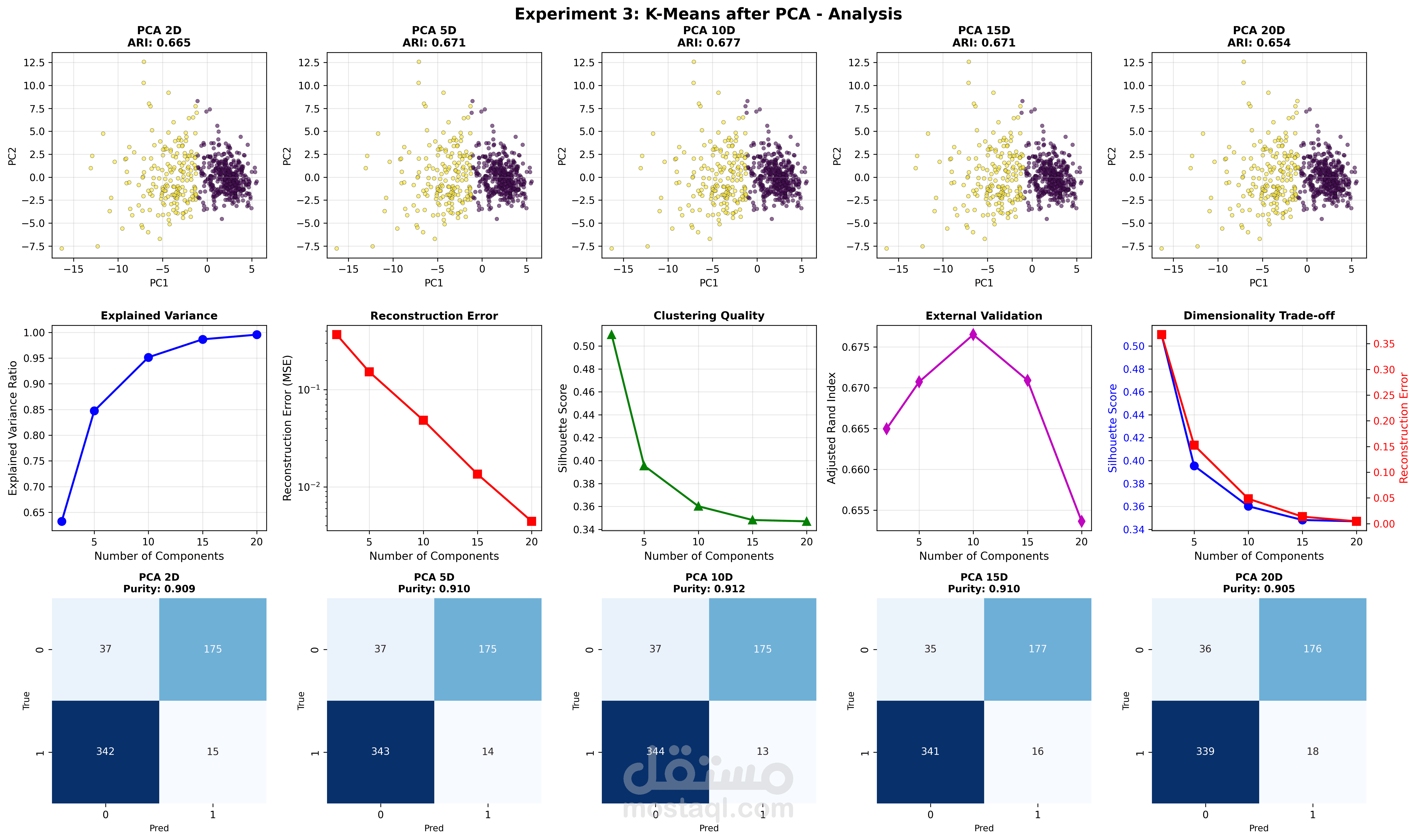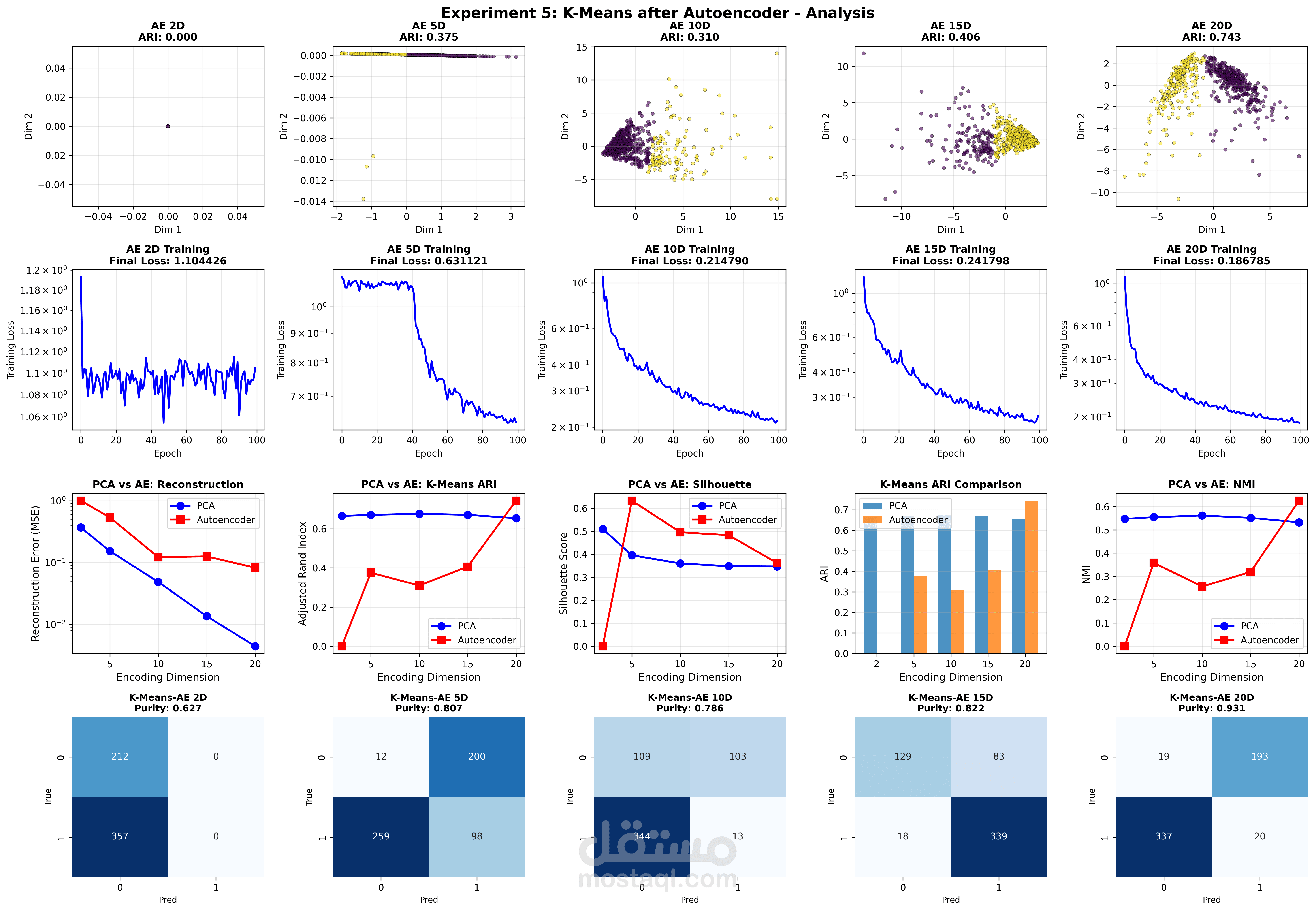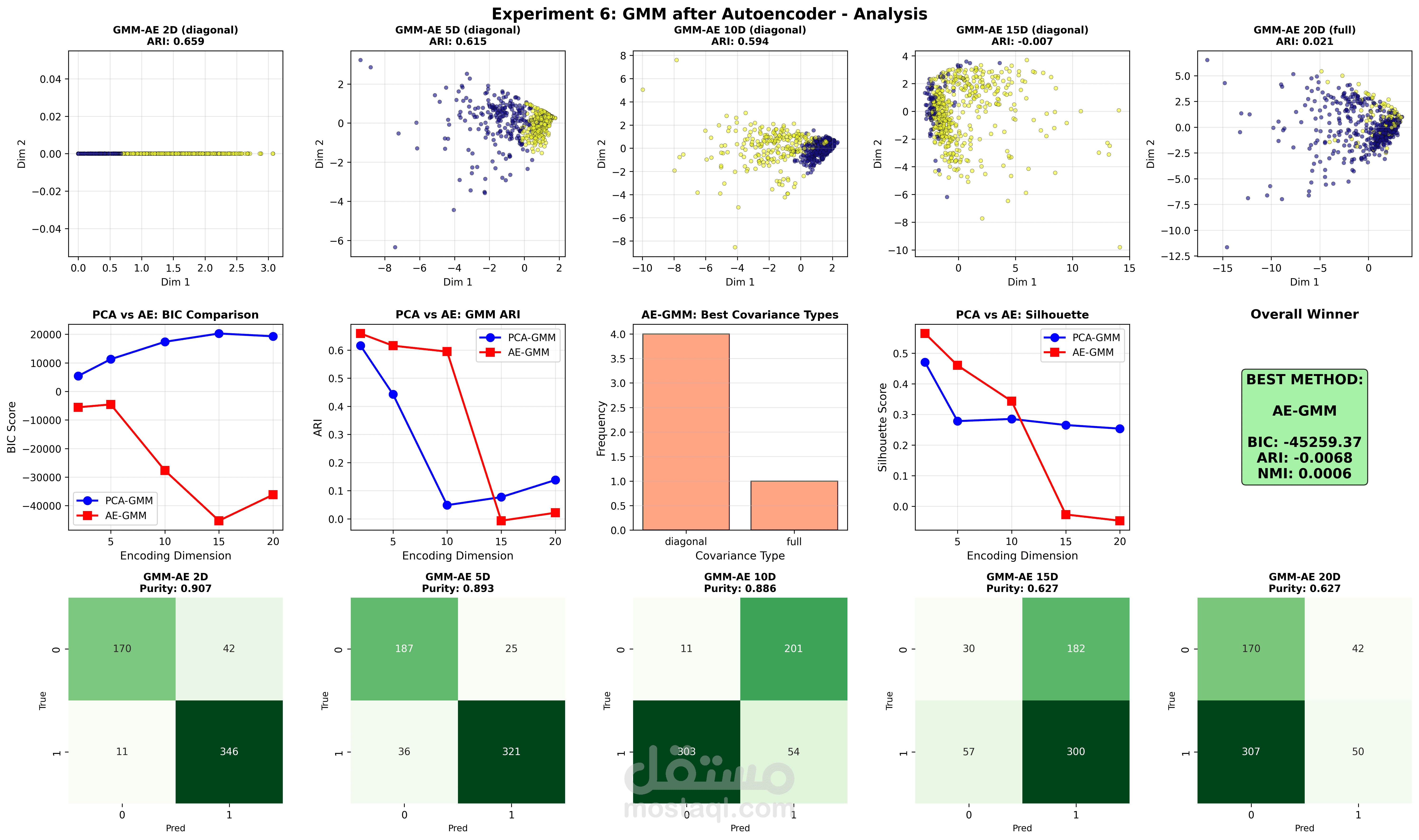 يشمل المشروع تطبيق ومقارنة خوارزميات K-Means وGaussian Mixture Model (GMM) إلى جانب تقنيات تقليل الأبعاد مثل PCA وAutoencoder، مع تقييم الأداء باستخدام مقاييس متعددة مثل Silhouette Score وARI وNMI.