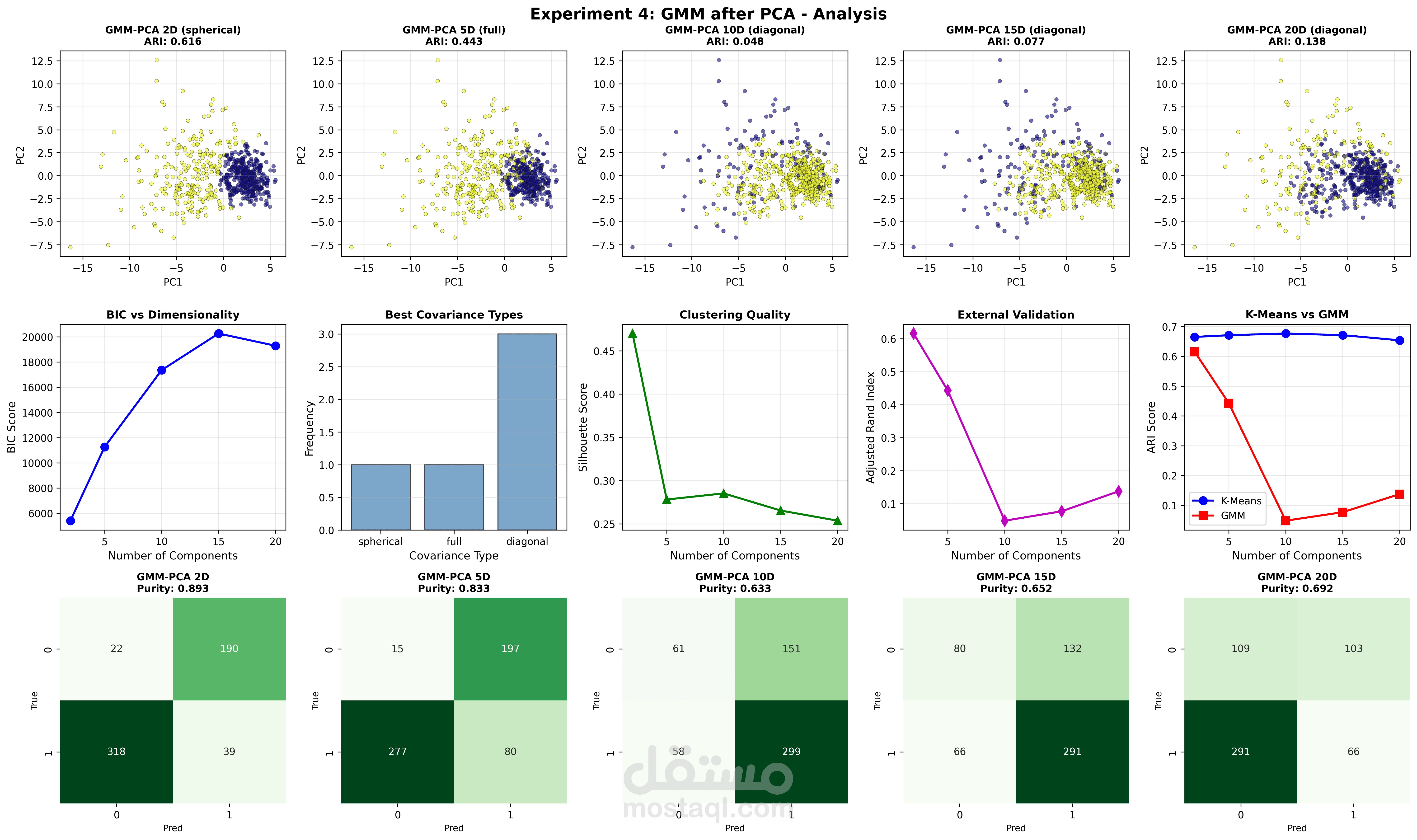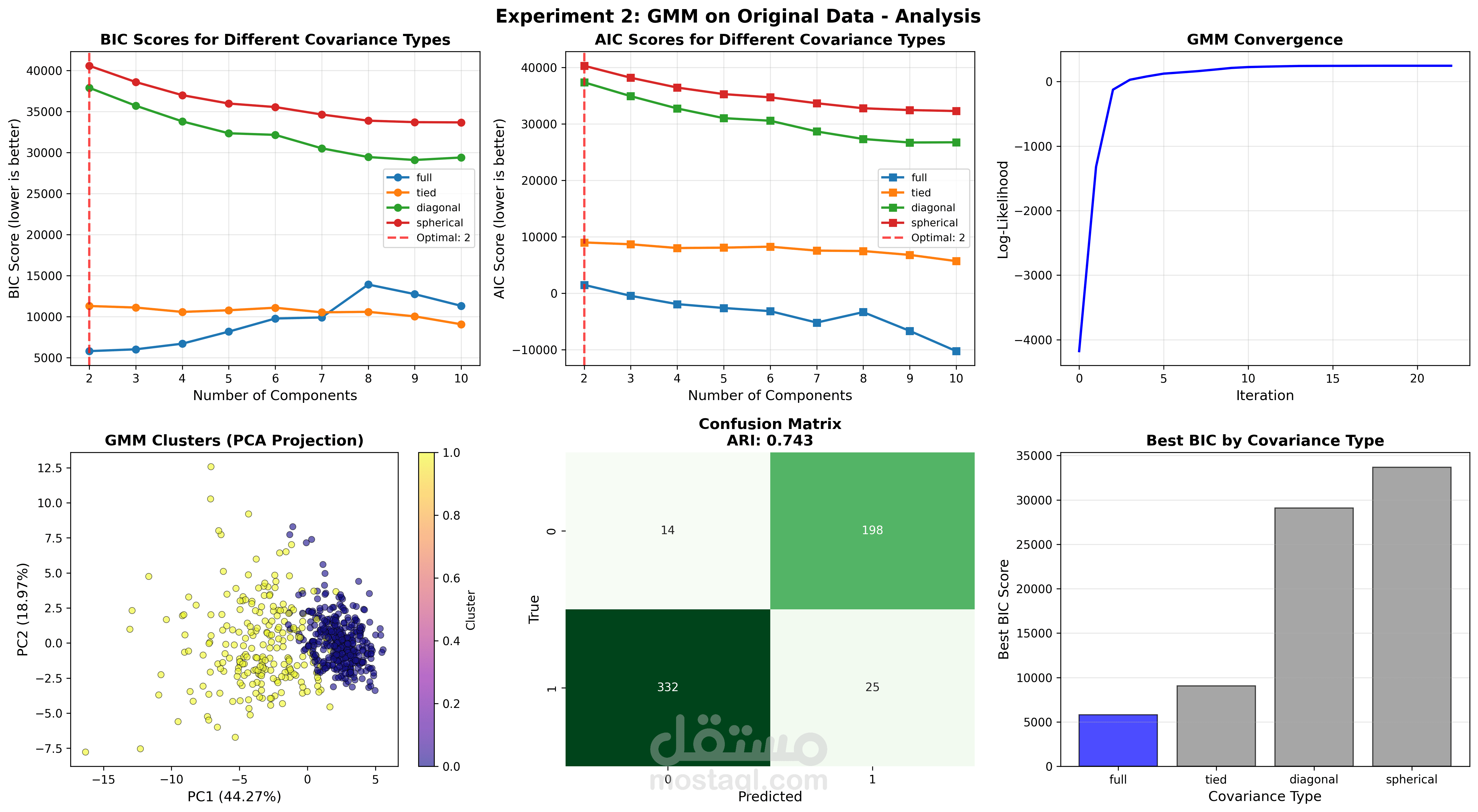 يركز المشروع على الفهم الرياضي العميق، الاستقرار العددي، اختيار النموذج الأمثل (BIC/AIC)، وتحليل تأثير تقليل الأبعاد على جودة التجميع، مع مقارنة منهجية للنتائج لاستخلاص أفضل نموذج أداءً.