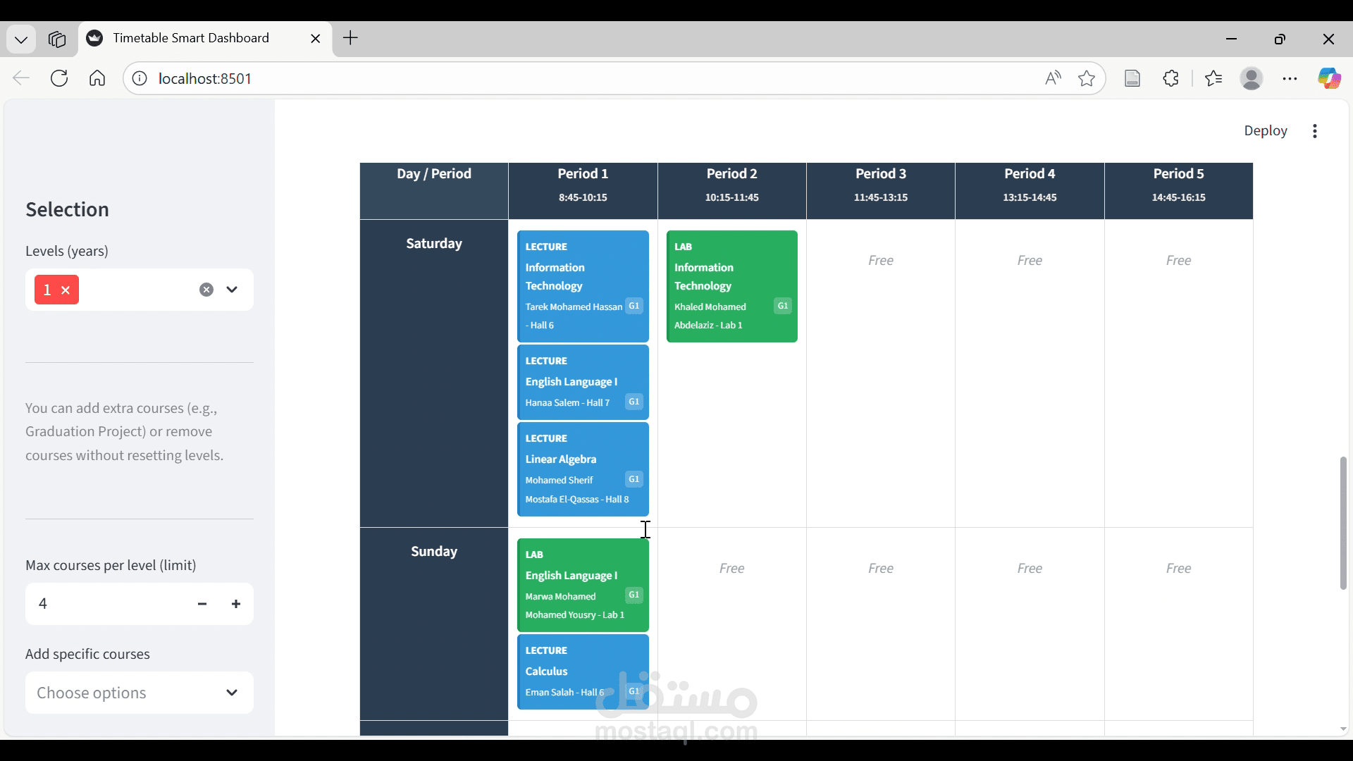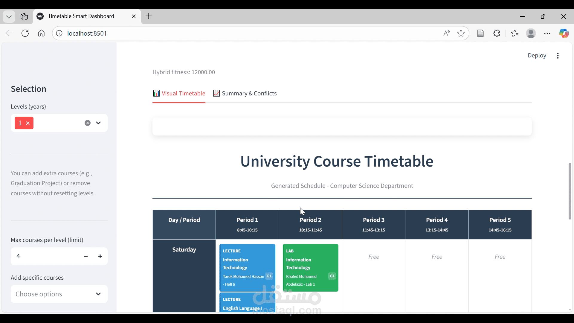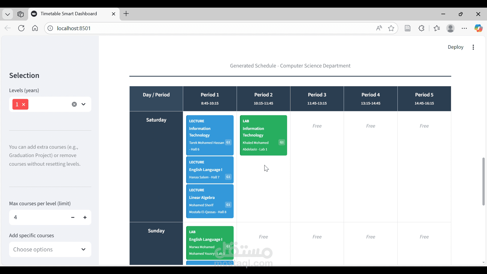 Automatic generation of weekly timetables (Saturday–Thursday).