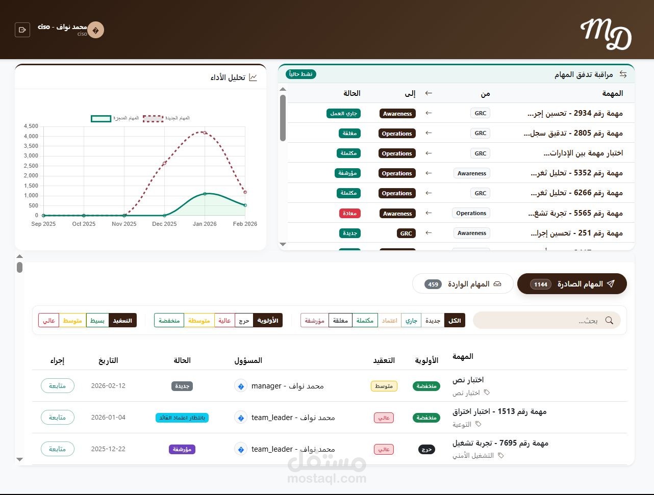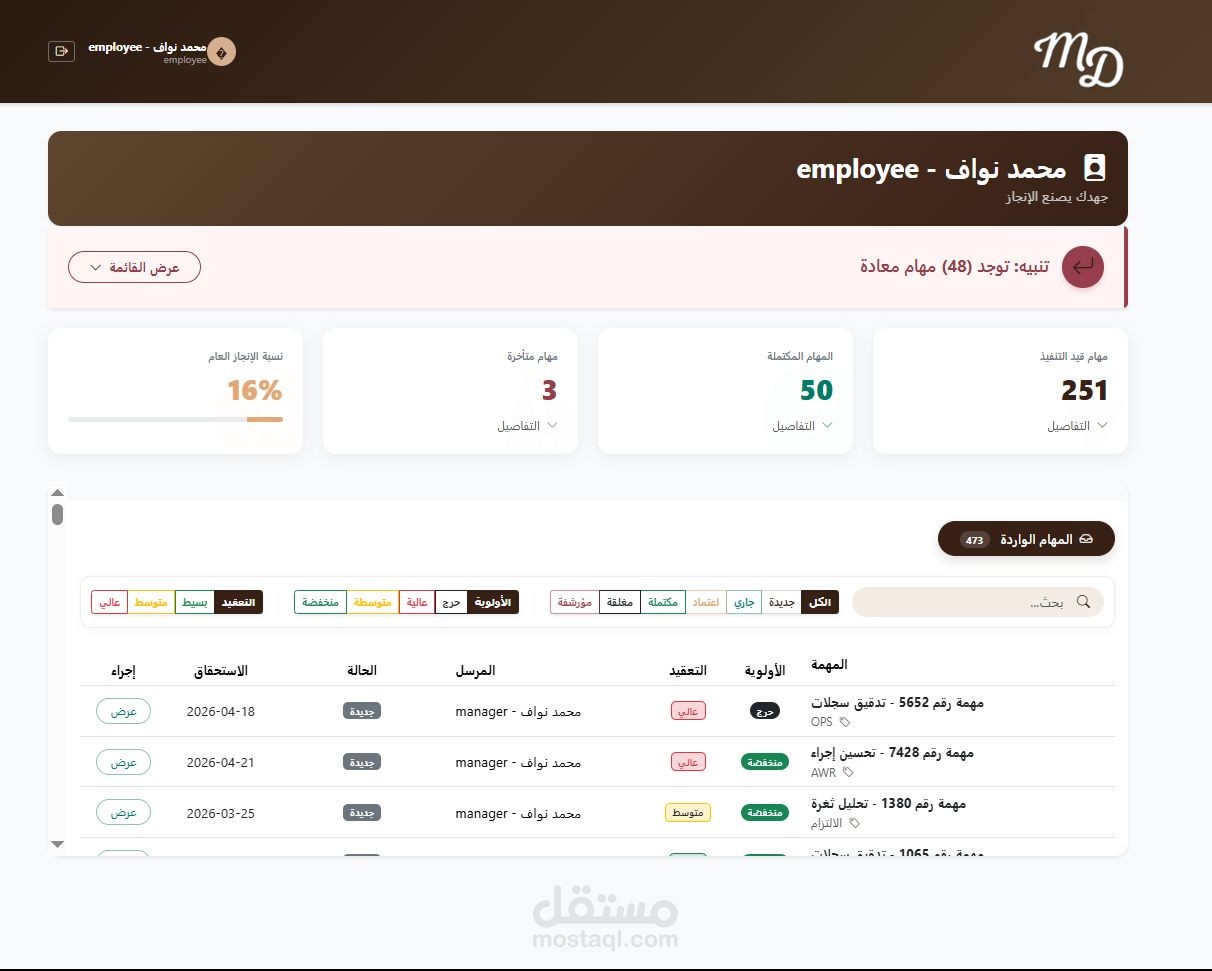 مشروع عبارة عن منصة ويب متكاملة لإدارة المهام والمشاريع، تتيح للمستخدمين إنشاء المشاريع، تقسيمها إلى مهام، تحديد المواعيد النهائية، وتوزيع الأدوار بين أعضاء الفريق، مع لوحة تحكم تفاعلية لعرض تقدم العمل والإحصائيات.