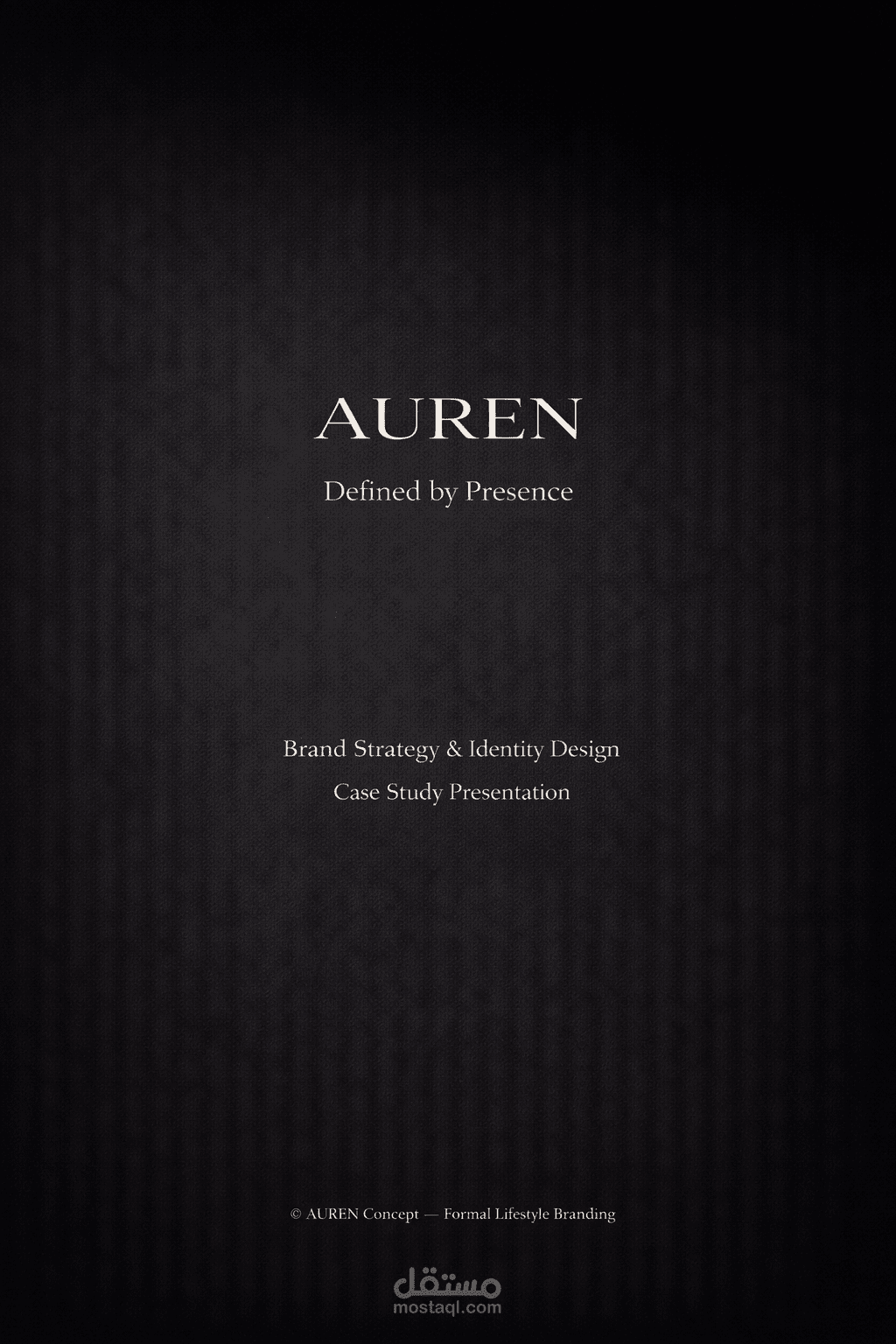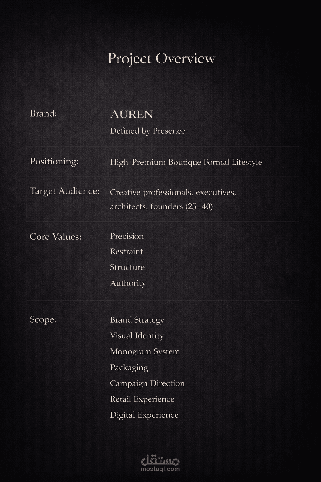 لوحة الألوان داكنة، مع درجات من الفحم العميق والذهب الباهت، مما يجسد حضور البراند الخالد والمبسط. تم تصميم كل عنصر بعناية، حيث يعمل كل جزء من نظام الهوية البصرية معًا لإنشاء لغة بصرية تشعر بالهيبة ولكنها هادئة.