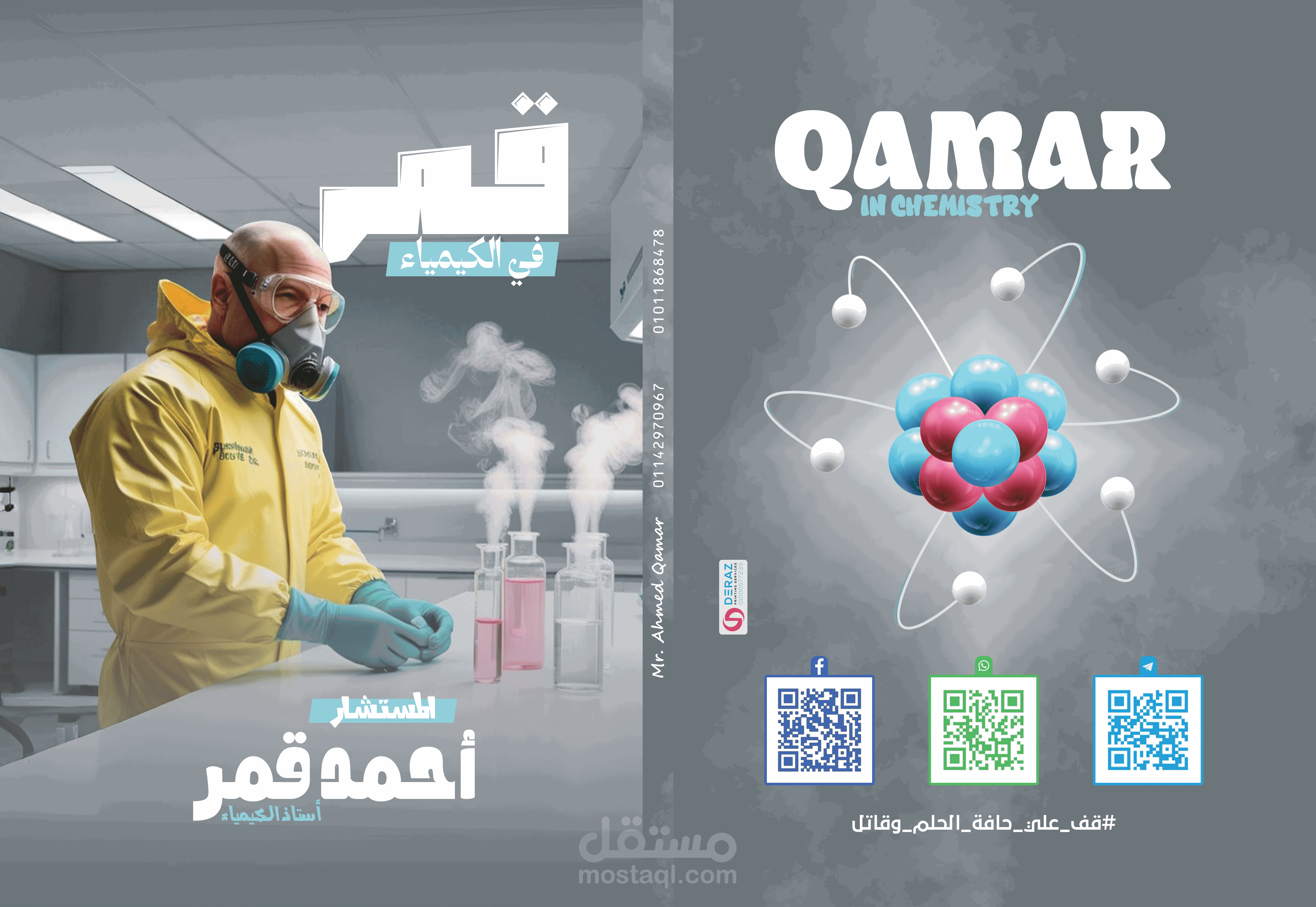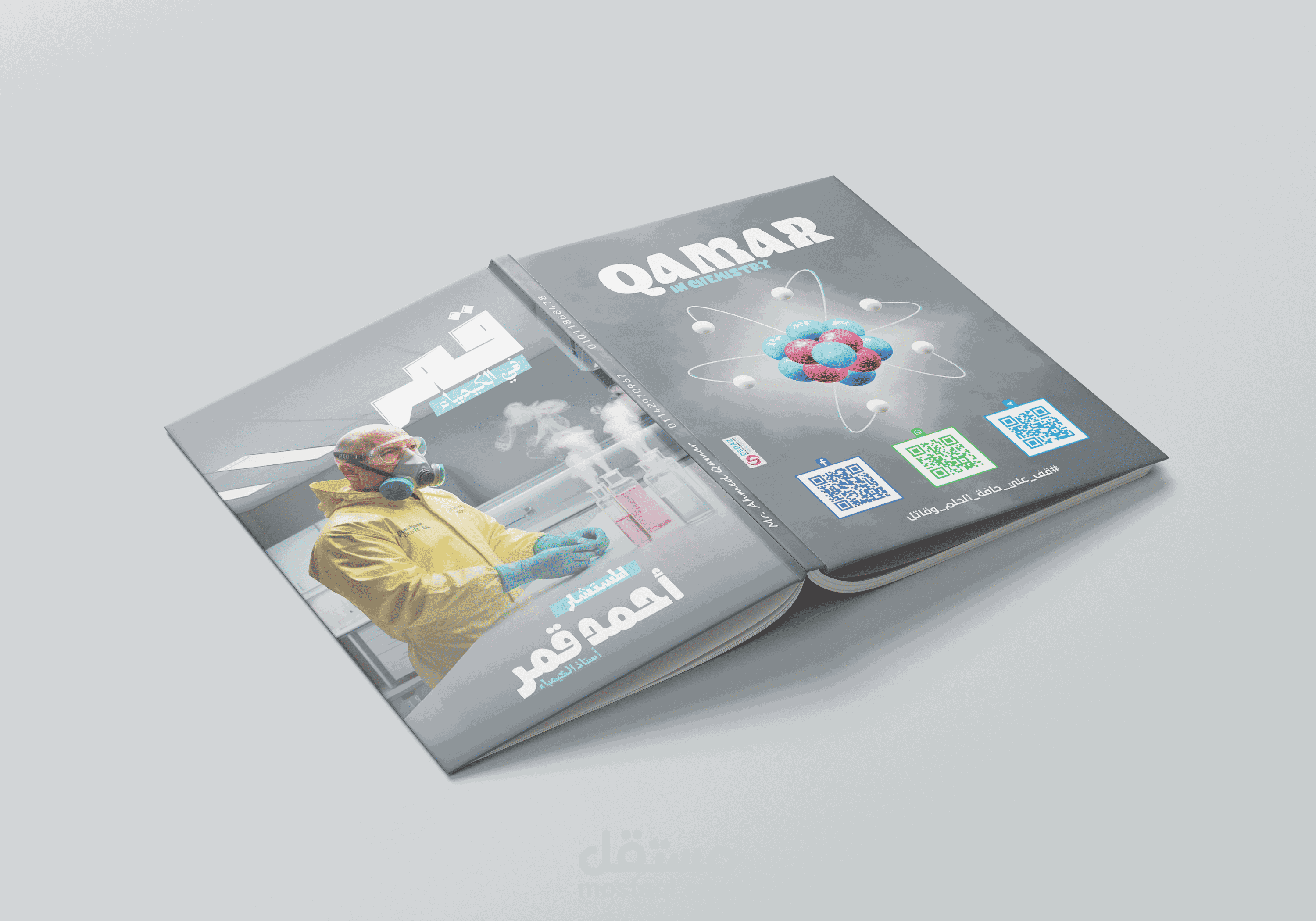 This chemistry book cover was designed to deliver a clear, modern, and professional educational look. The concept blends realistic laboratory imagery with clean typography to instantly communicate the subject to students and teachers. The front cover shows a scientist in a lab environment, while the back features a 3D atomic model to visually reinforce the chemistry theme.