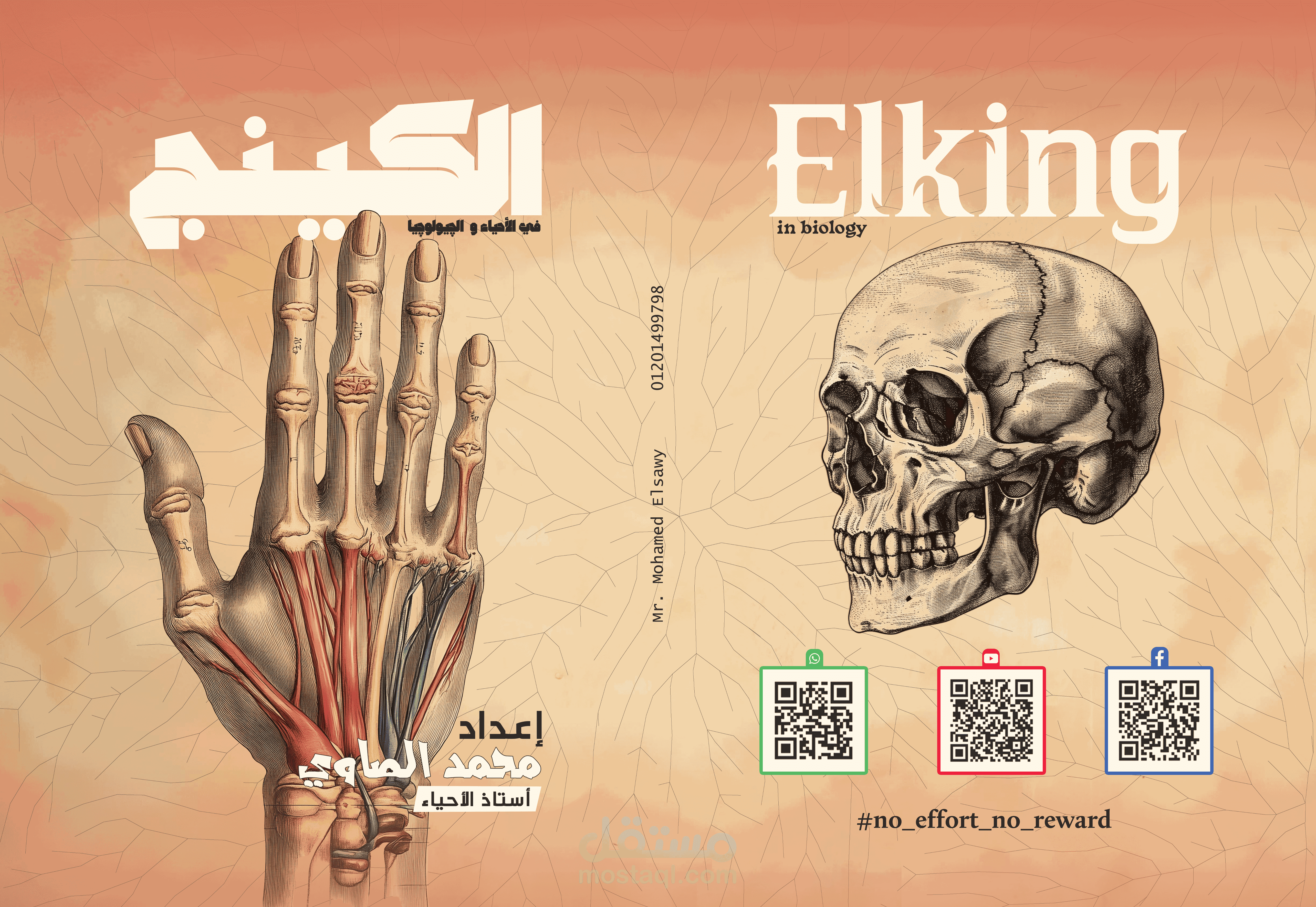 This biology book cover was designed in a vintage anatomical illustration style to give the subject a timeless, scientific character. The concept relies on detailed engraved drawings of a human skull and hand muscles, inspired by classic medical textbooks, to immediately communicate depth, accuracy, and educational value. These illustrations create a strong visual identity that connects the viewer with the foundations of human biology.