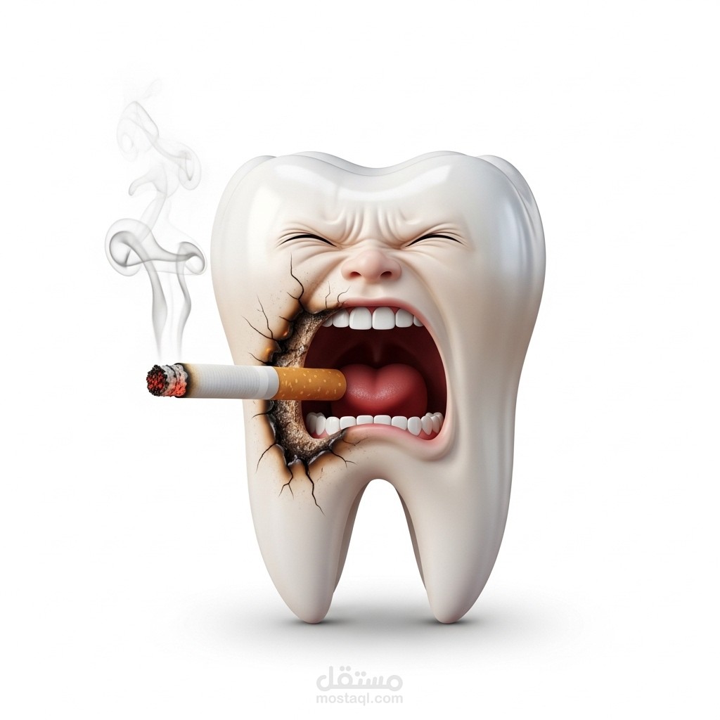 تصميم توعوي بصري يسلّط الضوء على التأثير المدمر للتدخين على صحة الأسنان، باستخدام أسلوب Conceptual Advertising حيث تم تجسيد الضرس كشخص يتألم، بينما تمثل السيجارة مصدر الضرر المباشر.