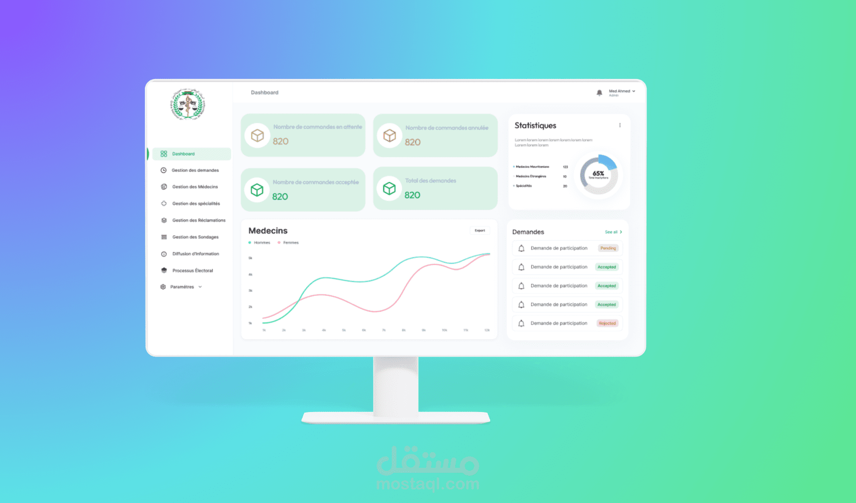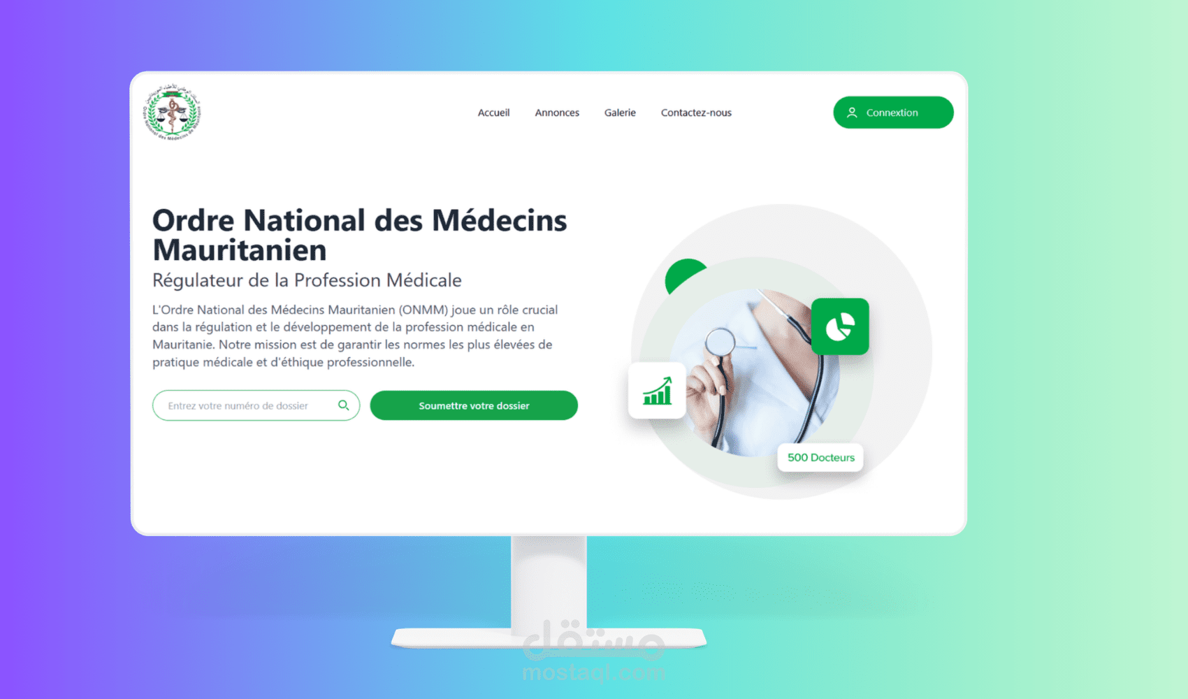 قمت بتصميم وتطوير منصة ويب متكاملة خاصة بهيئة Ordre des Médecins، تجمع بين موقع رسمي تعريفي ولوحة تحكم إدارية لإدارة طلبات الانضمام وبيانات الأطباء.