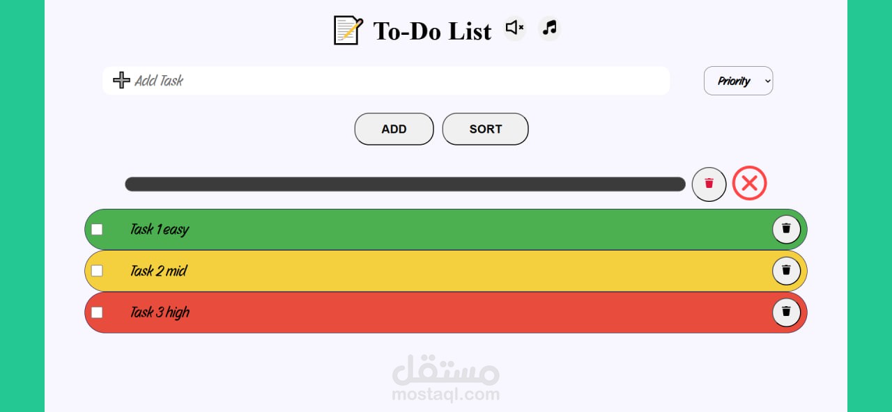تطبيق ويب لإدارة المهام اليومية يتيح إضافة المهام مع تحديد مستوى الأولوية (Low / Medium / High)، حيث يتم تغيير لون المهمة و امكانية ترتيبها بناءً على مستوى الأهمية لتحسين تنظيم الوقت وزيادة الإنتاجية.