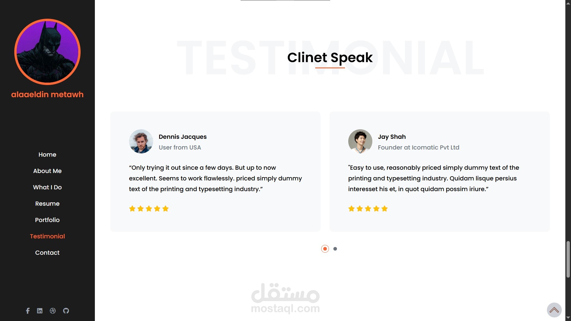 - قسم Testimonials بتصميم مخصص باستخدام Radio Buttons مع تخصيص كامل عبر HTML وCSS وتحكم تفاعلي باستخدام JavaScript