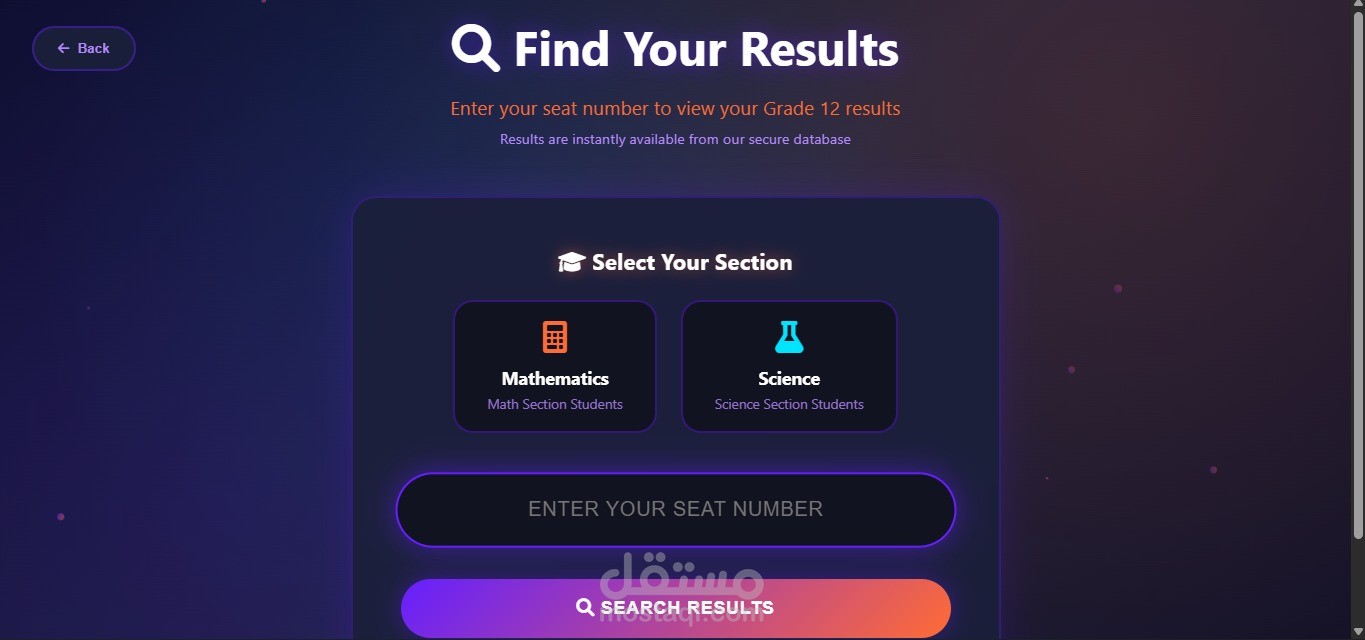 A modern, animated web portal for Grade 12 STEM students to search and view their academic results. Features a sleek dark-themed interface with smooth page transitions, real-time search functionality, and PDF download capability.