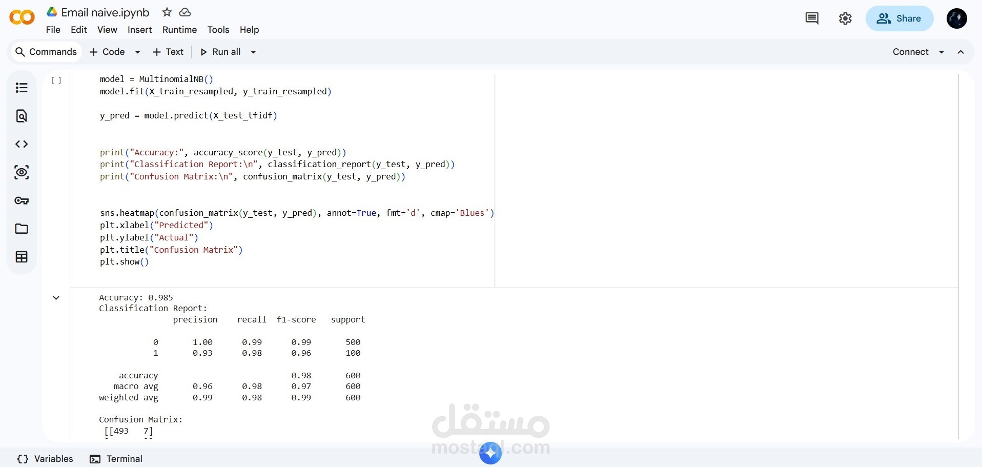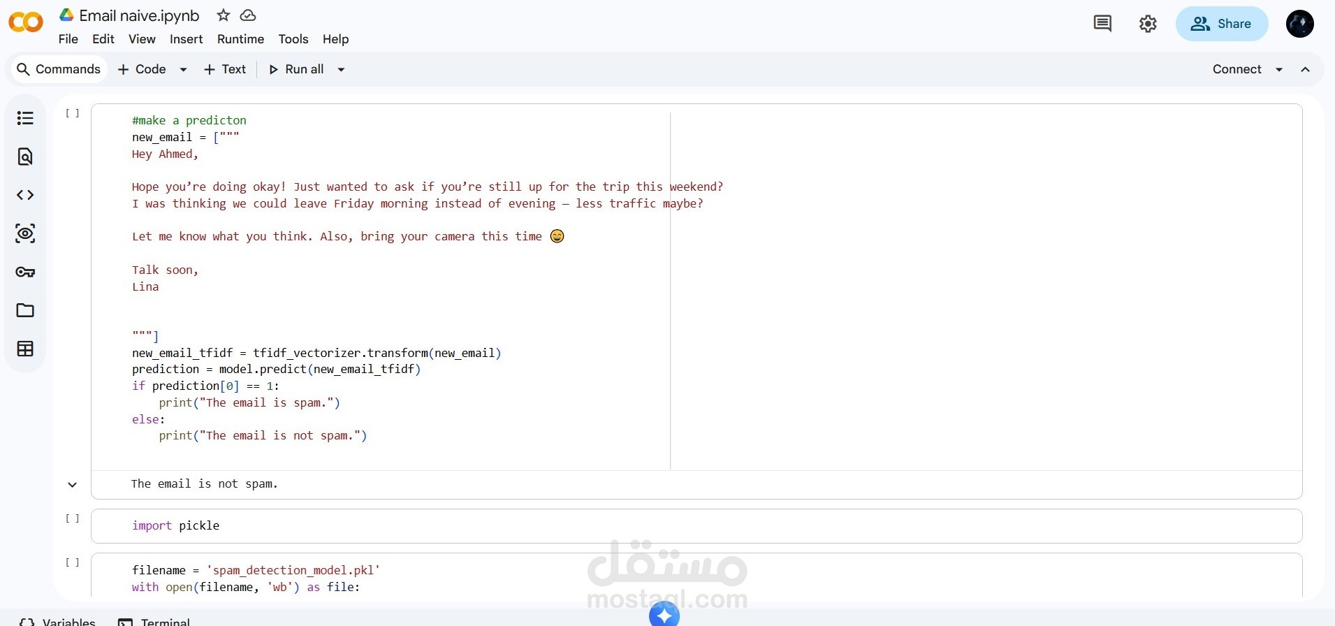 تم اختبار عدة نماذج واختيار الأفضل بناءً على مقاييس التقييم مثل Accuracy و Precision و Recall، مع التركيز بشكل خاص على تقليل نسبة الرسائل العادية التي يتم تصنيفها بالخطأ كرسائل مزعجة (False Positives)، لضمان تجربة استخدام موثوقة.
